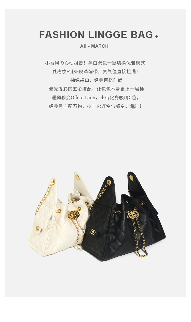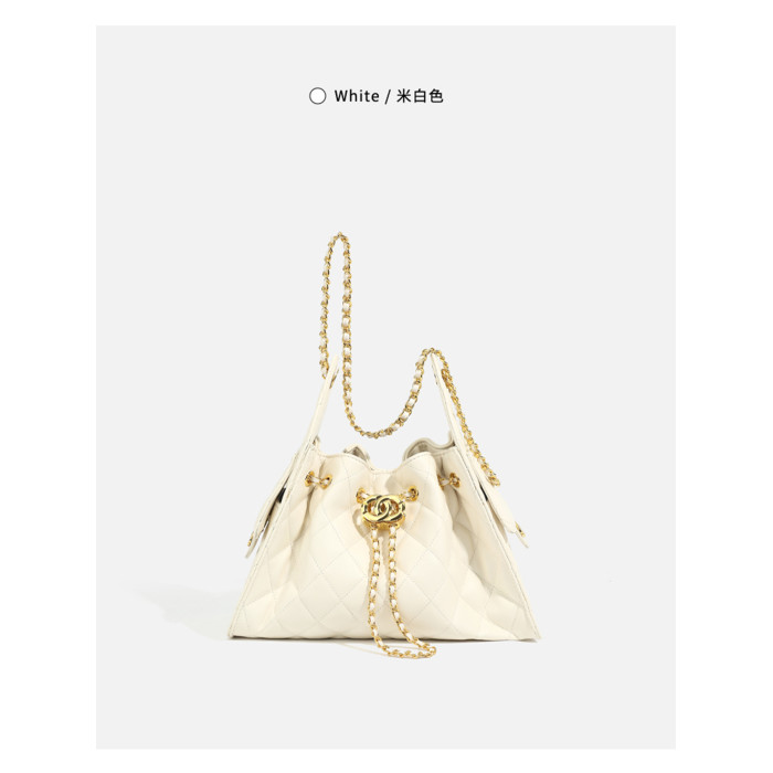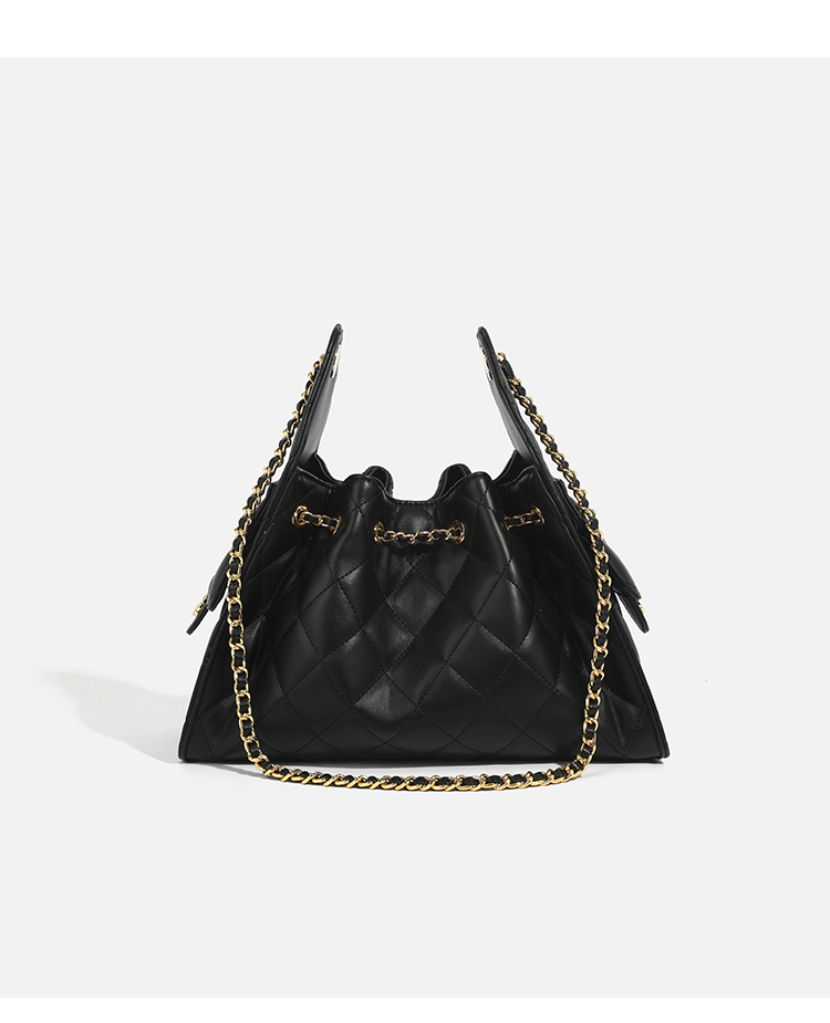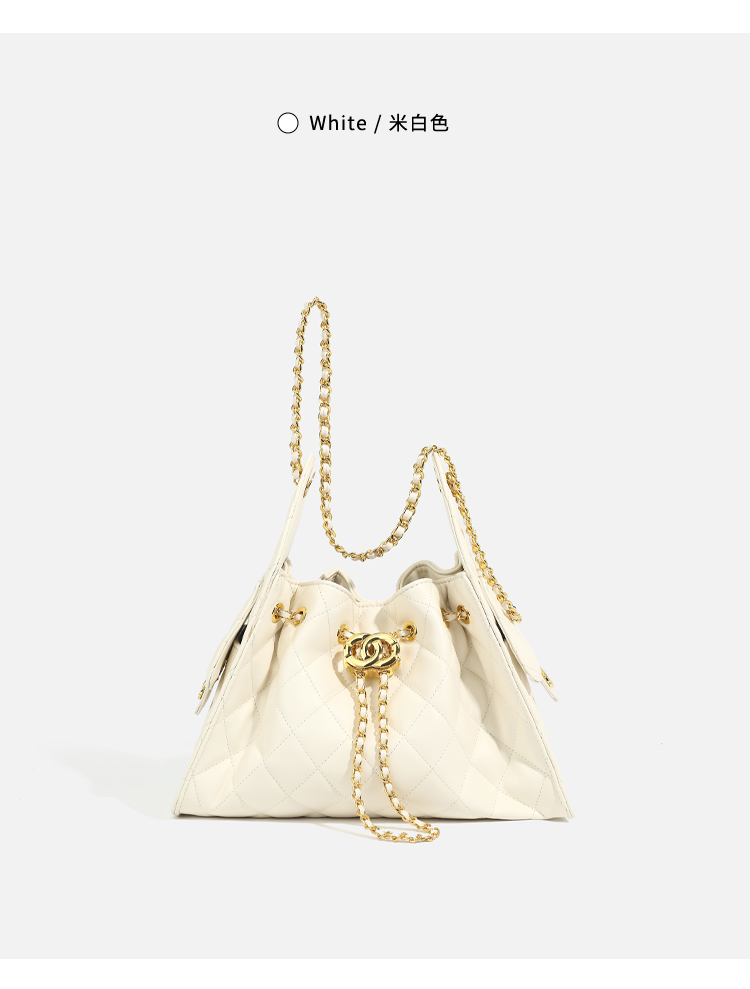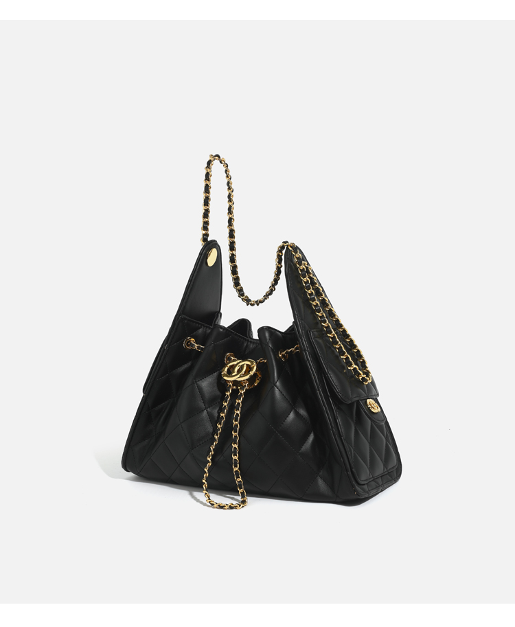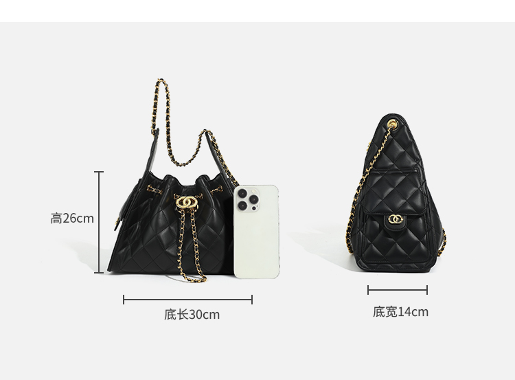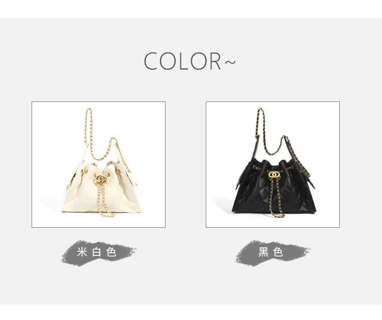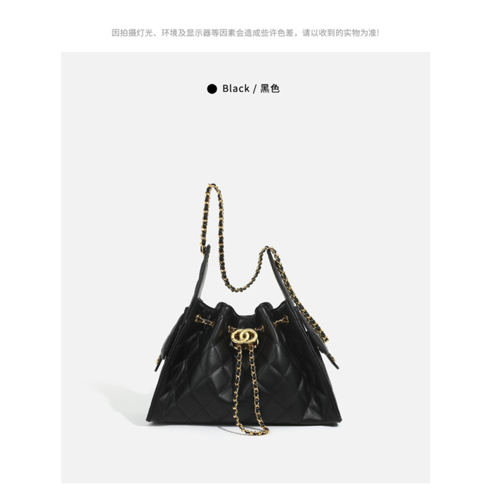 2025新款小香風女包bag黑金牛皮抽繩包hobo腋下包鏈條單肩托特包