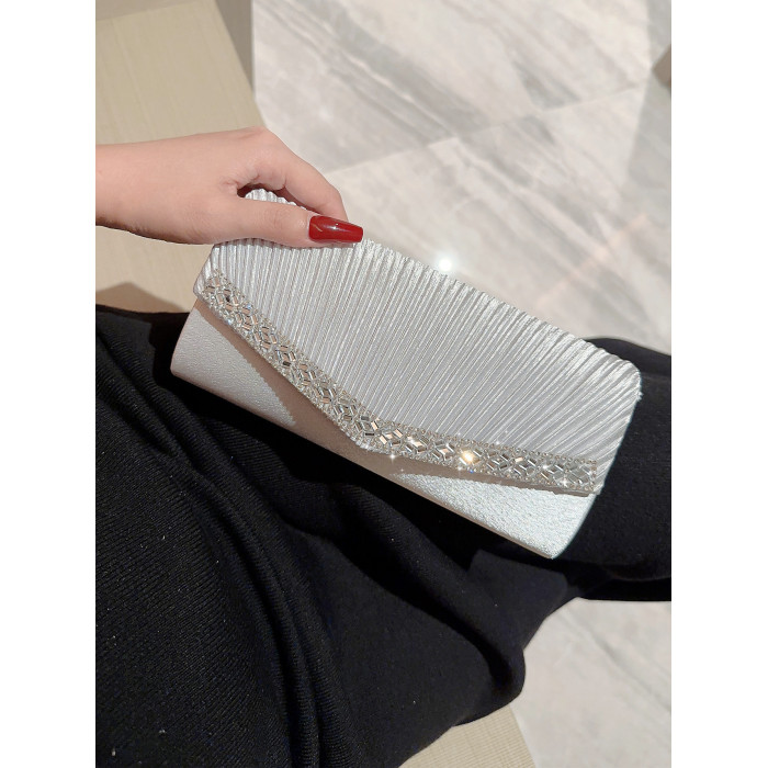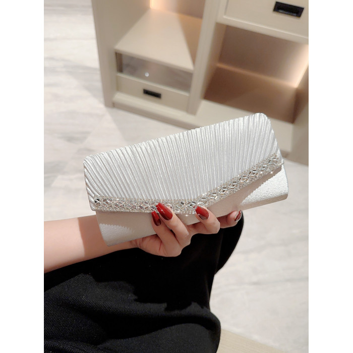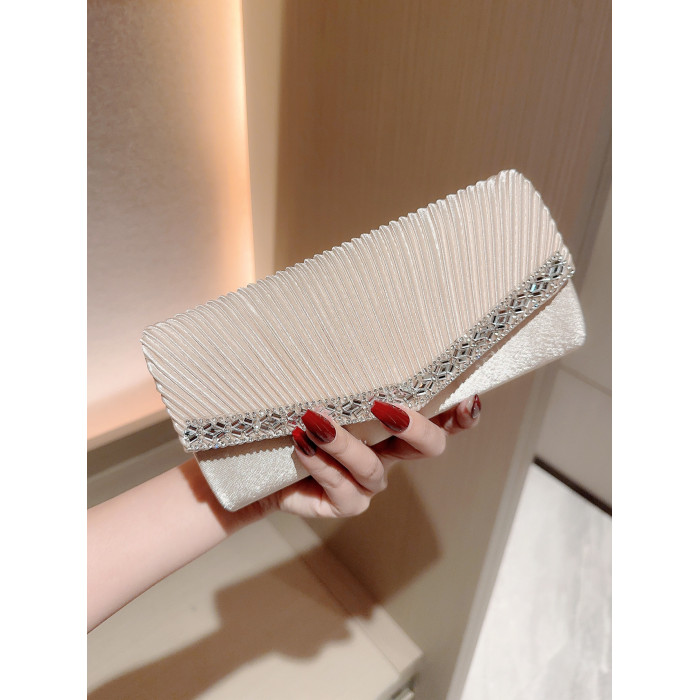 潮牌韓版晚宴包歐美時尚褶皺手拿包搭配水鑽絲絨簡約晚宴斜背女包