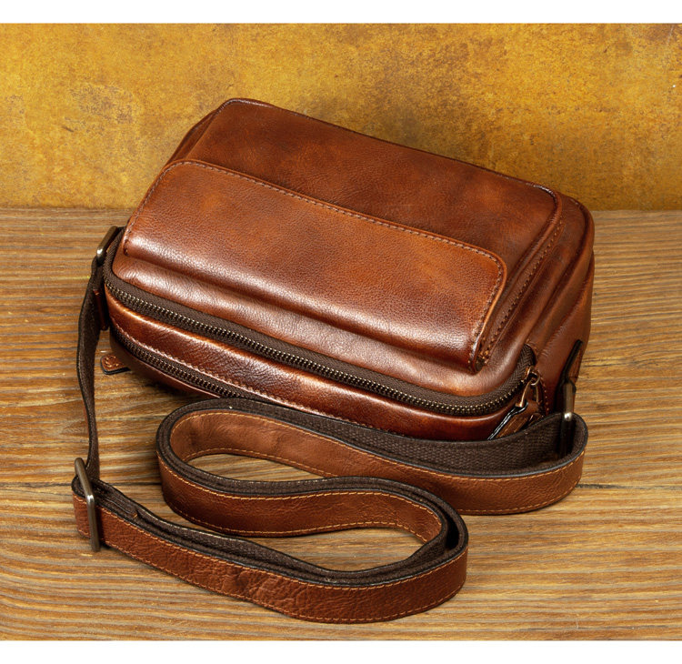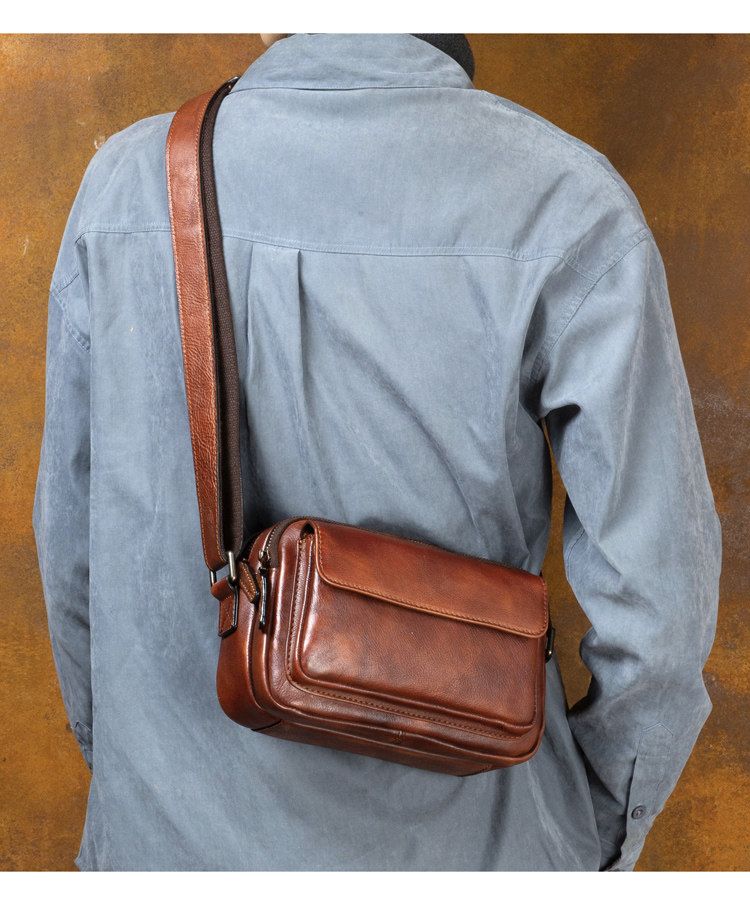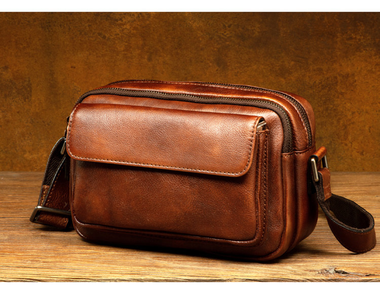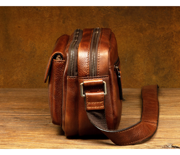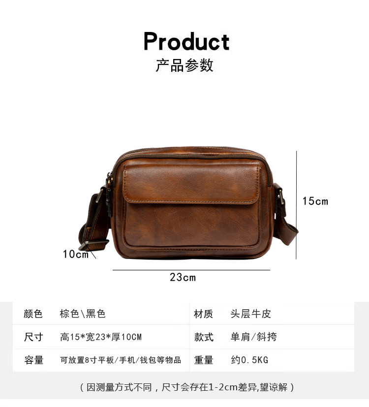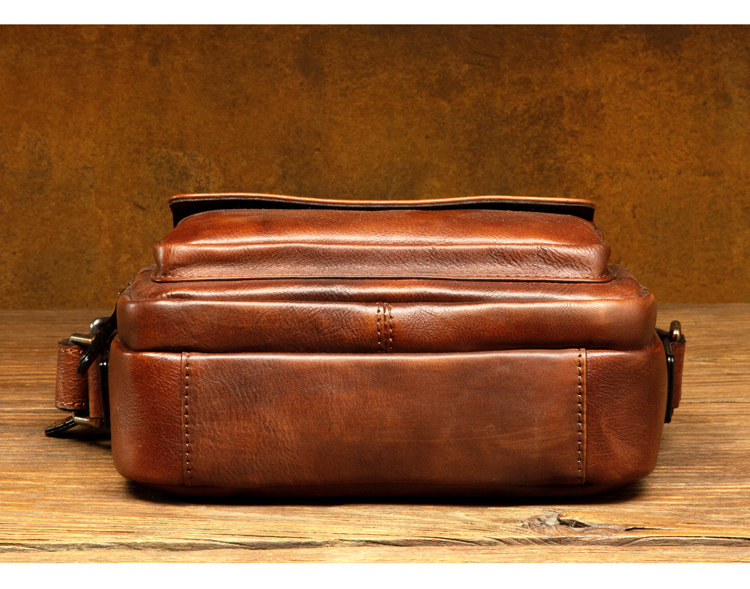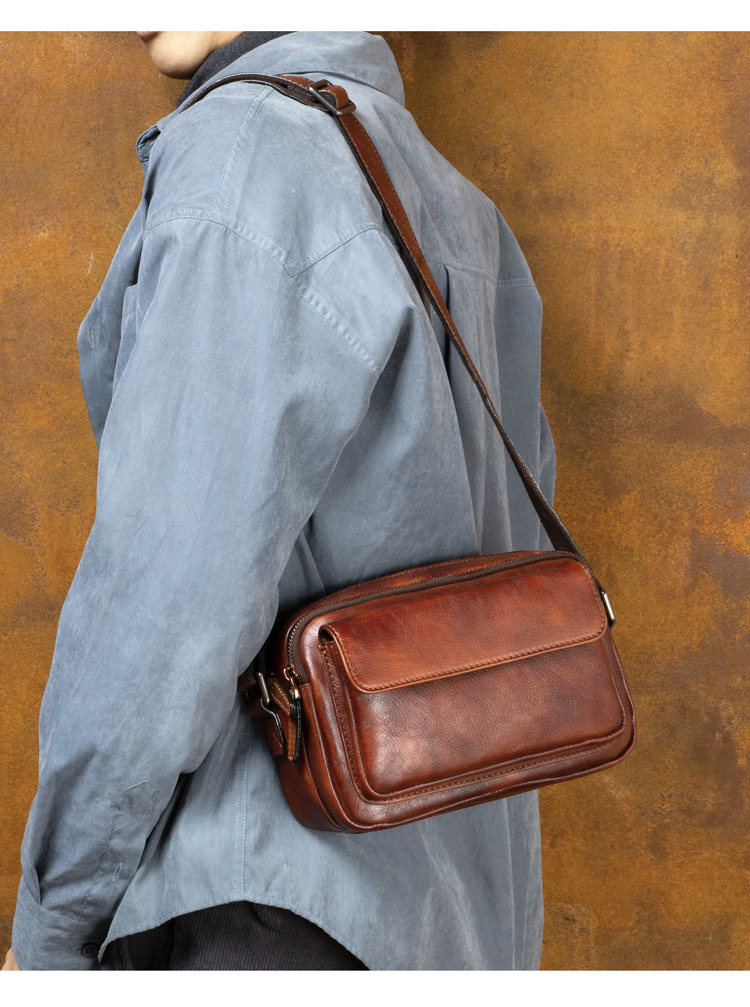 慢時光復古式手工擦色真皮斜背休閒男包頭層植鞣牛皮單肩包小方包