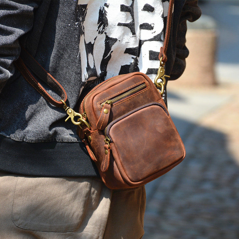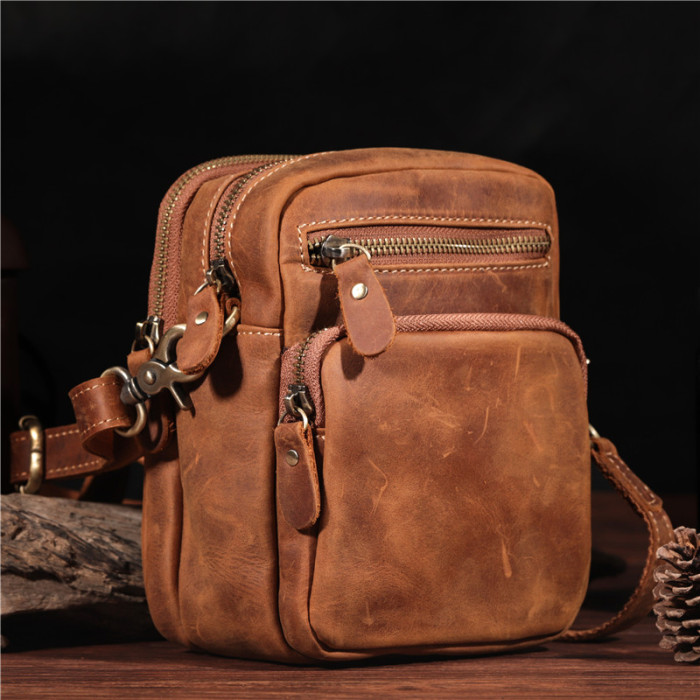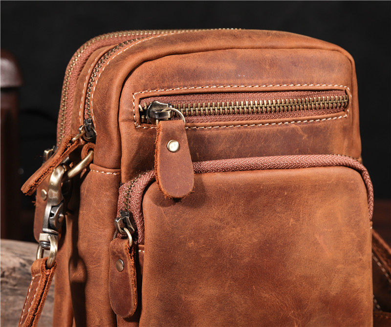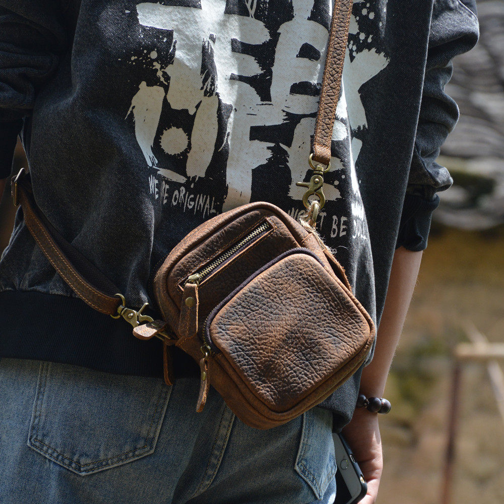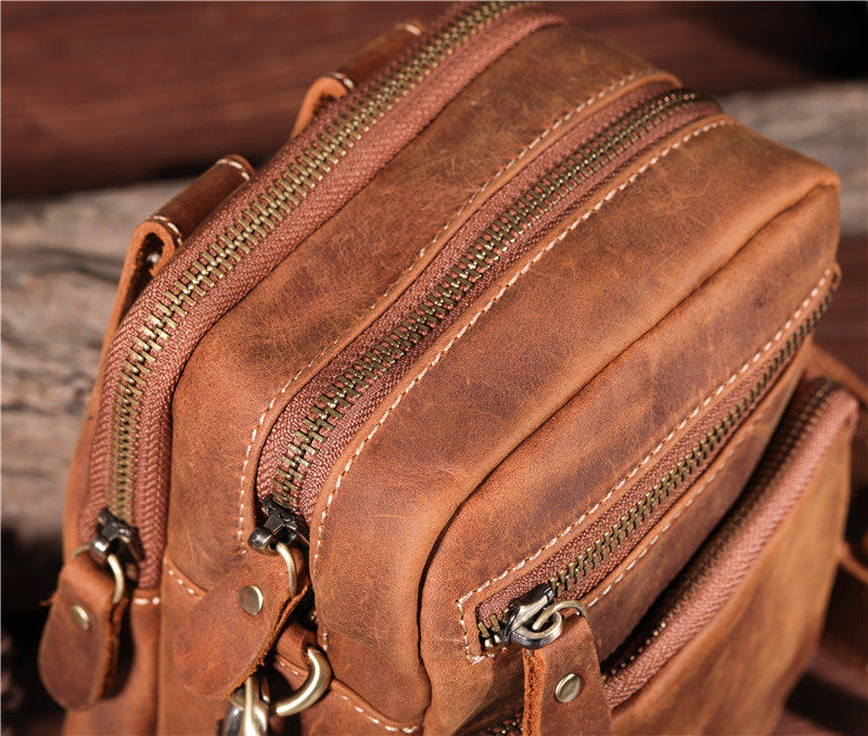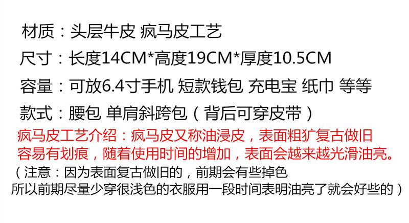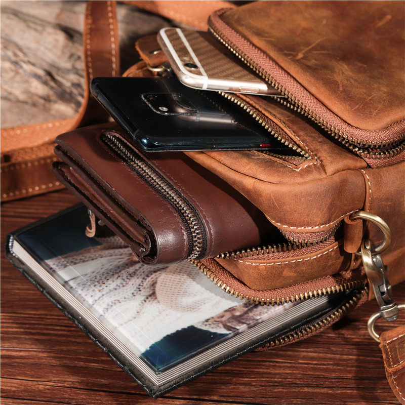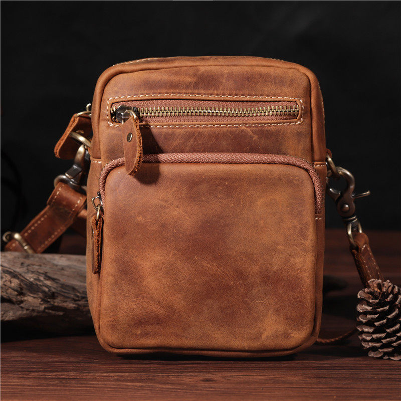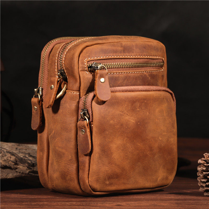原創新款瘋馬皮腰包男多隔層小包真皮復古斜後後背包牛皮手機包運動包