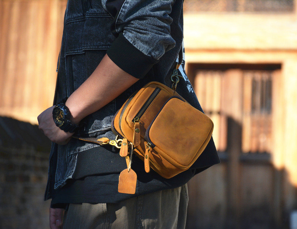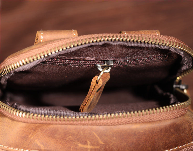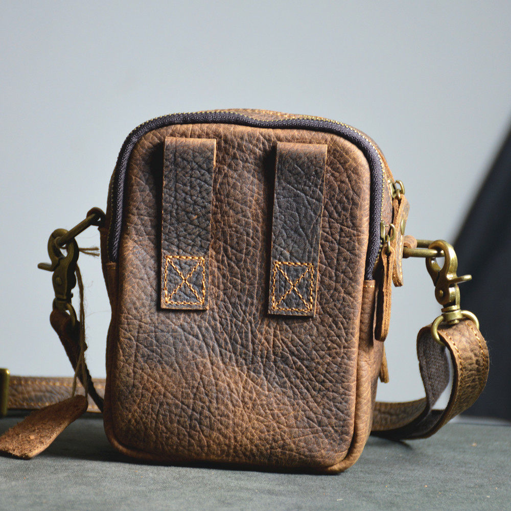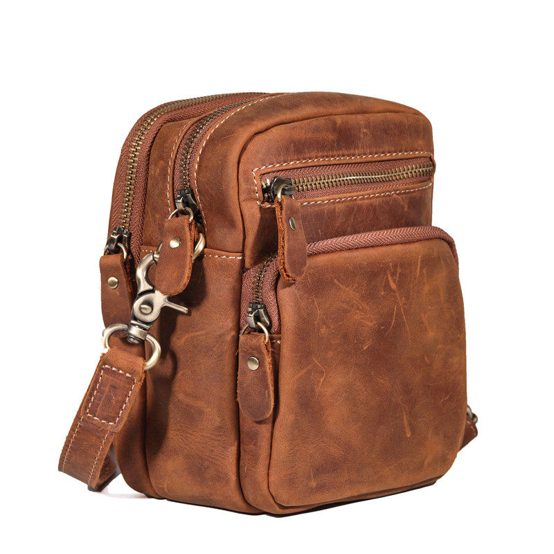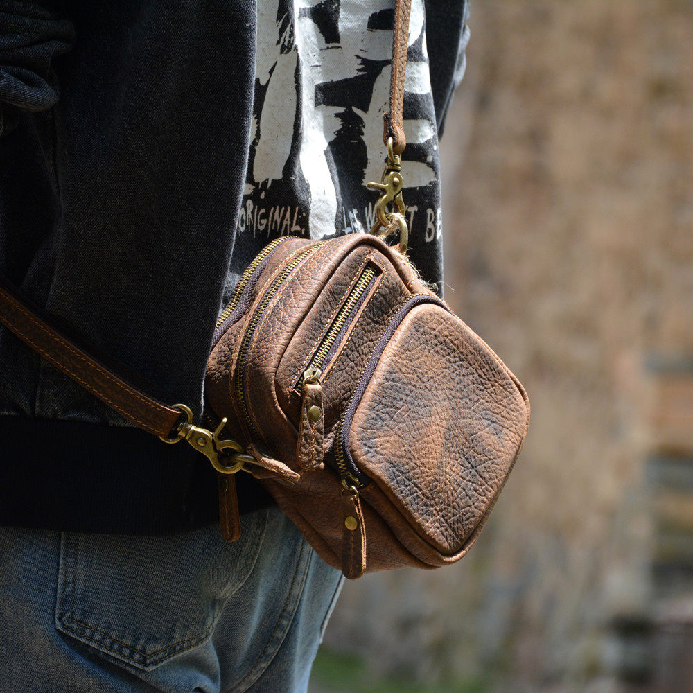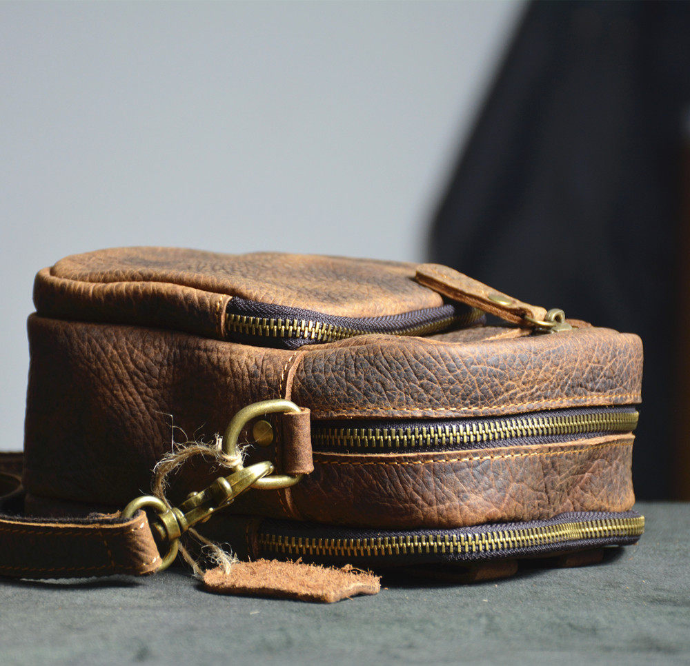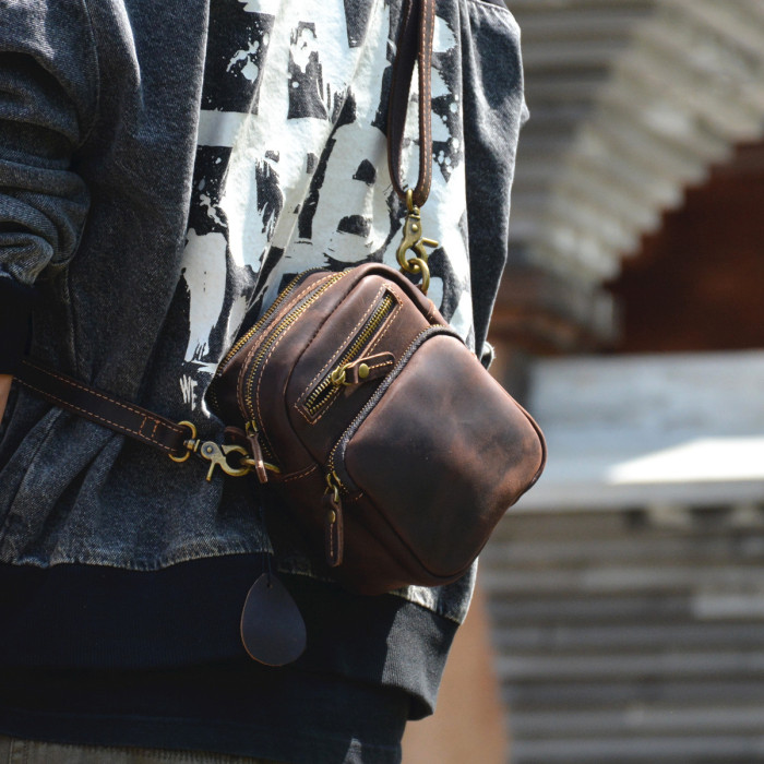 原創新款瘋馬皮腰包男多隔層小包真皮復古斜後後背包牛皮手機包運動包
