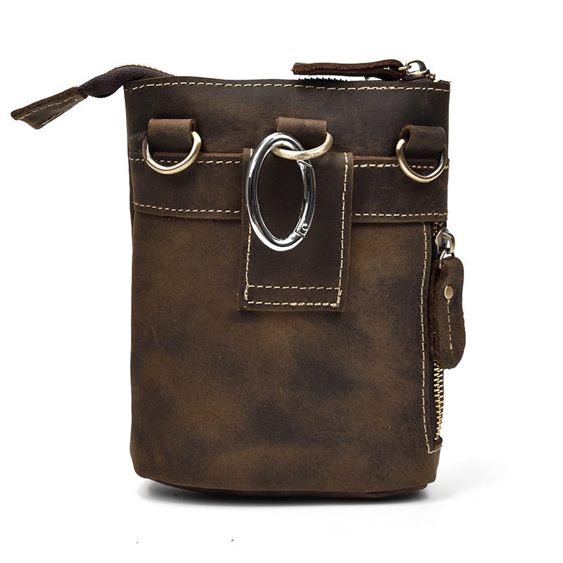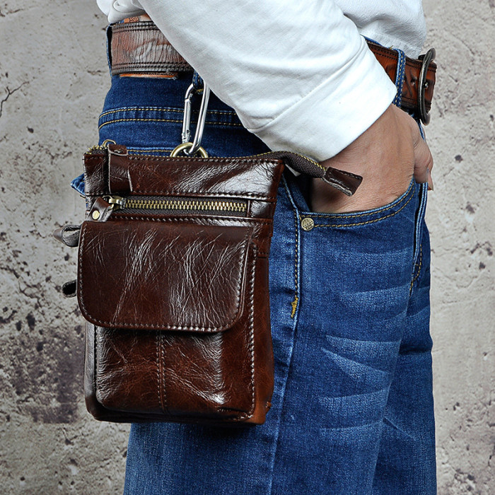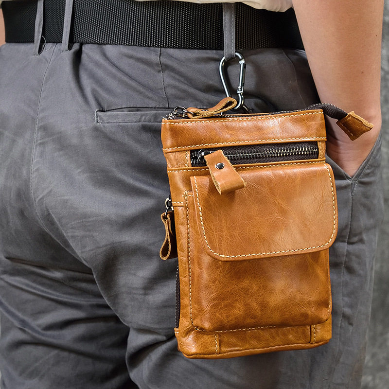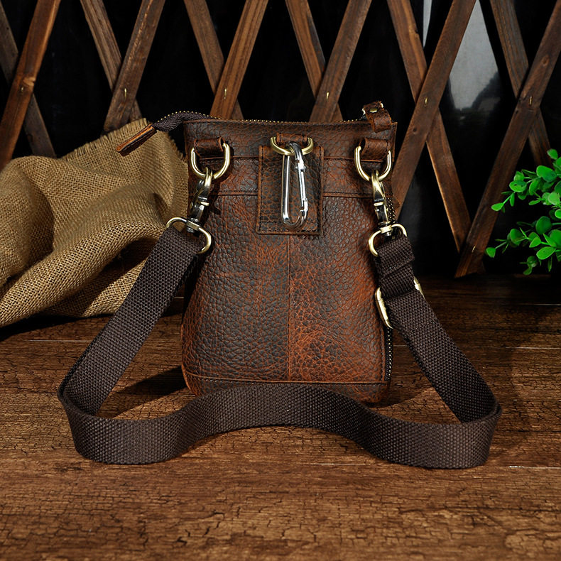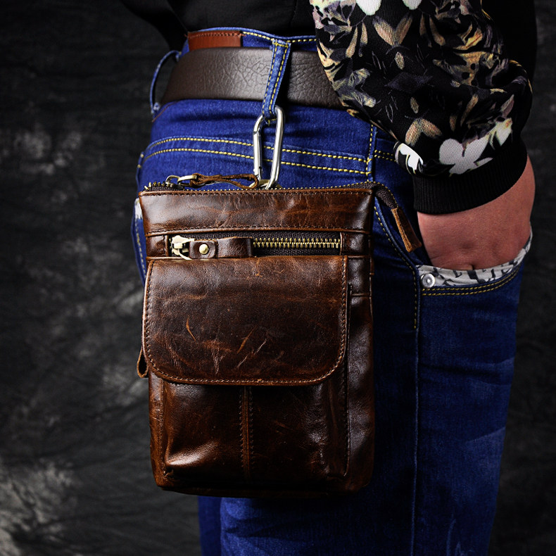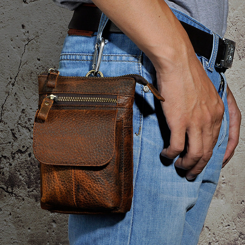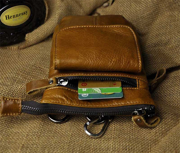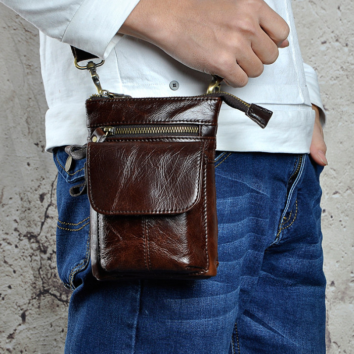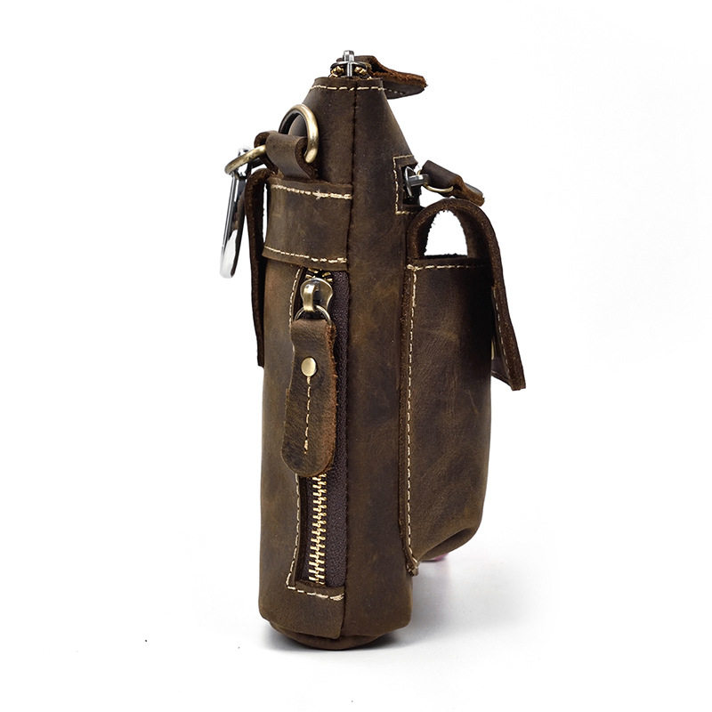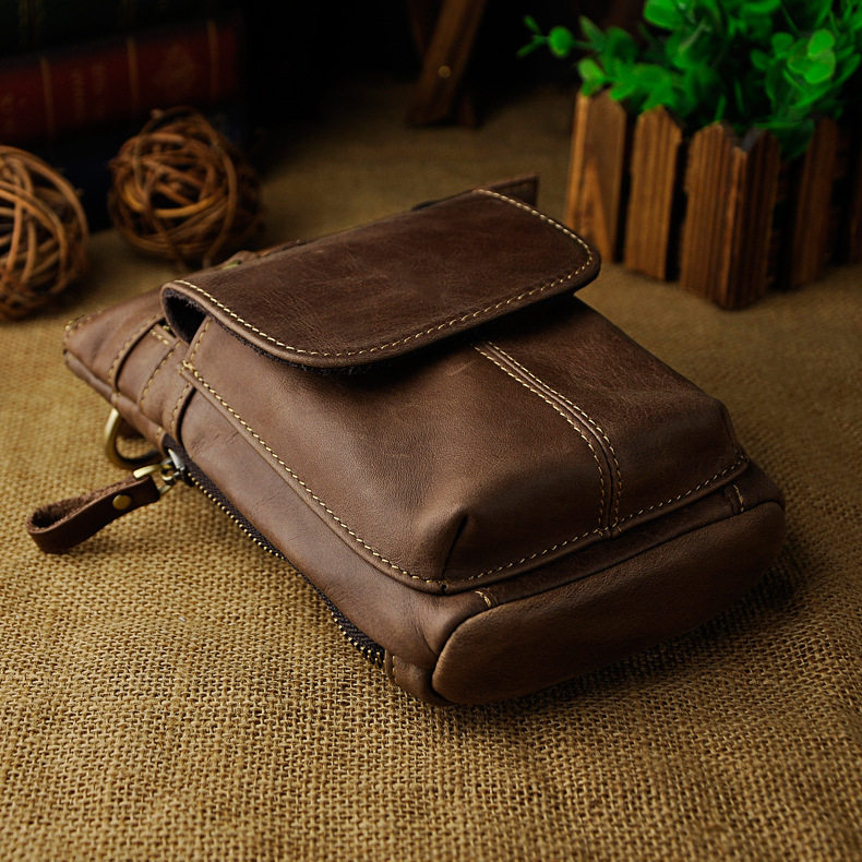 真皮男士復古手機戶外7寸帶掛鉤小腰包油蠟皮穿皮帶腰包單肩斜背