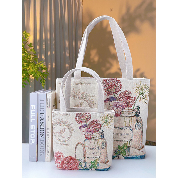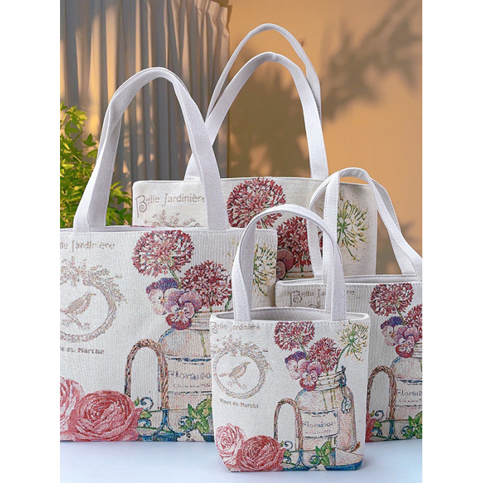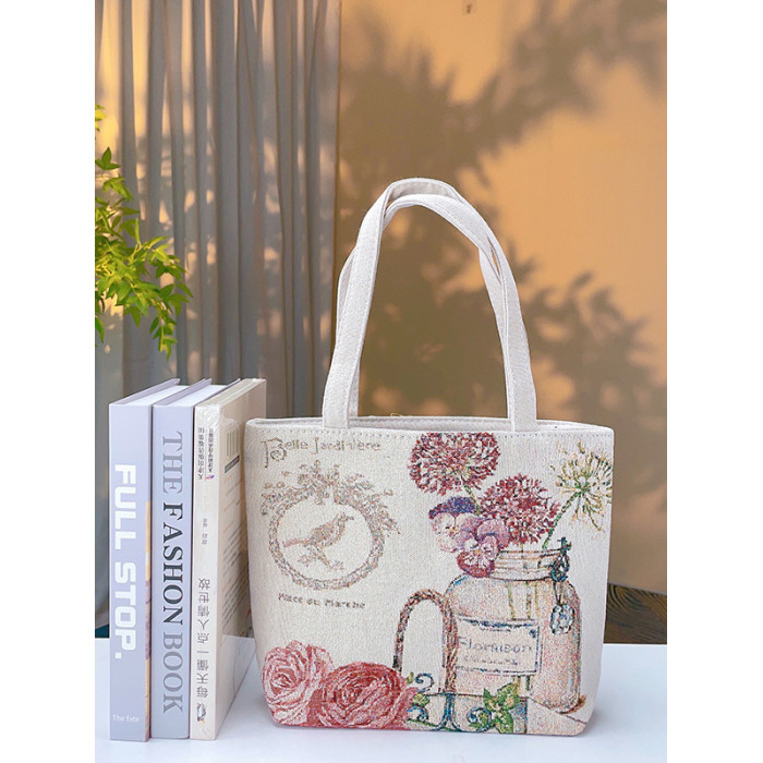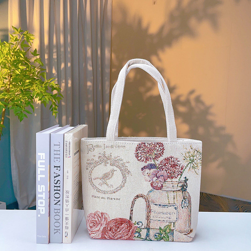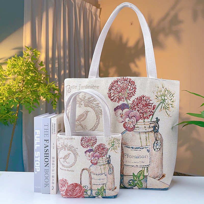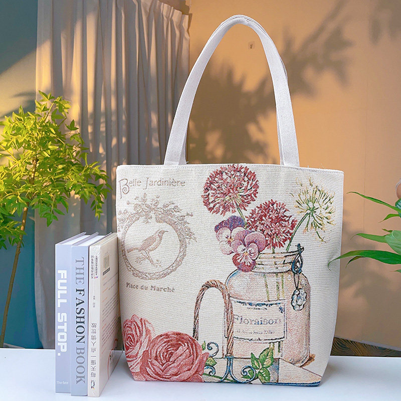 瓶中花雙面金絲提花刺綉帆布手提包單肩包休閒文藝學生上班通勤包