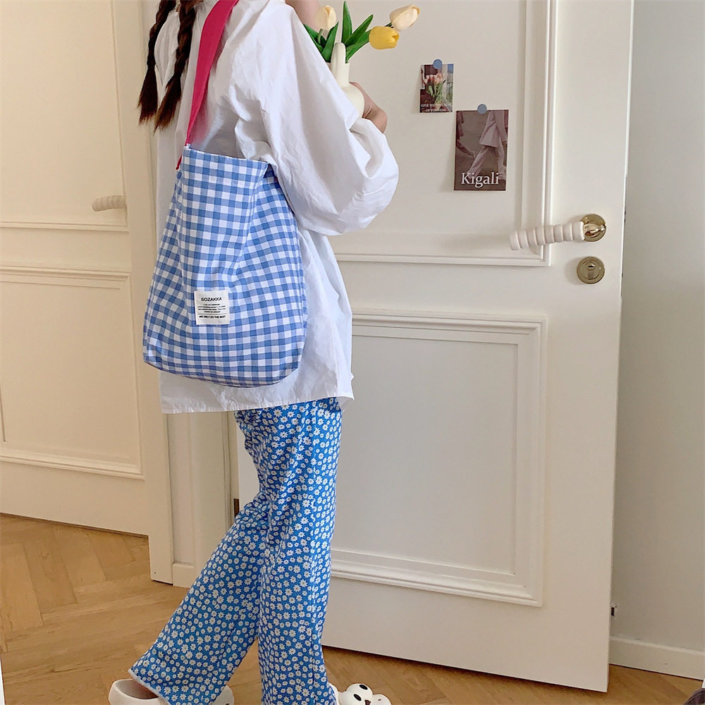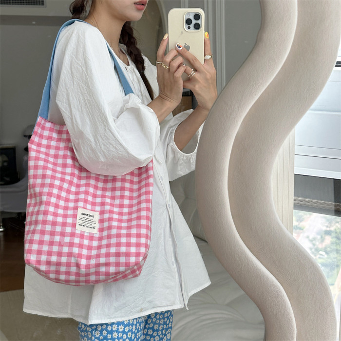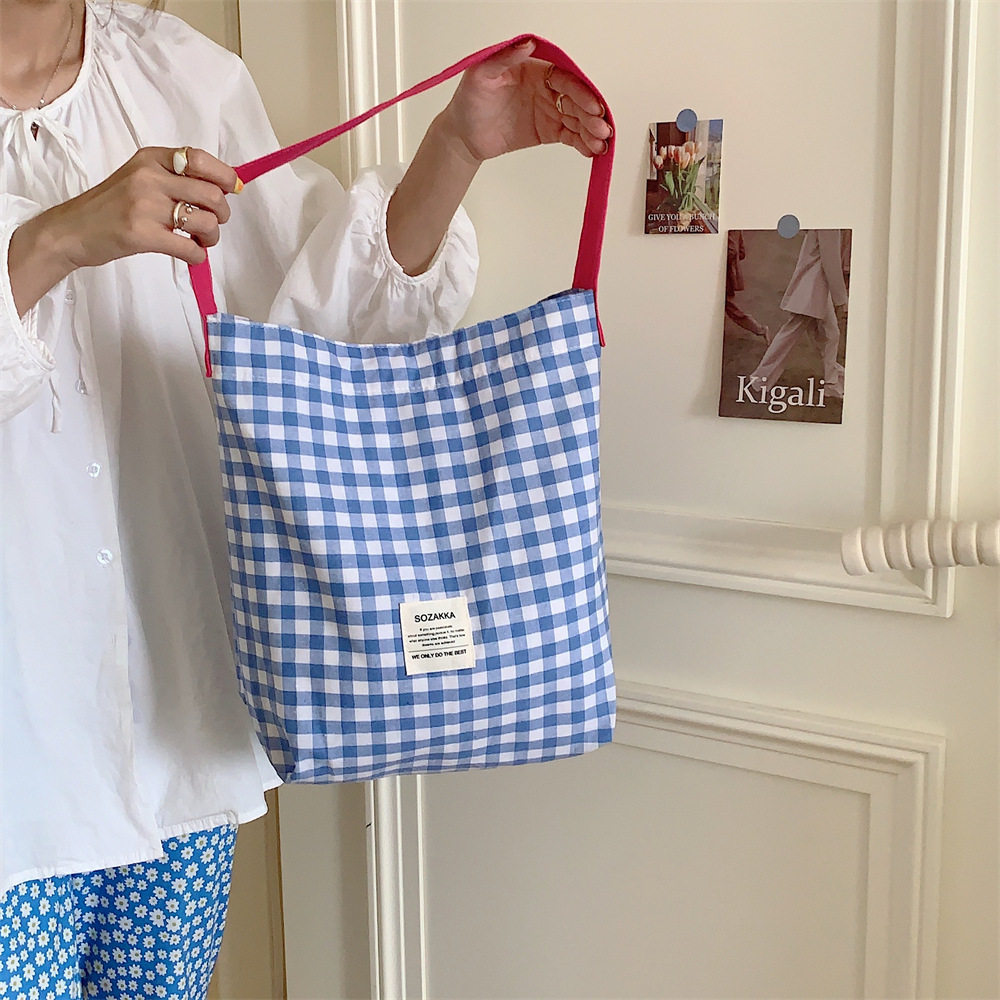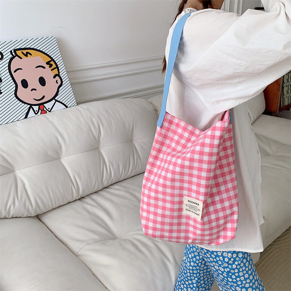 自製韓國ins多巴胺配色格子棉布袋日系學生文藝帆布包百搭單肩包