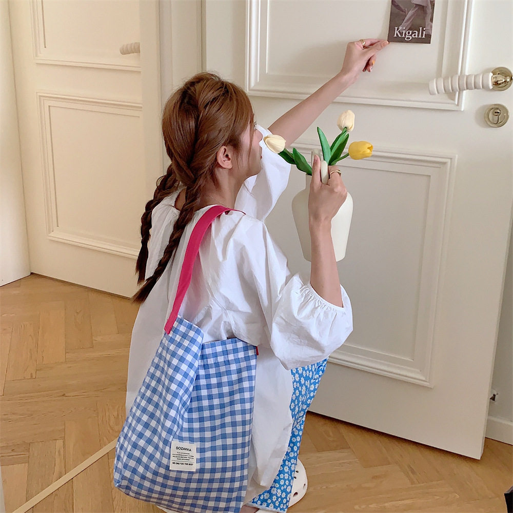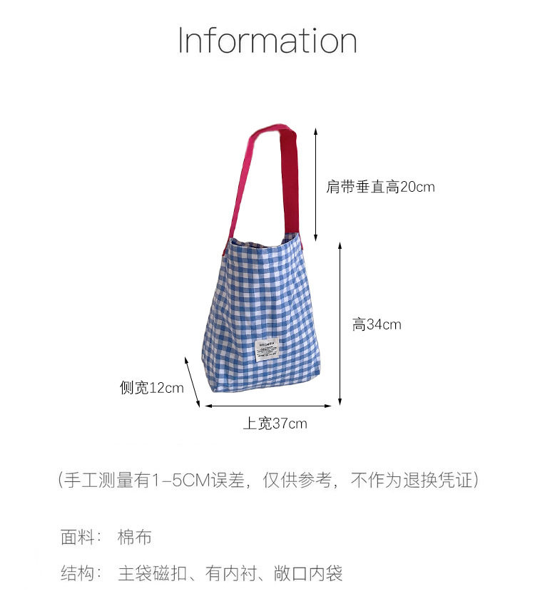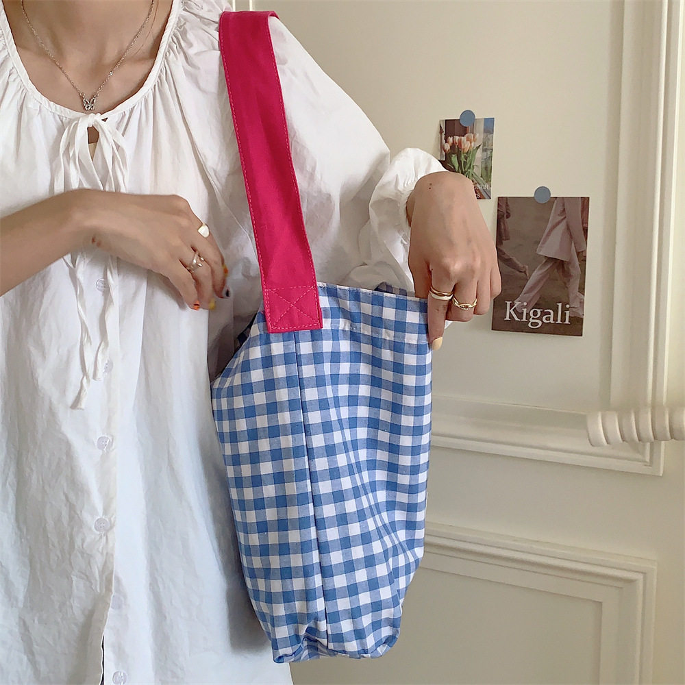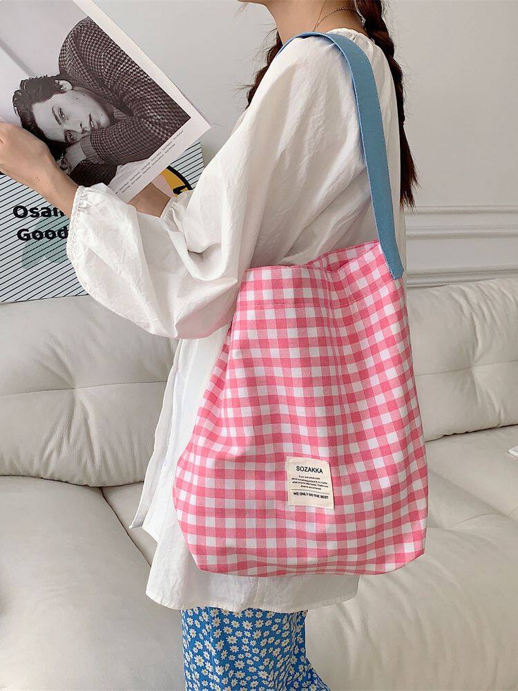 自製韓國ins多巴胺配色格子棉布袋日系學生文藝帆布包百搭單肩包