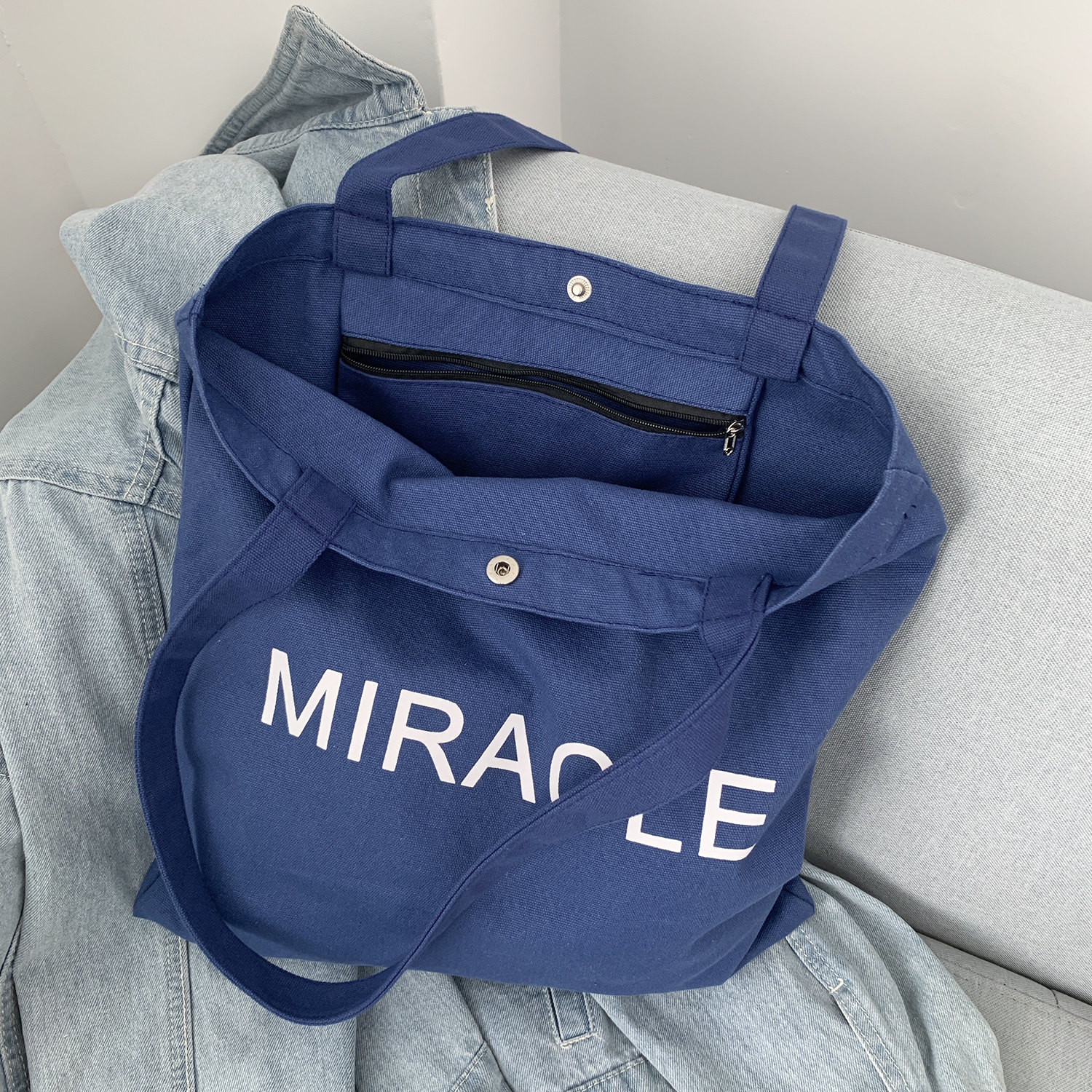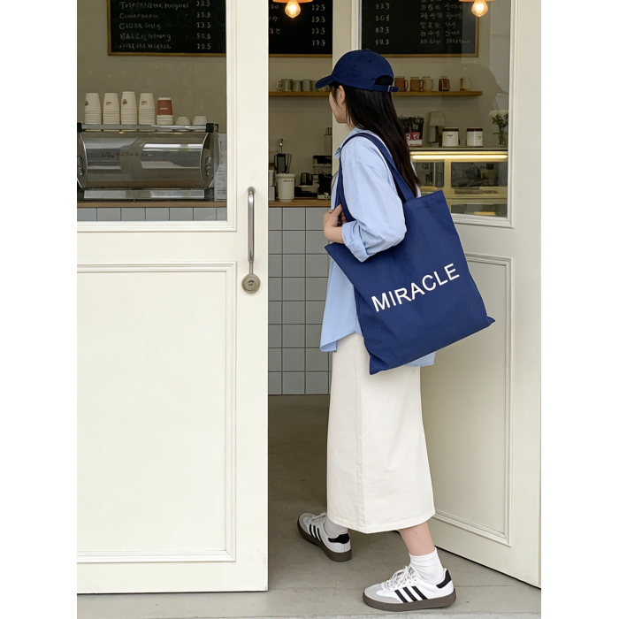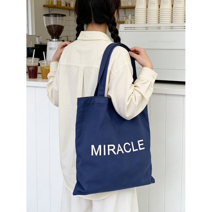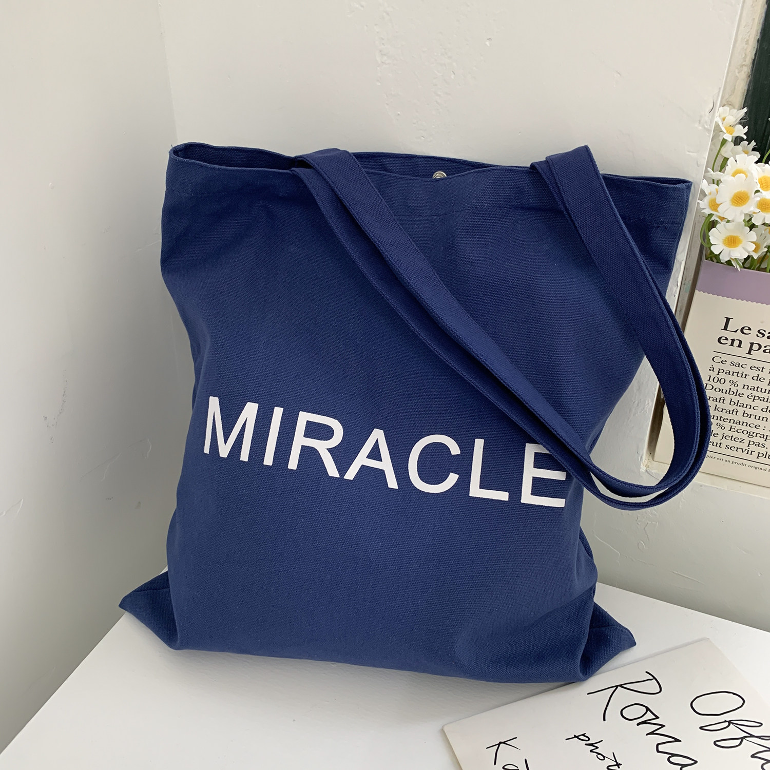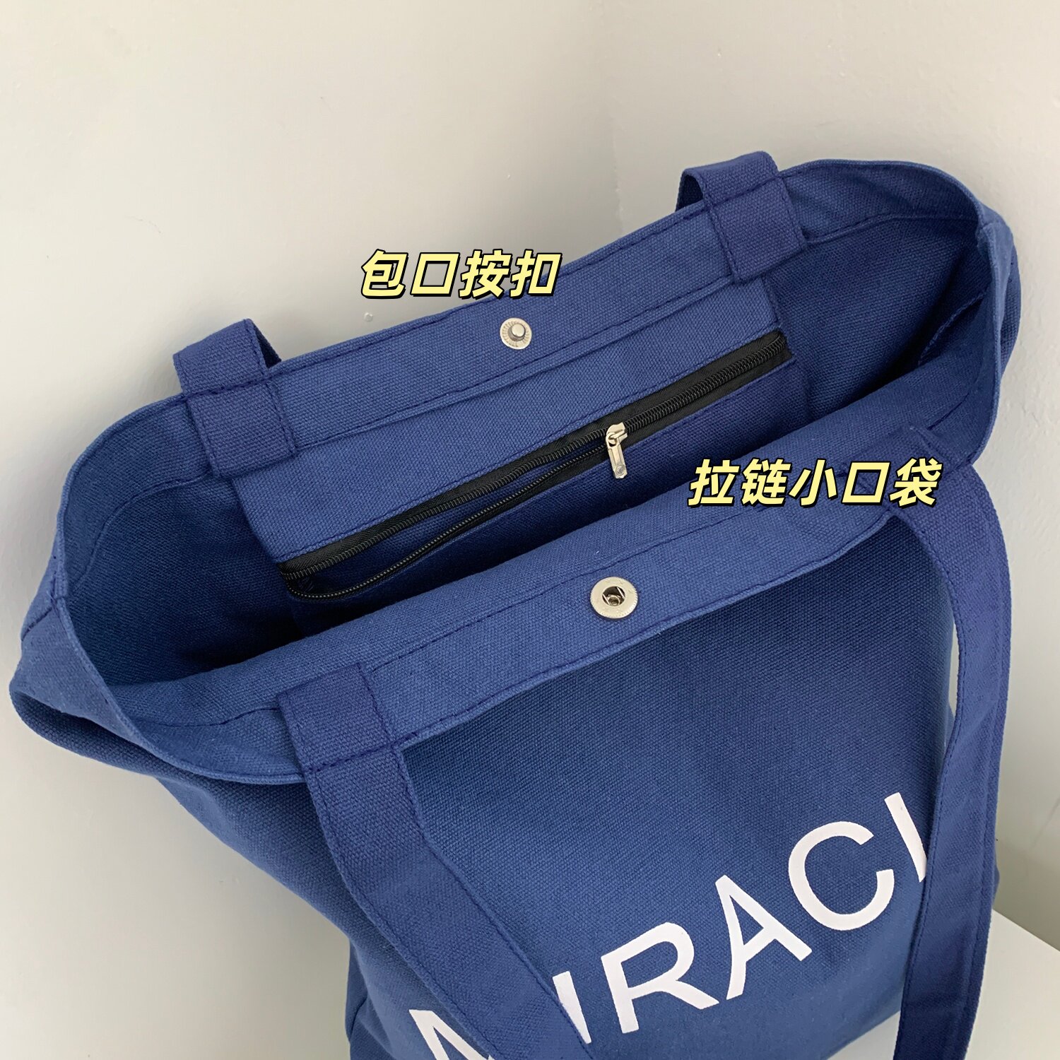 藏藍色字母帆布包女大容量單肩包手提托特包通勤包學生補習裝書包