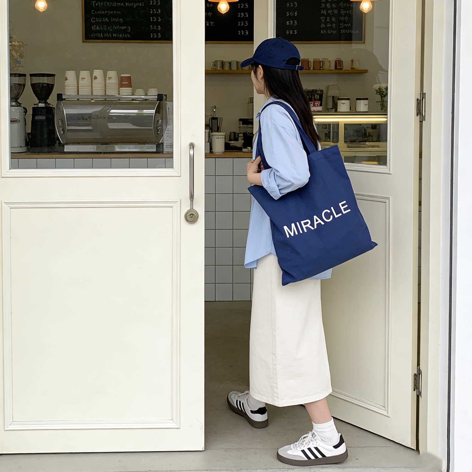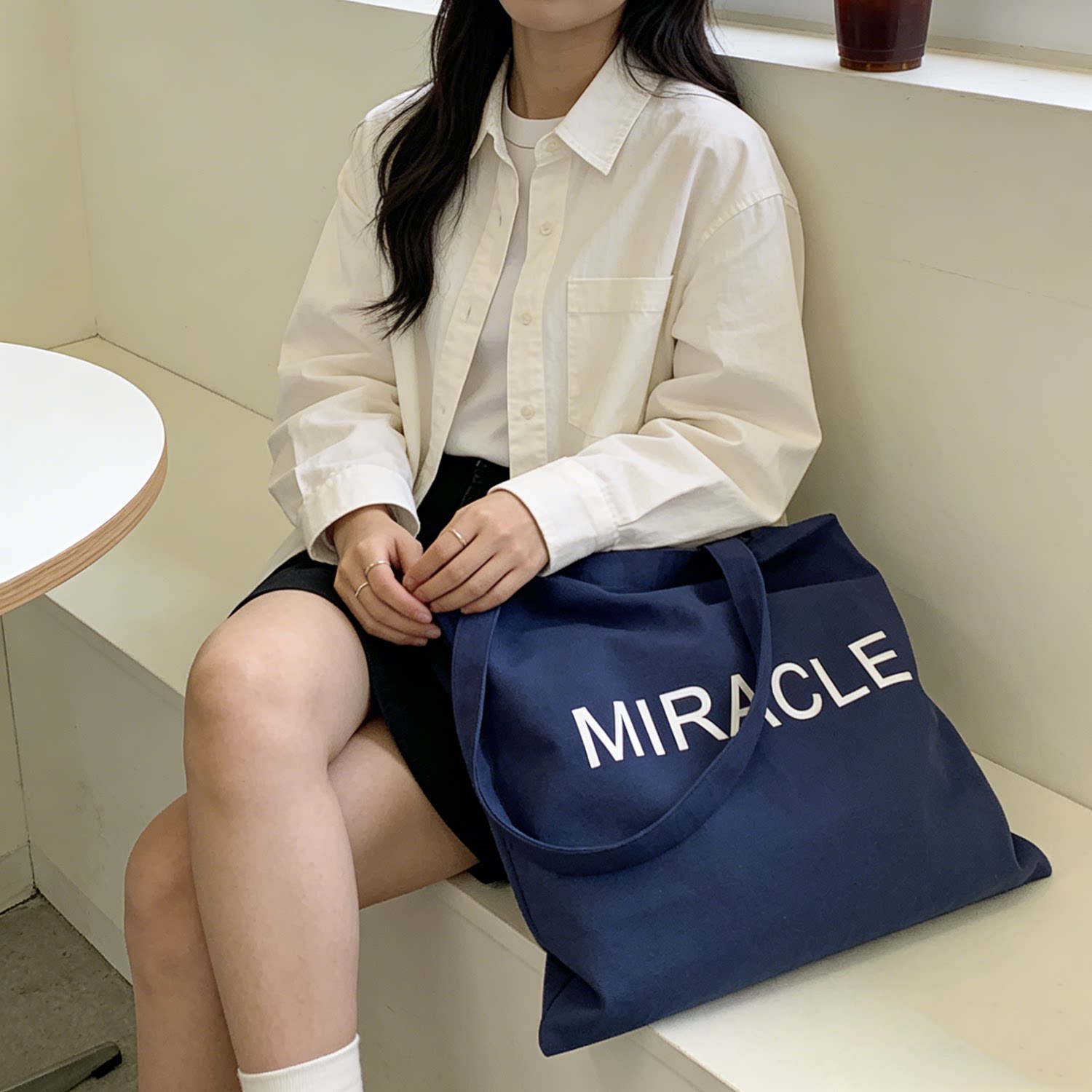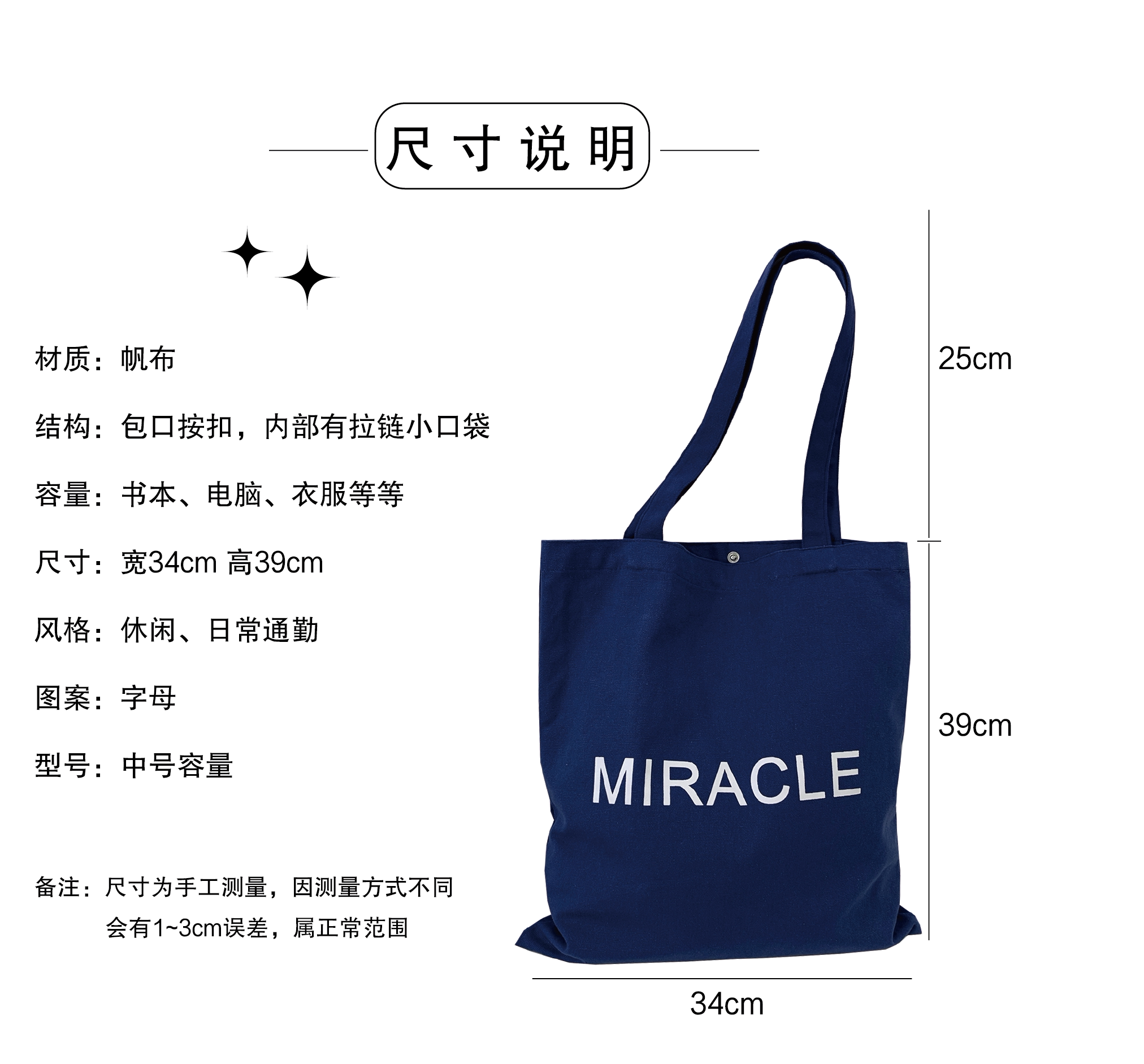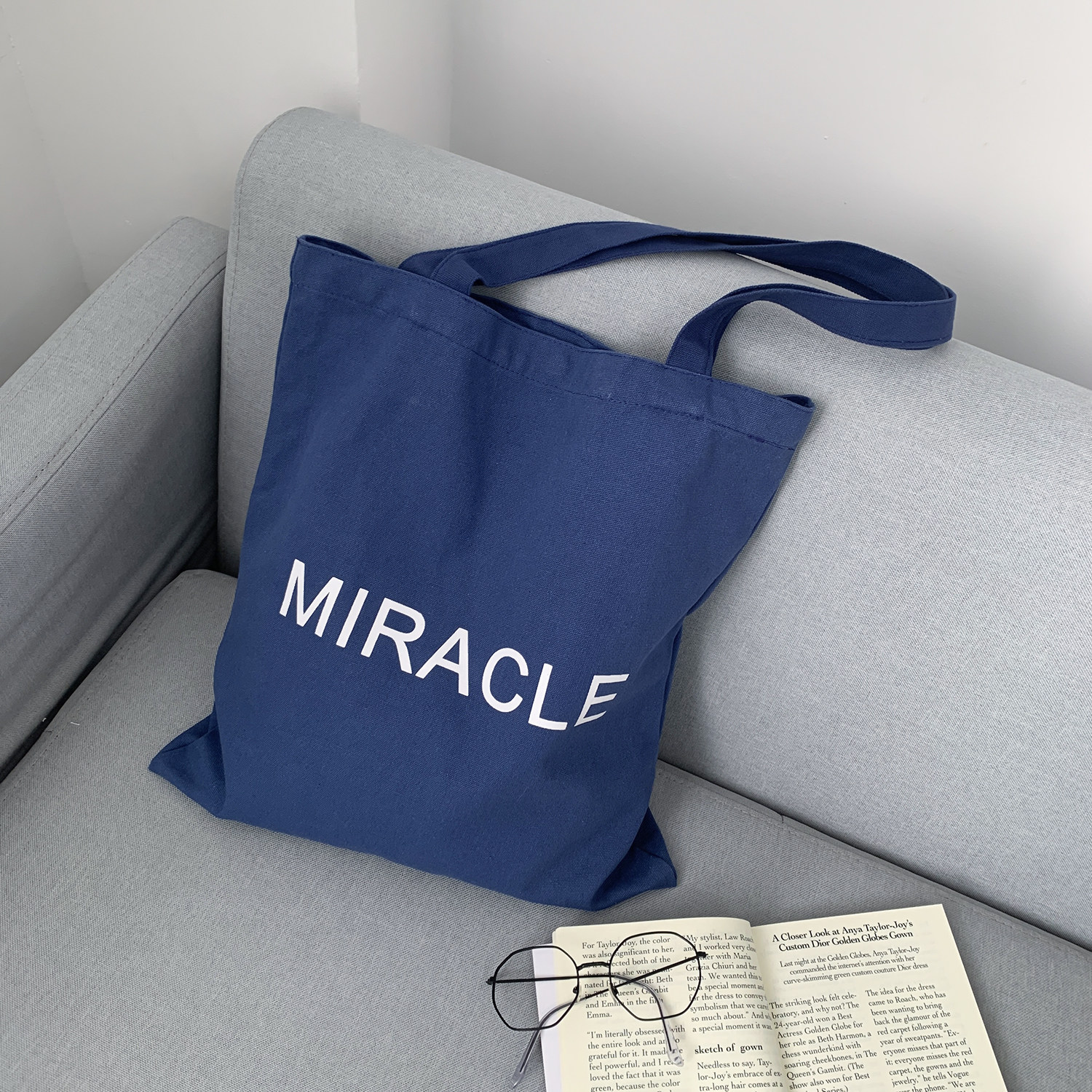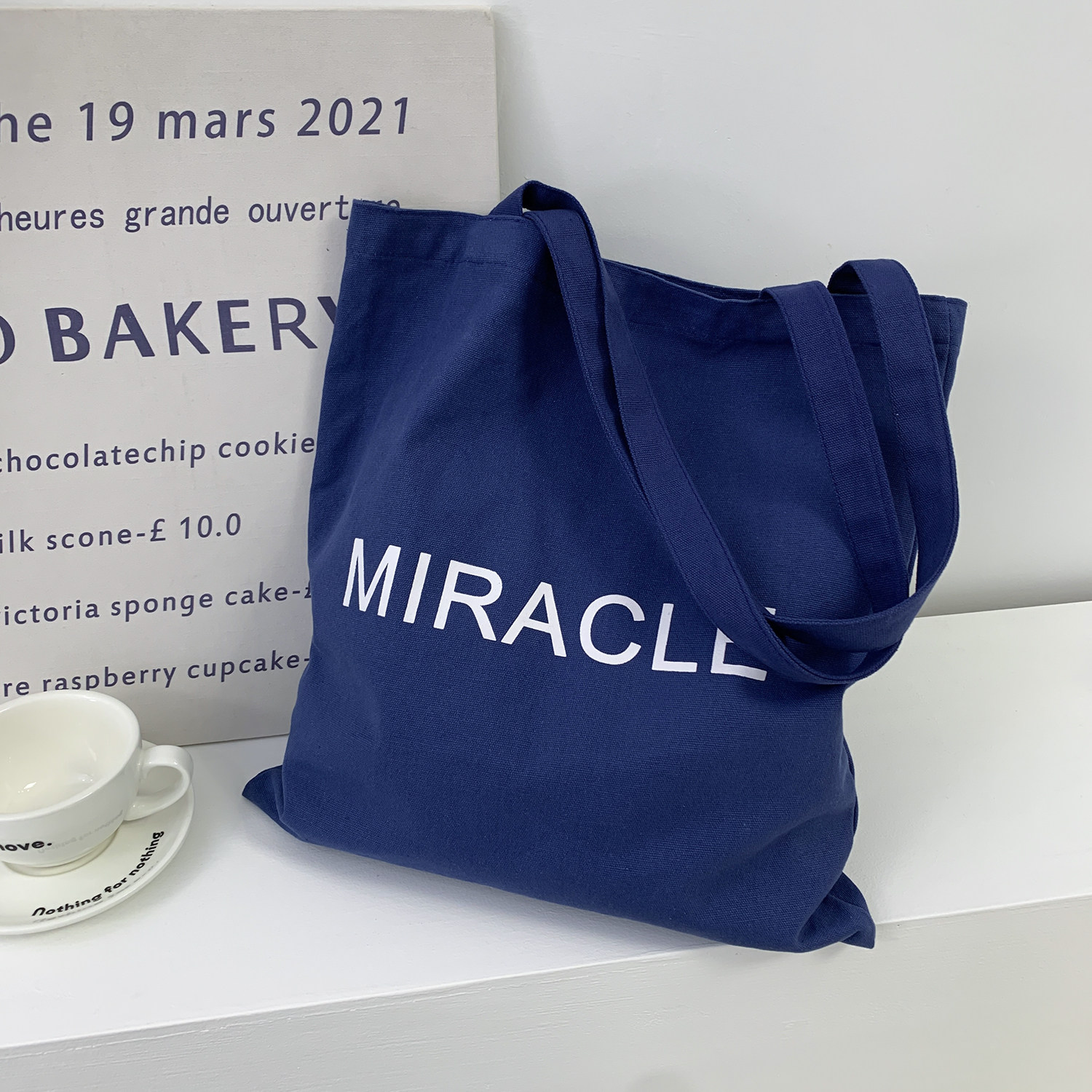 藏藍色字母帆布包女大容量單肩包手提托特包通勤包學生補習裝書包