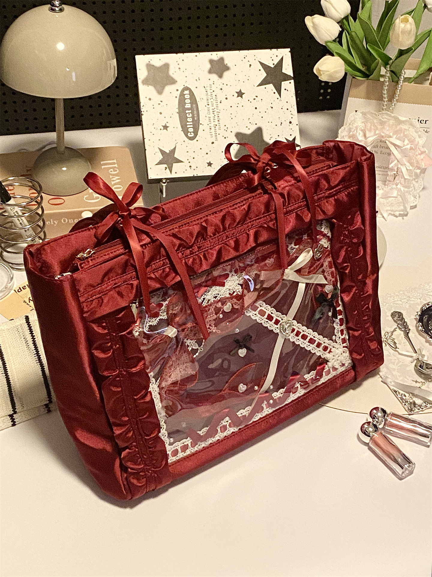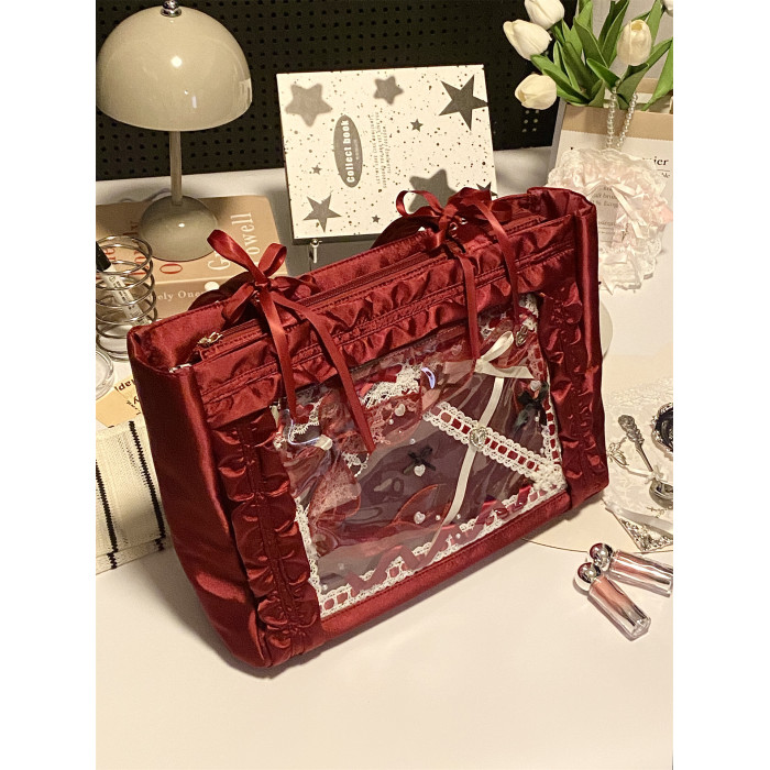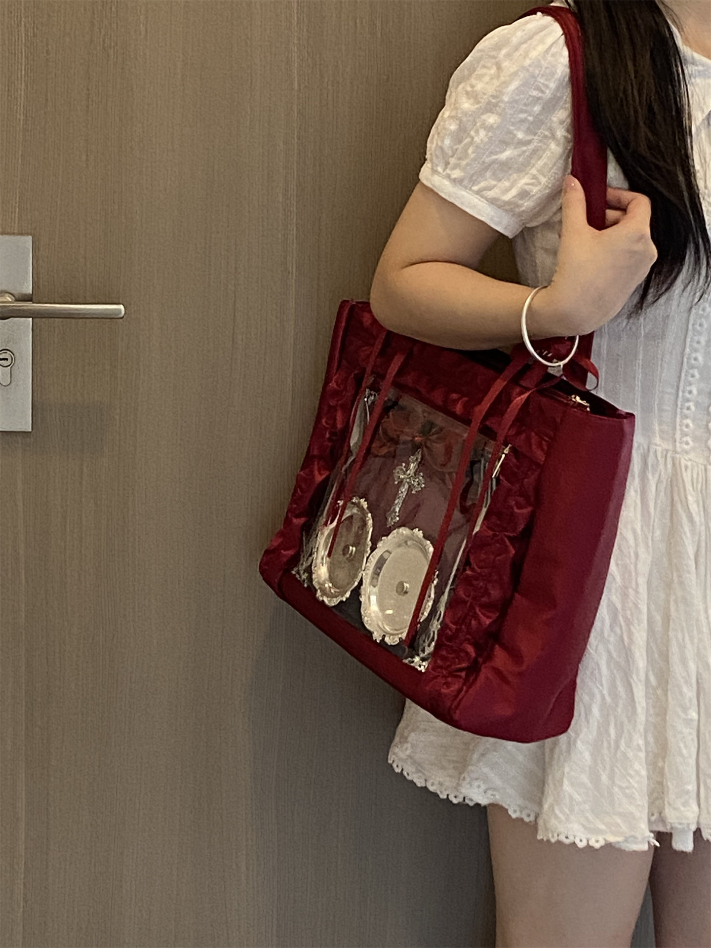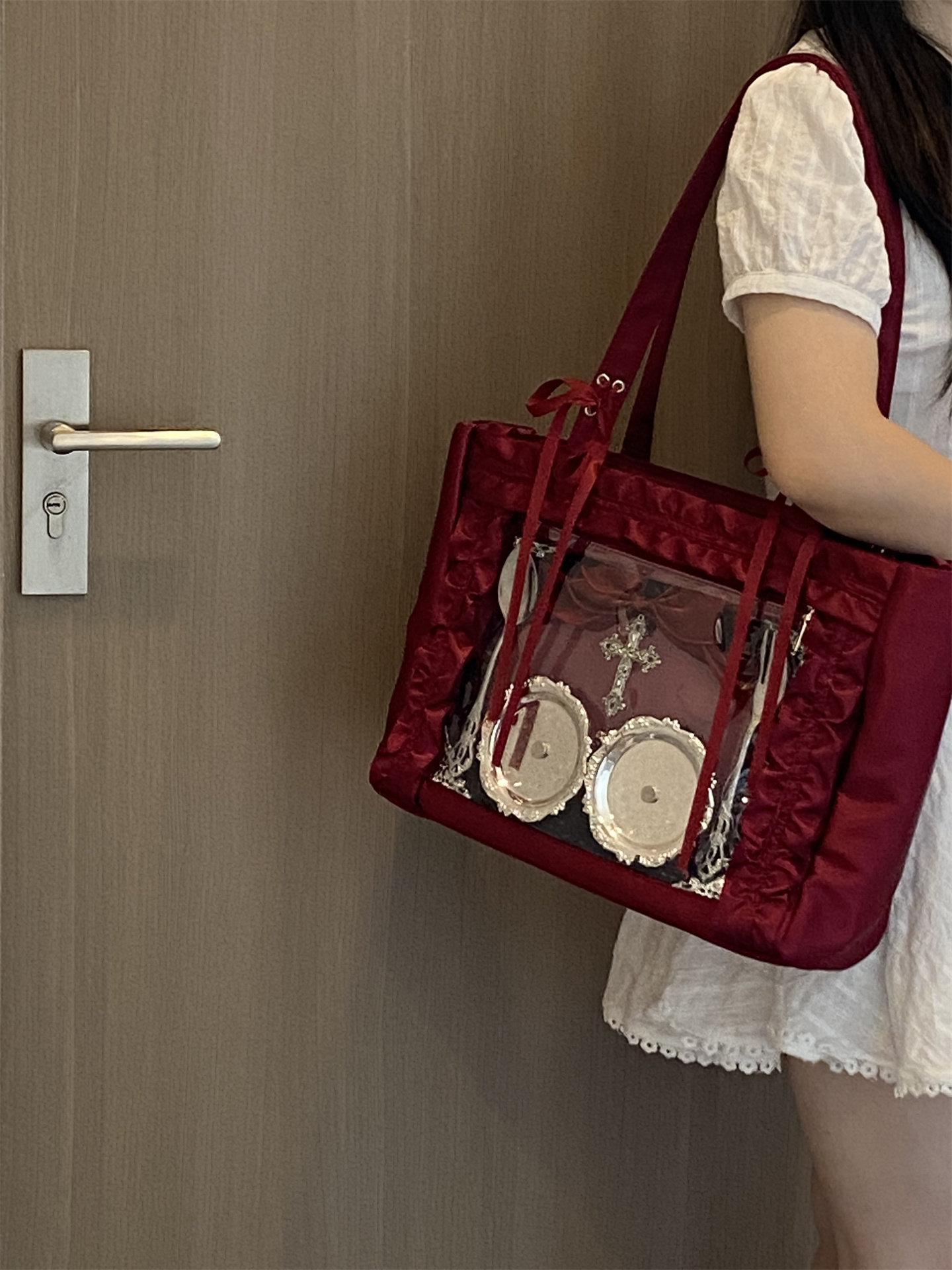 錢一波痛包|暗紅色花邊緞面痛大容量單肩包托特包大食量華麗吧唧