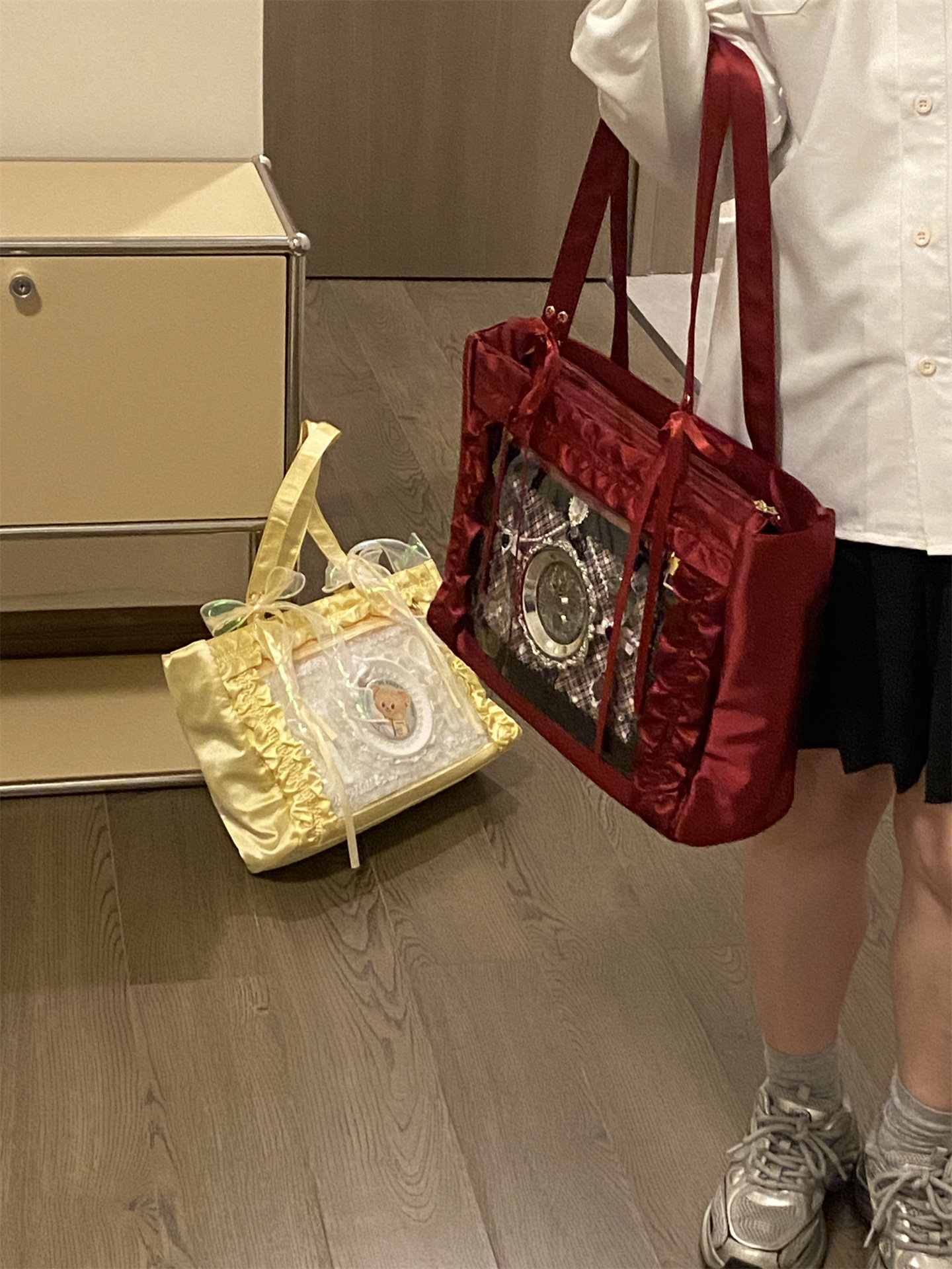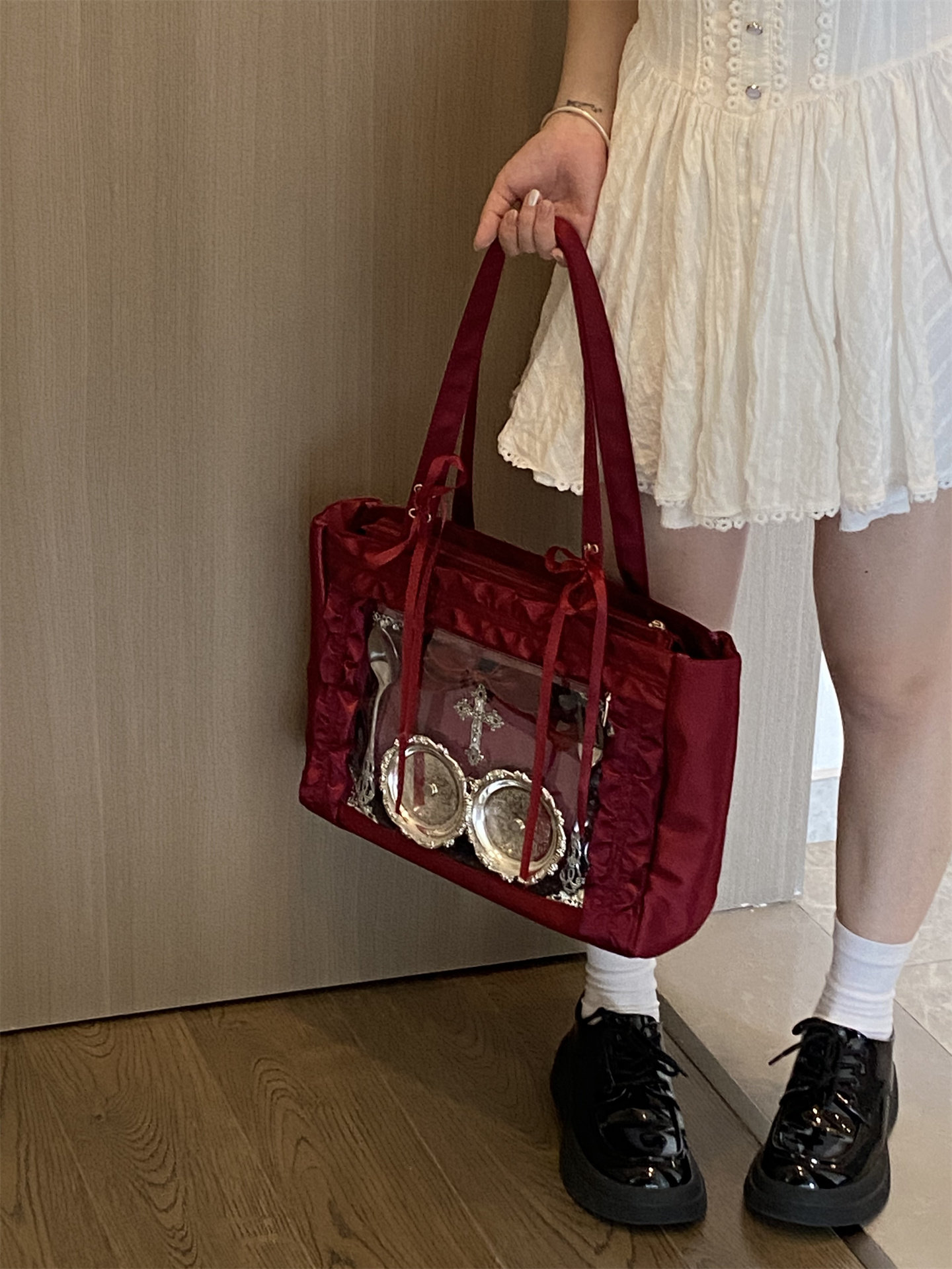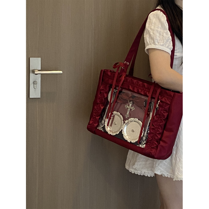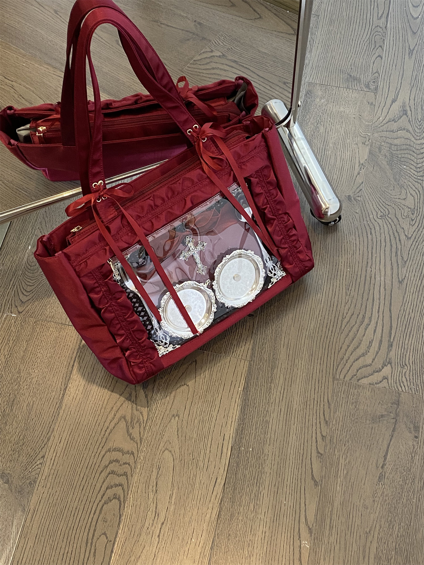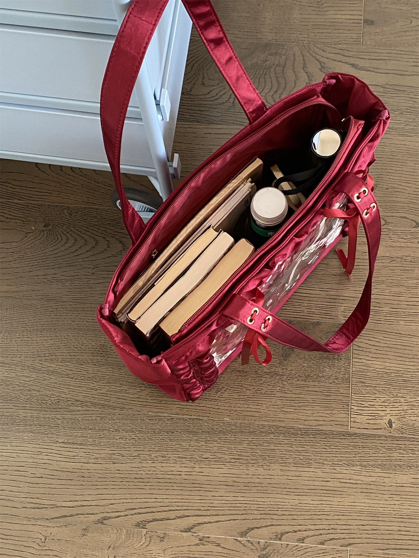 錢一波痛包|暗紅色花邊緞面痛大容量單肩包托特包大食量華麗吧唧