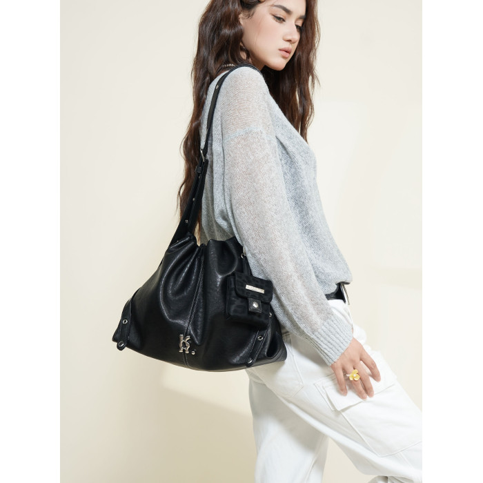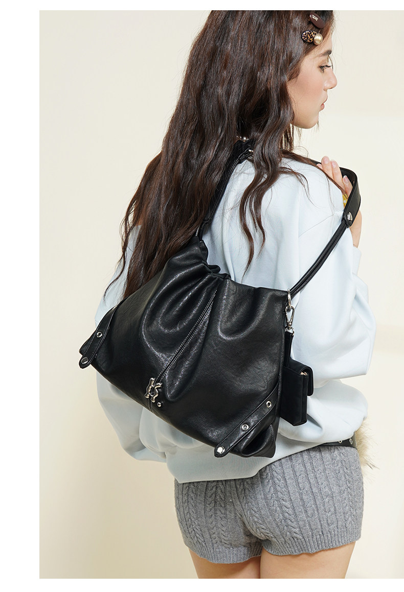 哐花村2025新品大容量通勤托特包女抽繩流浪包單肩斜後後背包黑色