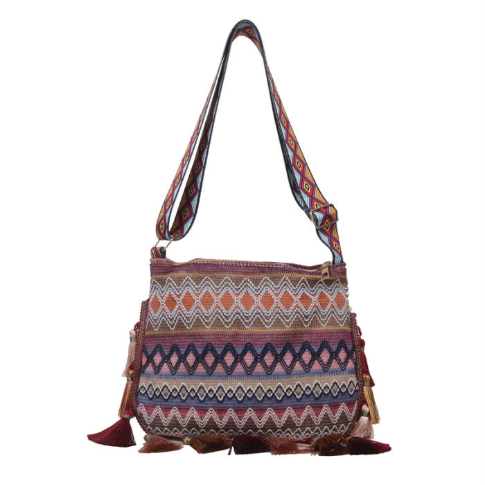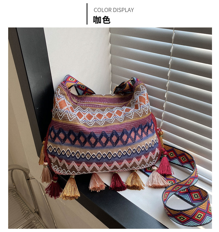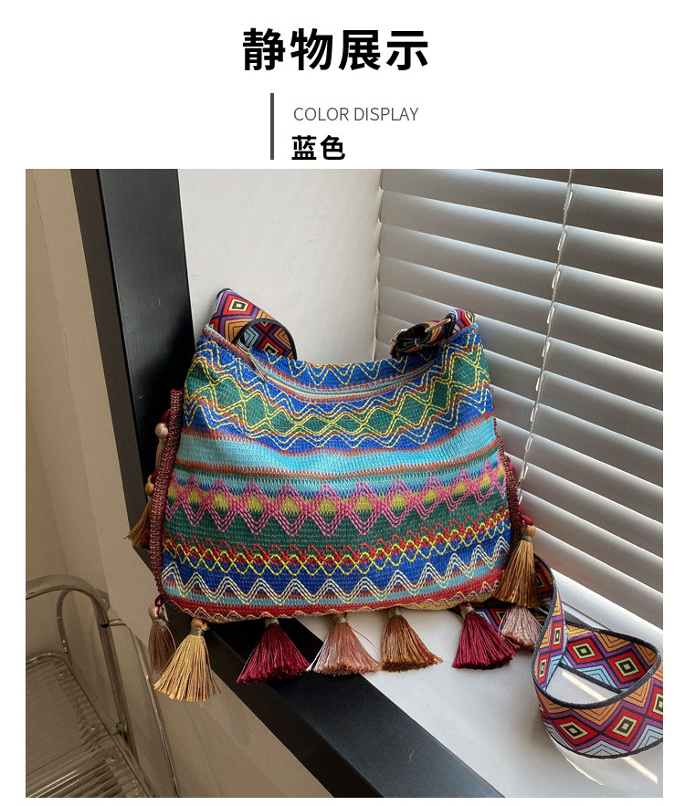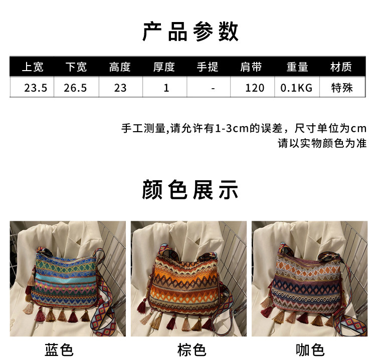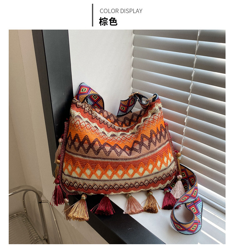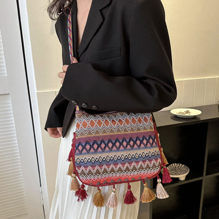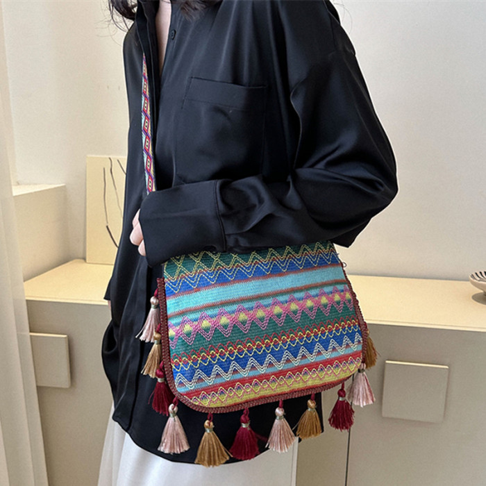 小清新民族風斜後後背包包女2024新款潮百搭寬肩帶單肩包流蘇水桶包女