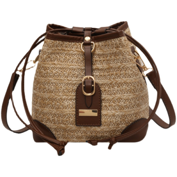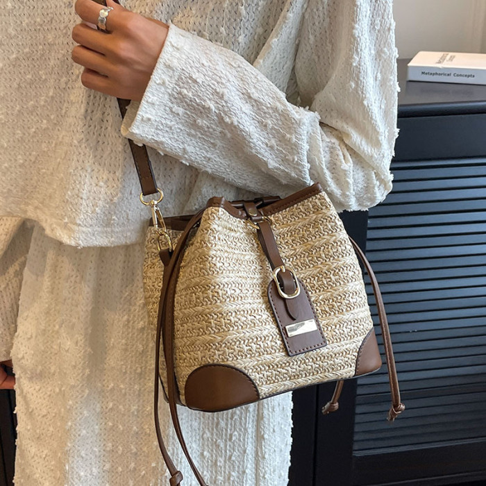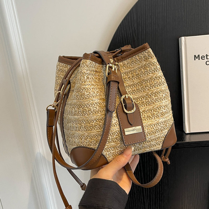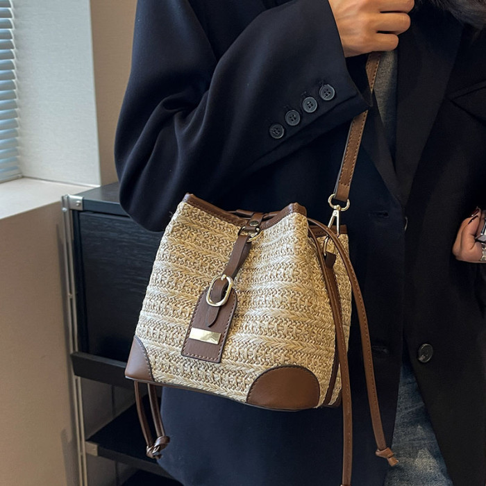夏季復古撞色百搭小包包女海灘度假休閒草編水桶包2025新款斜後後背包
