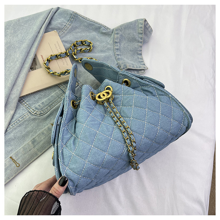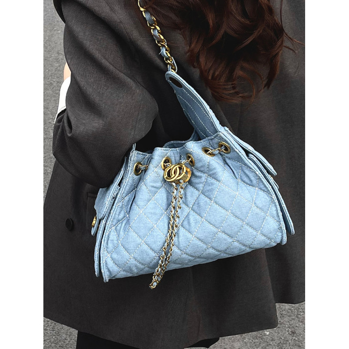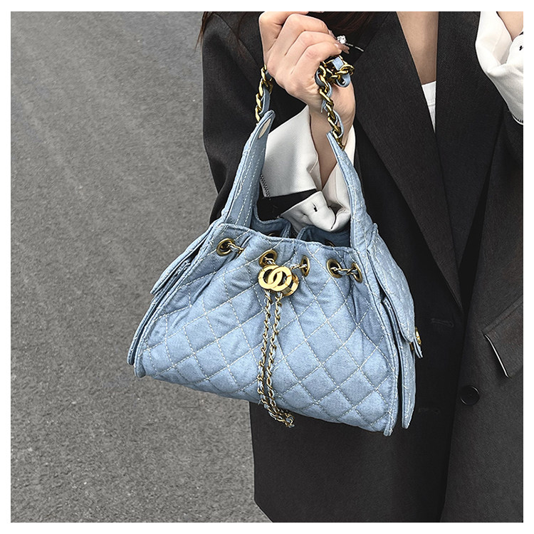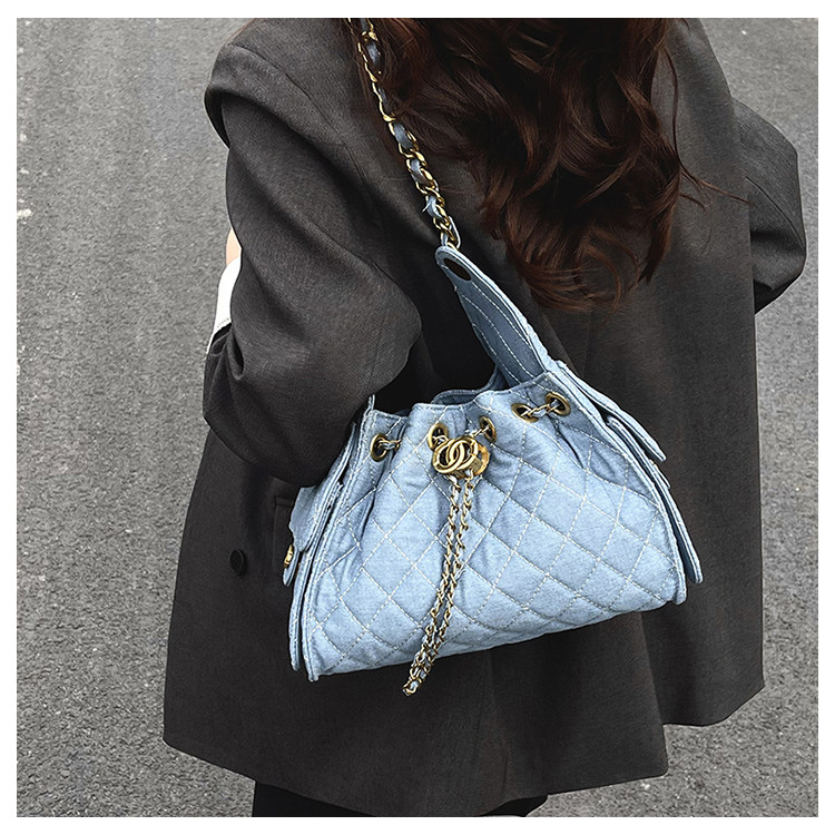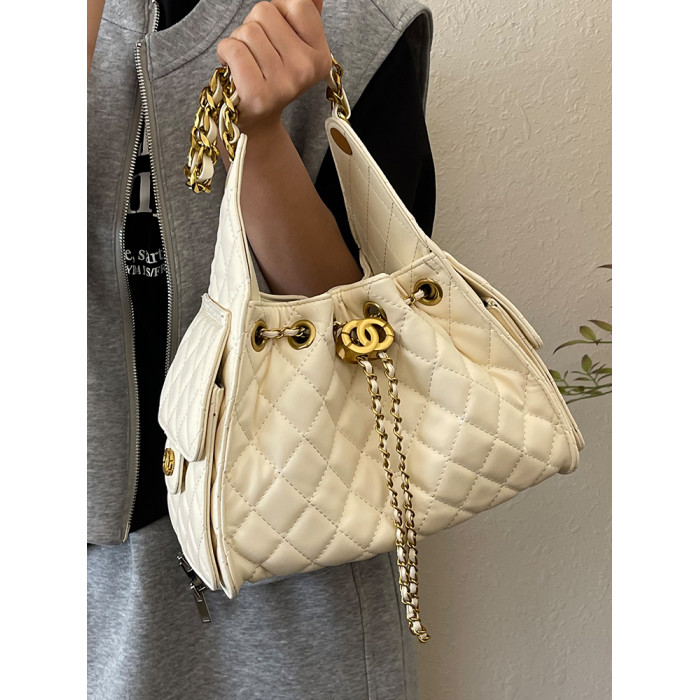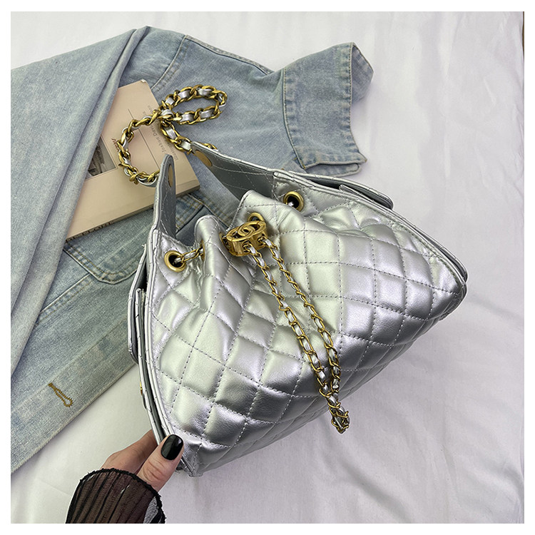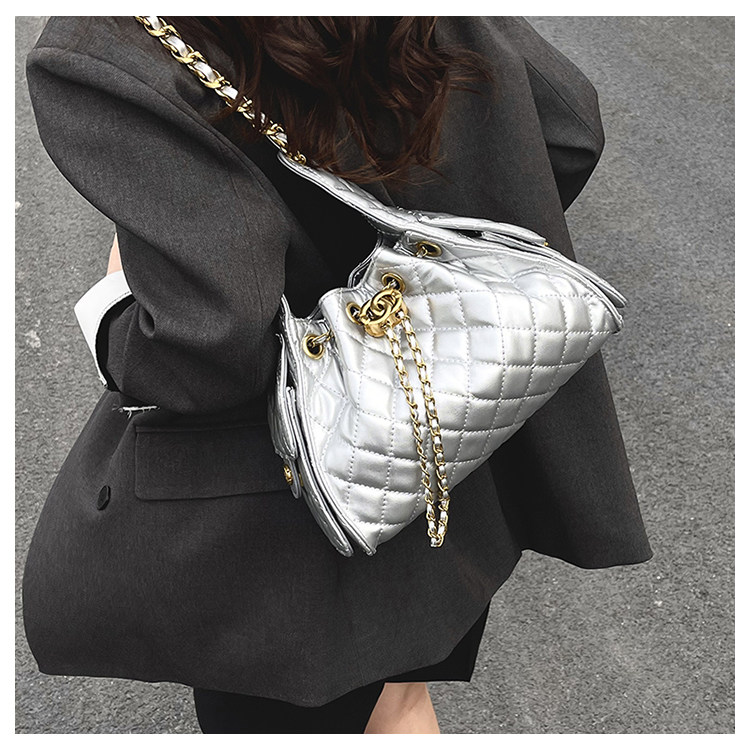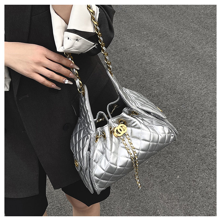 菱格鏈條小香風水桶包2025夏季新款女包時尚潮單肩包抽帶大容量
