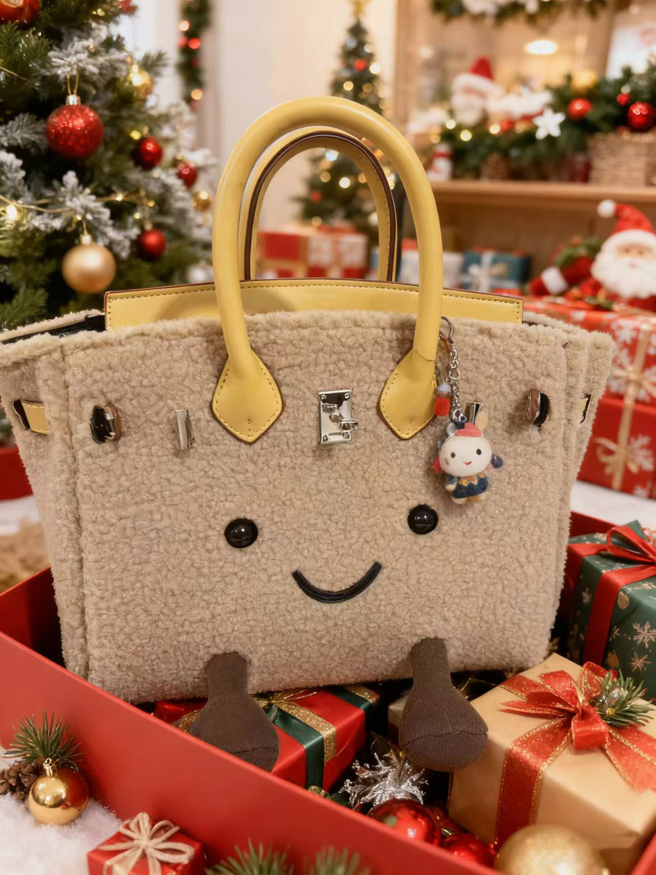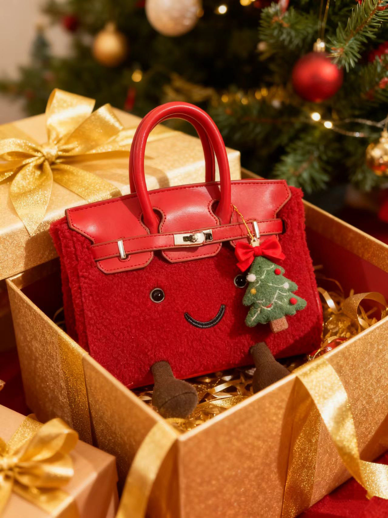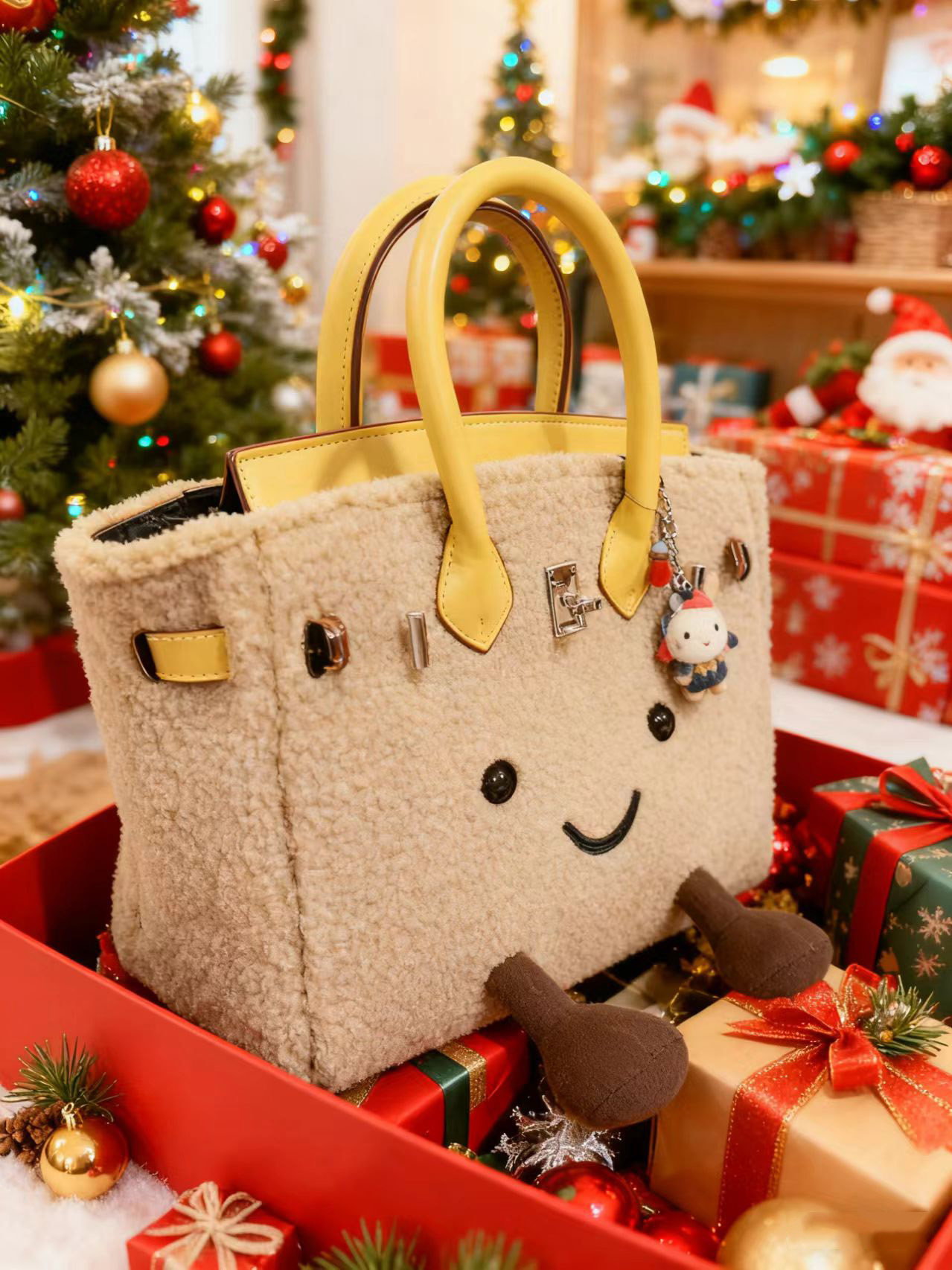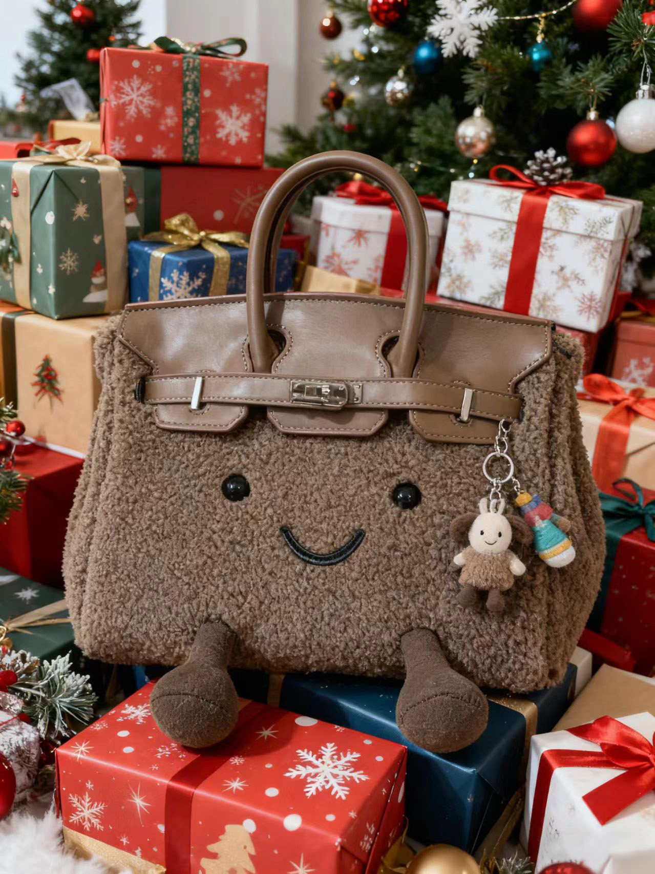 ZRVR新款聖誕節限定羊羔絨手提包軟萌可愛鉑金包單肩斜背凱莉包女