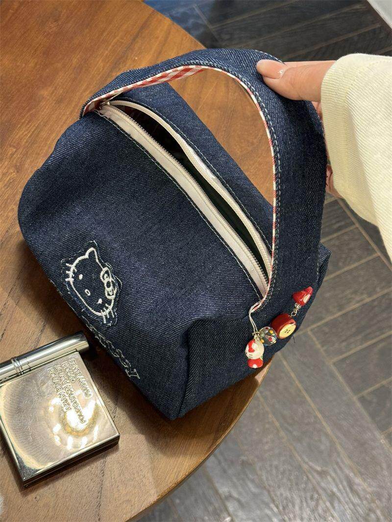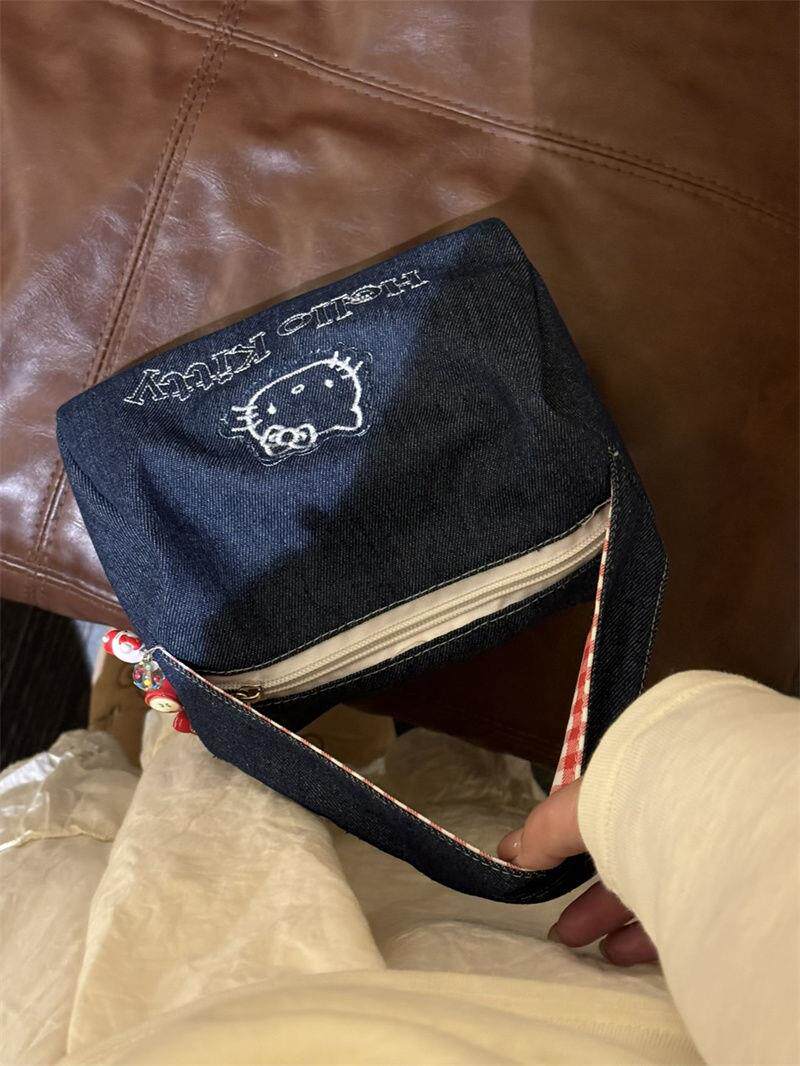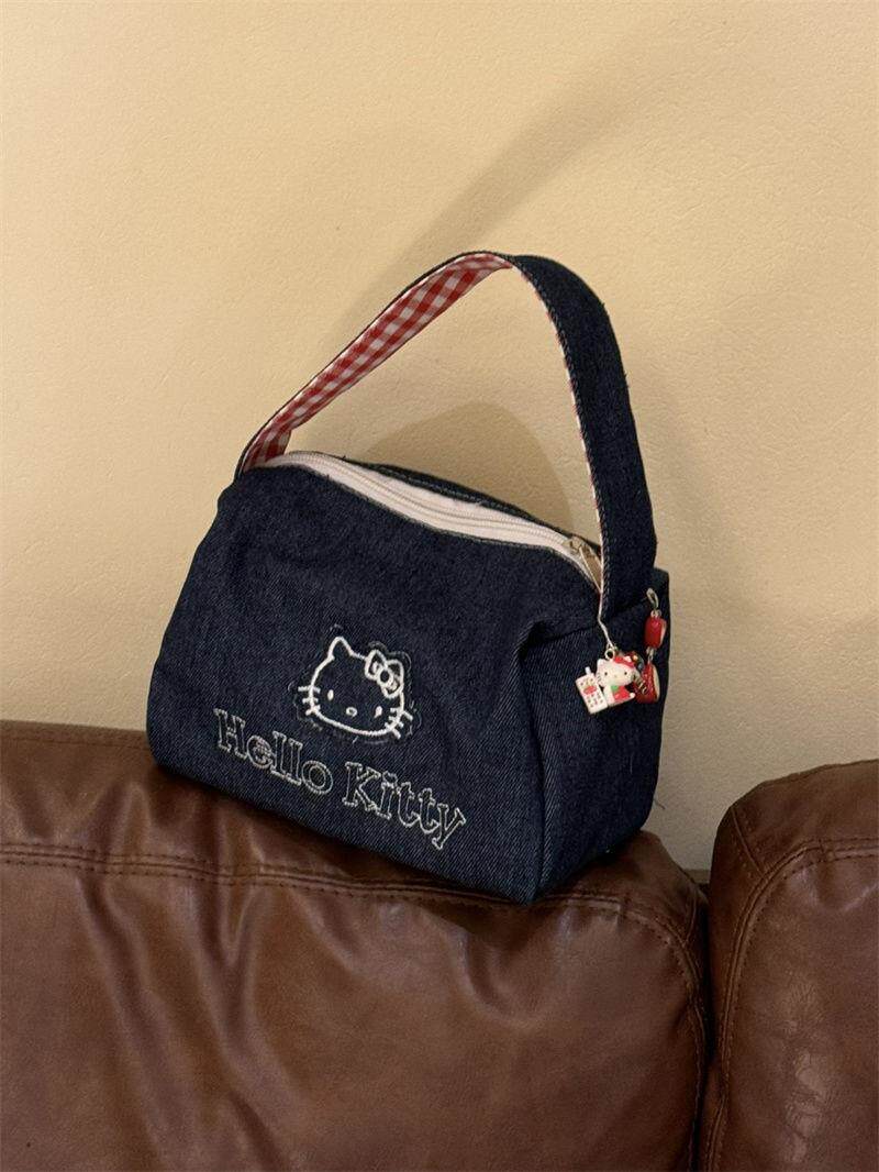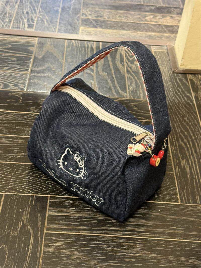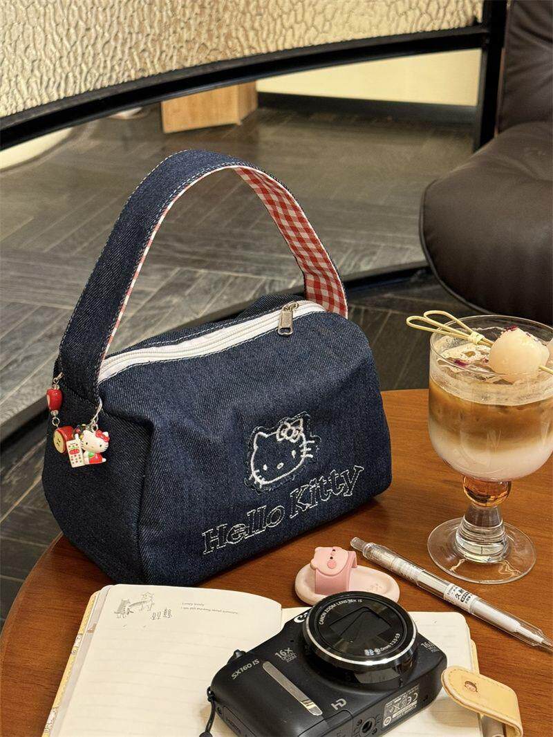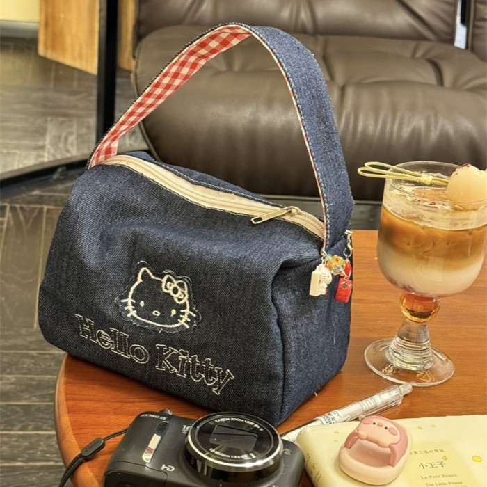 可愛kitty牛仔布復古手拎包ins高顔值大容量可攜式手提包女化妝包