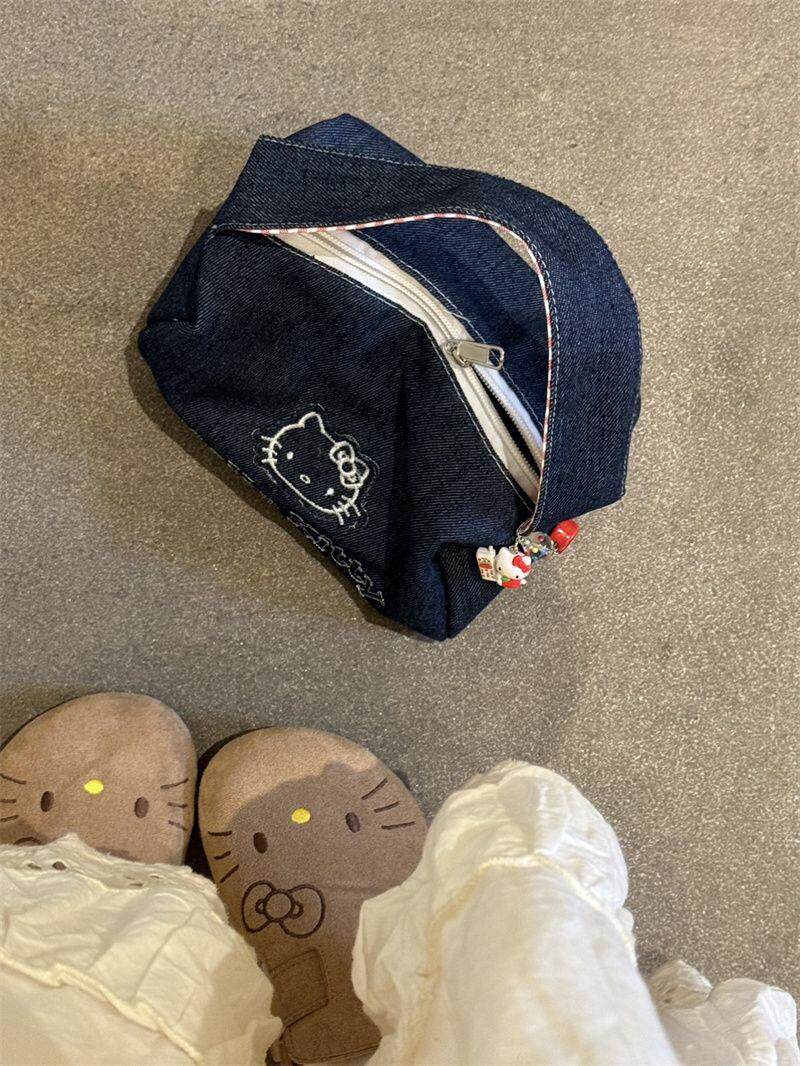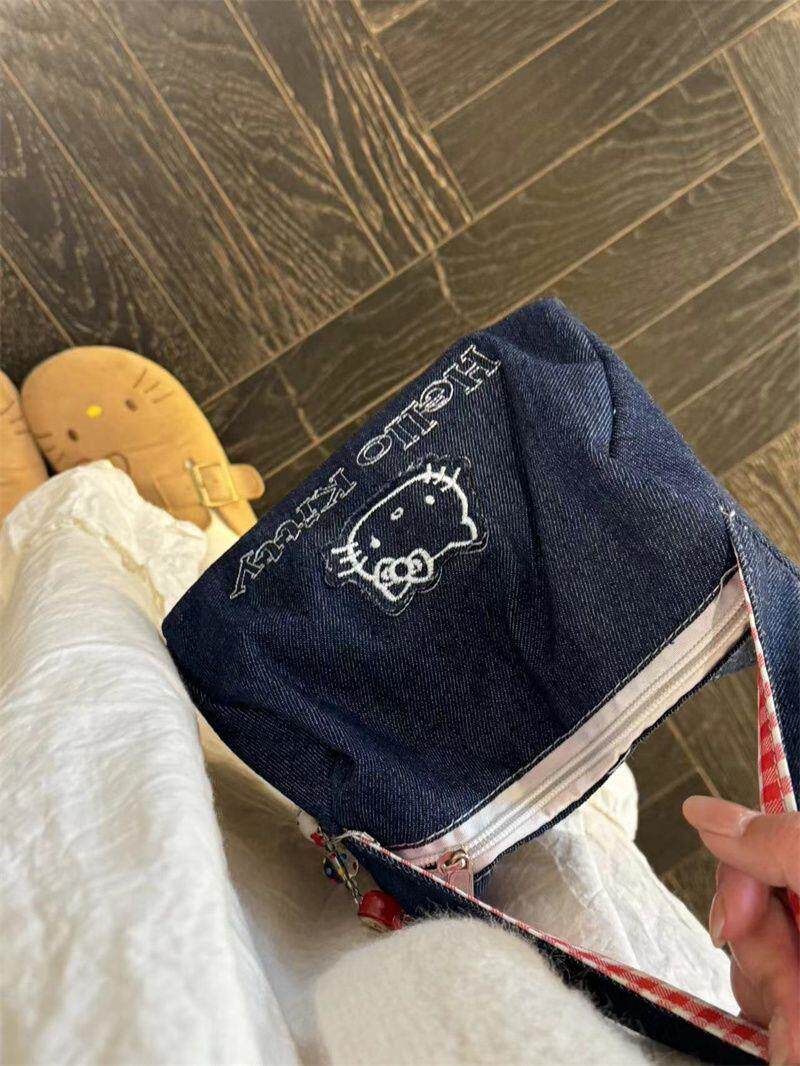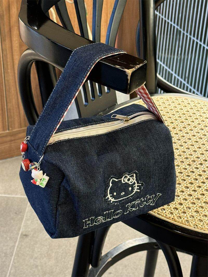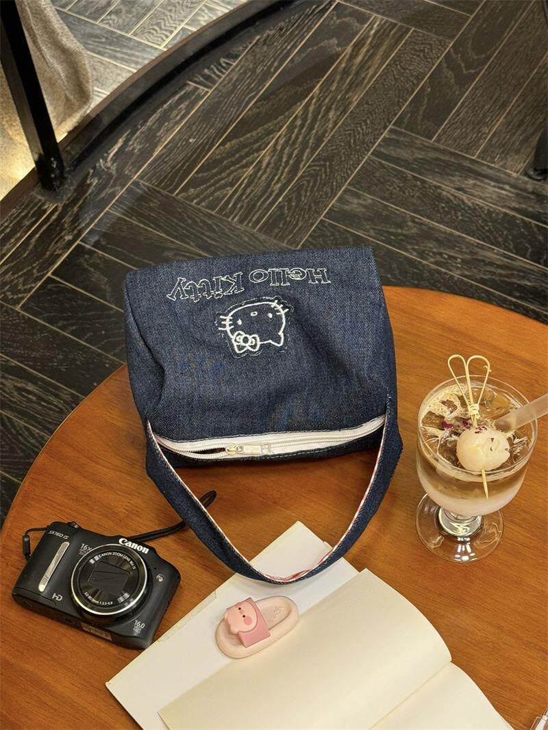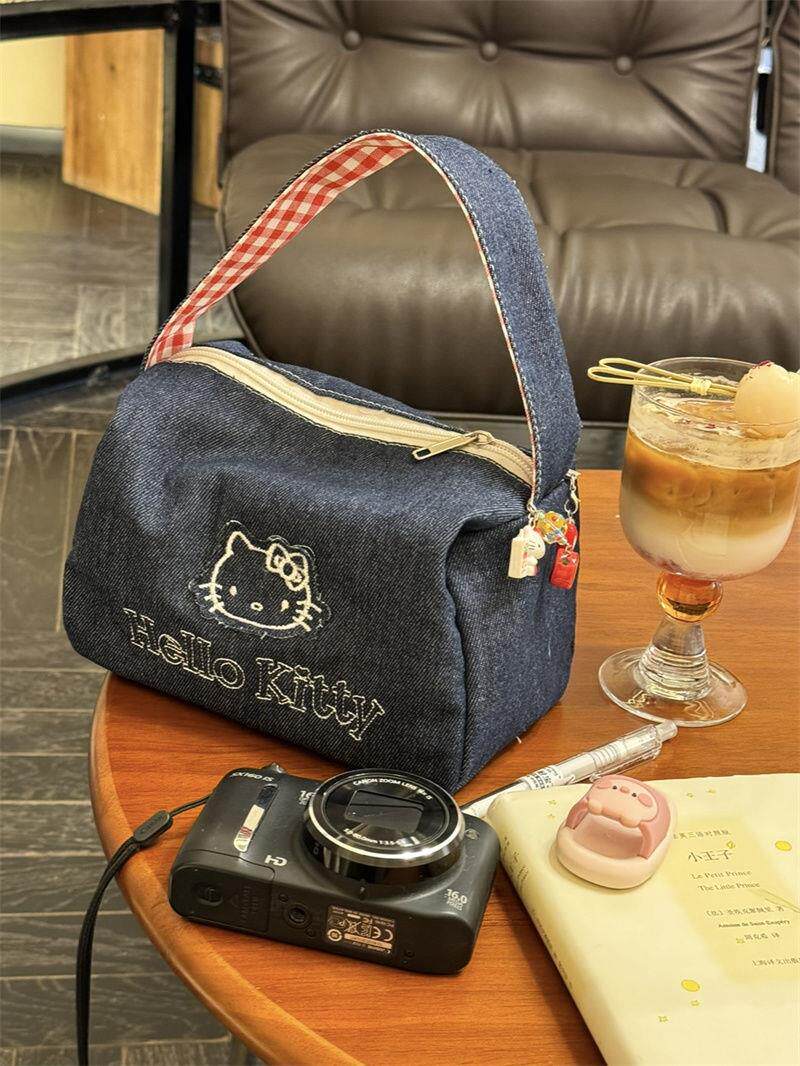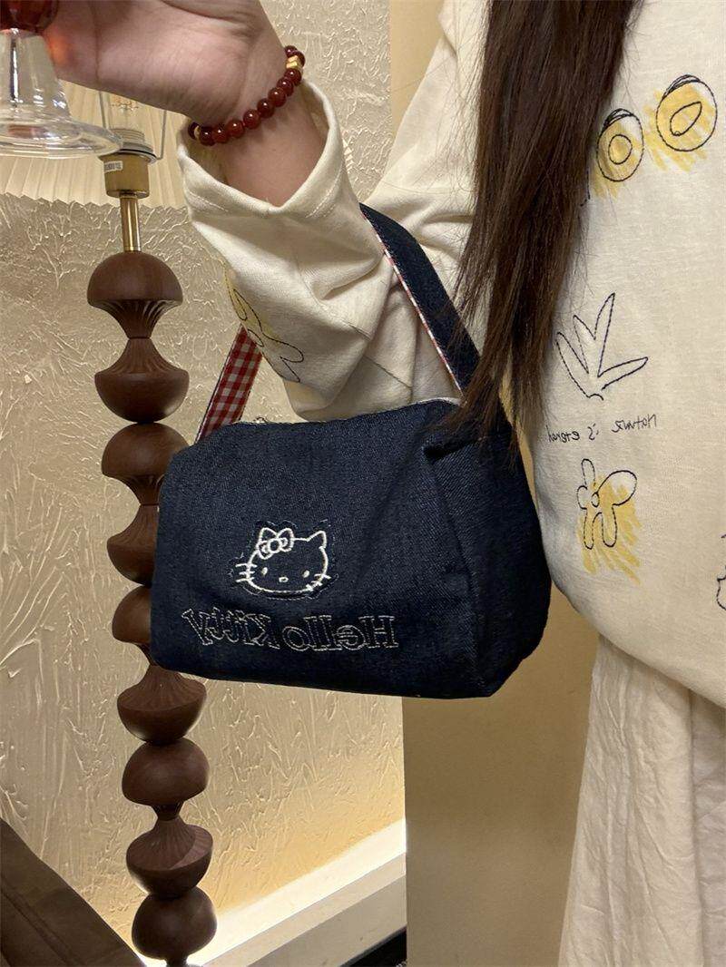 可愛kitty牛仔布復古手拎包ins高顔值大容量可攜式手提包女化妝包