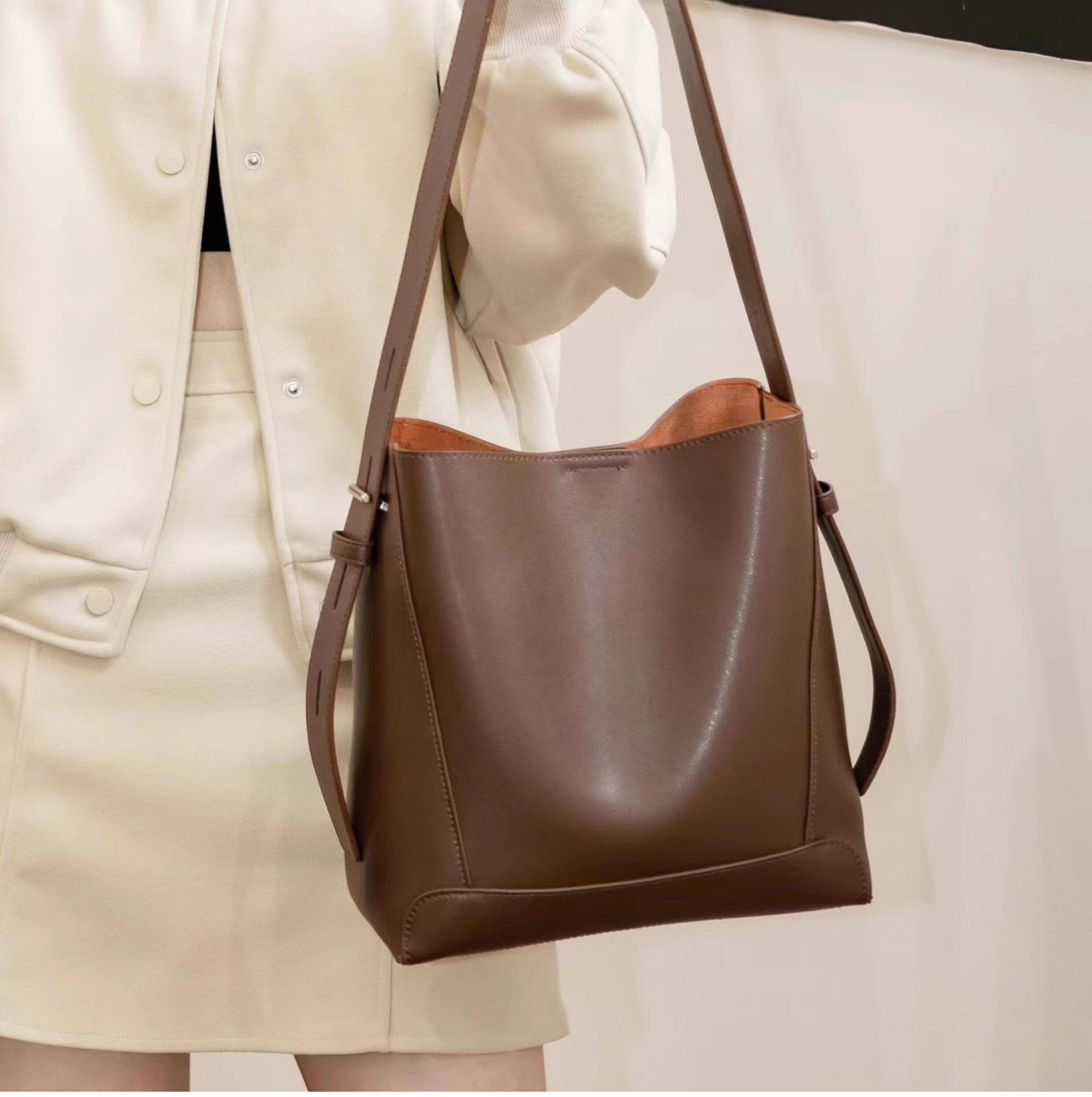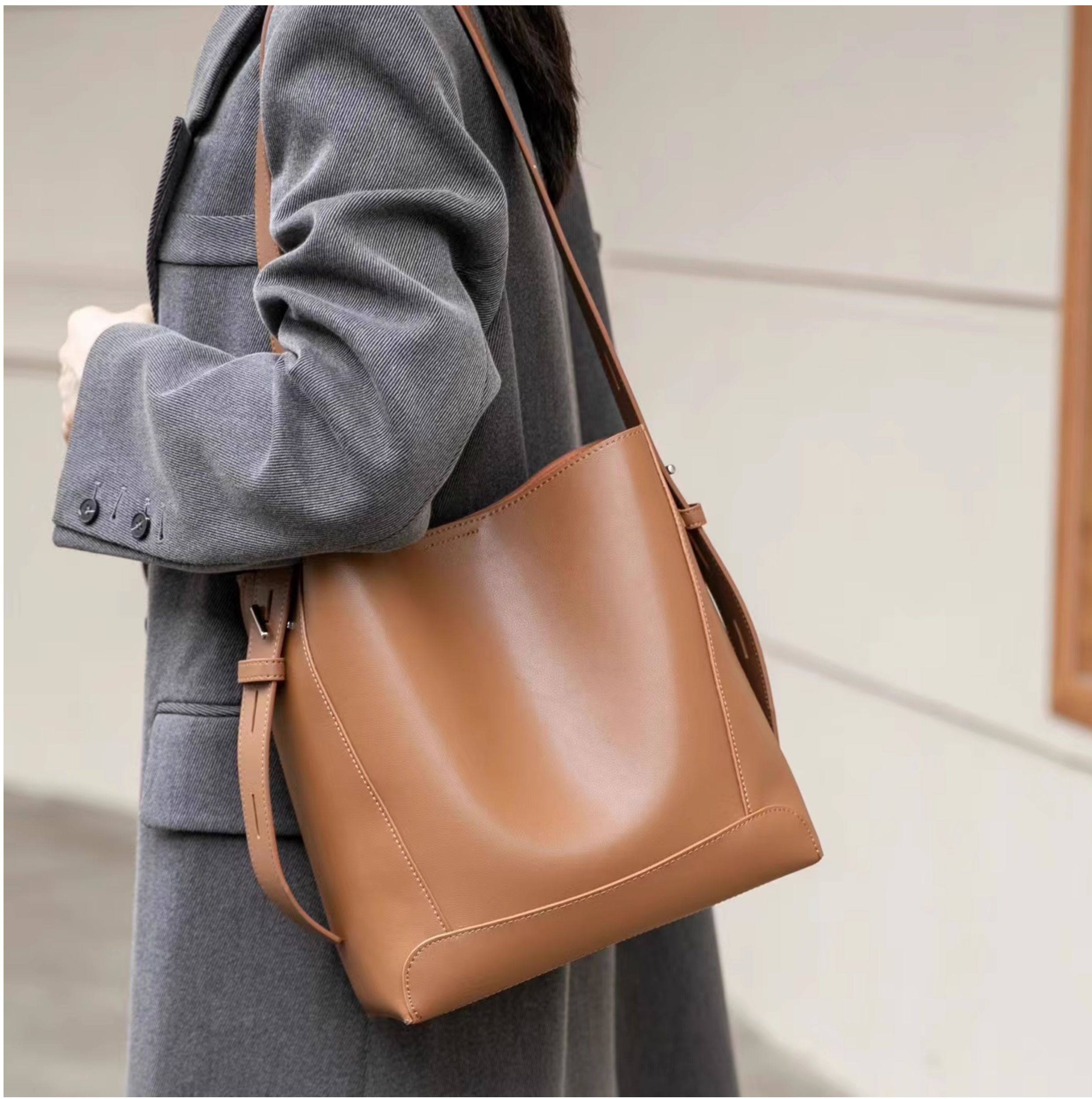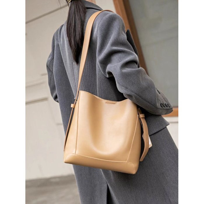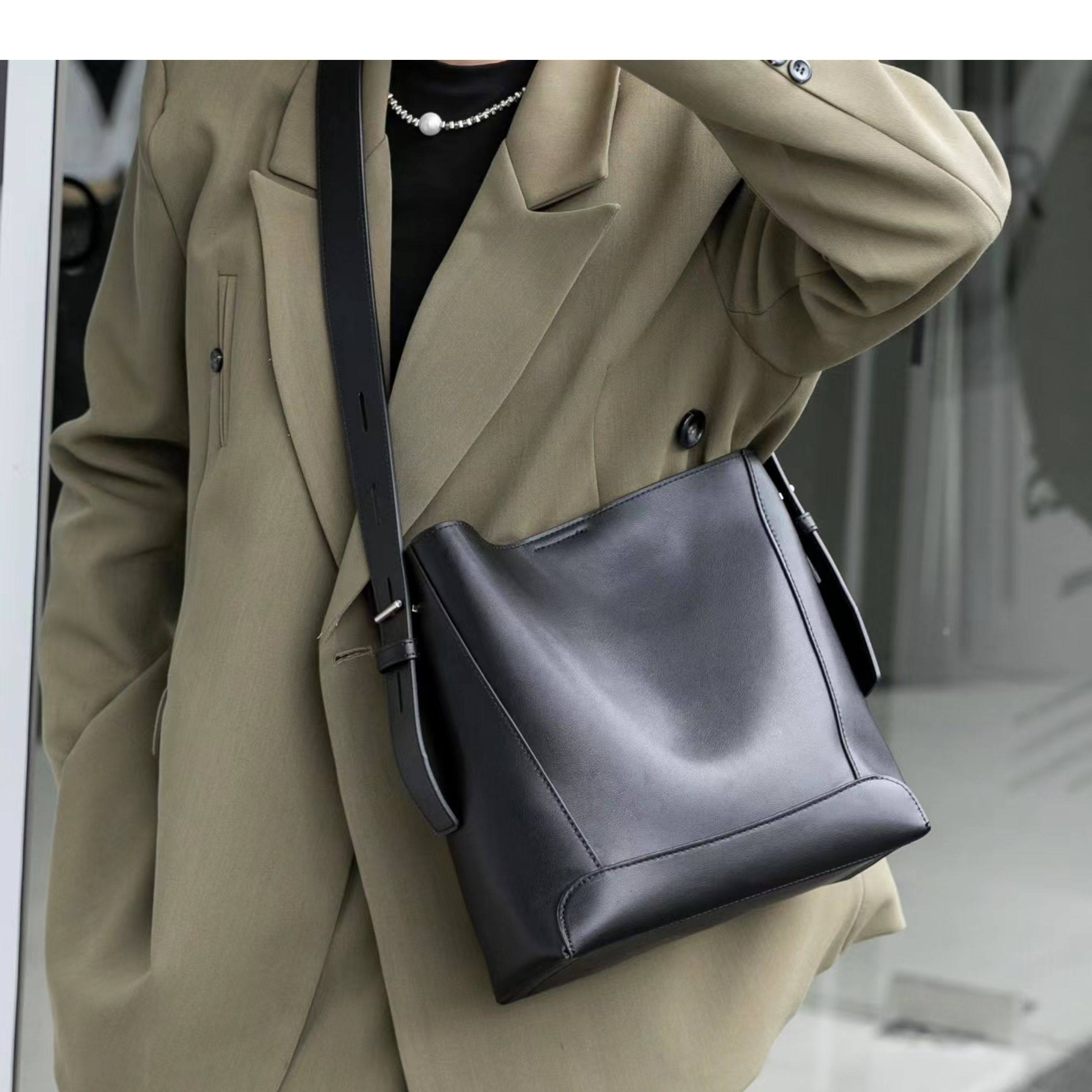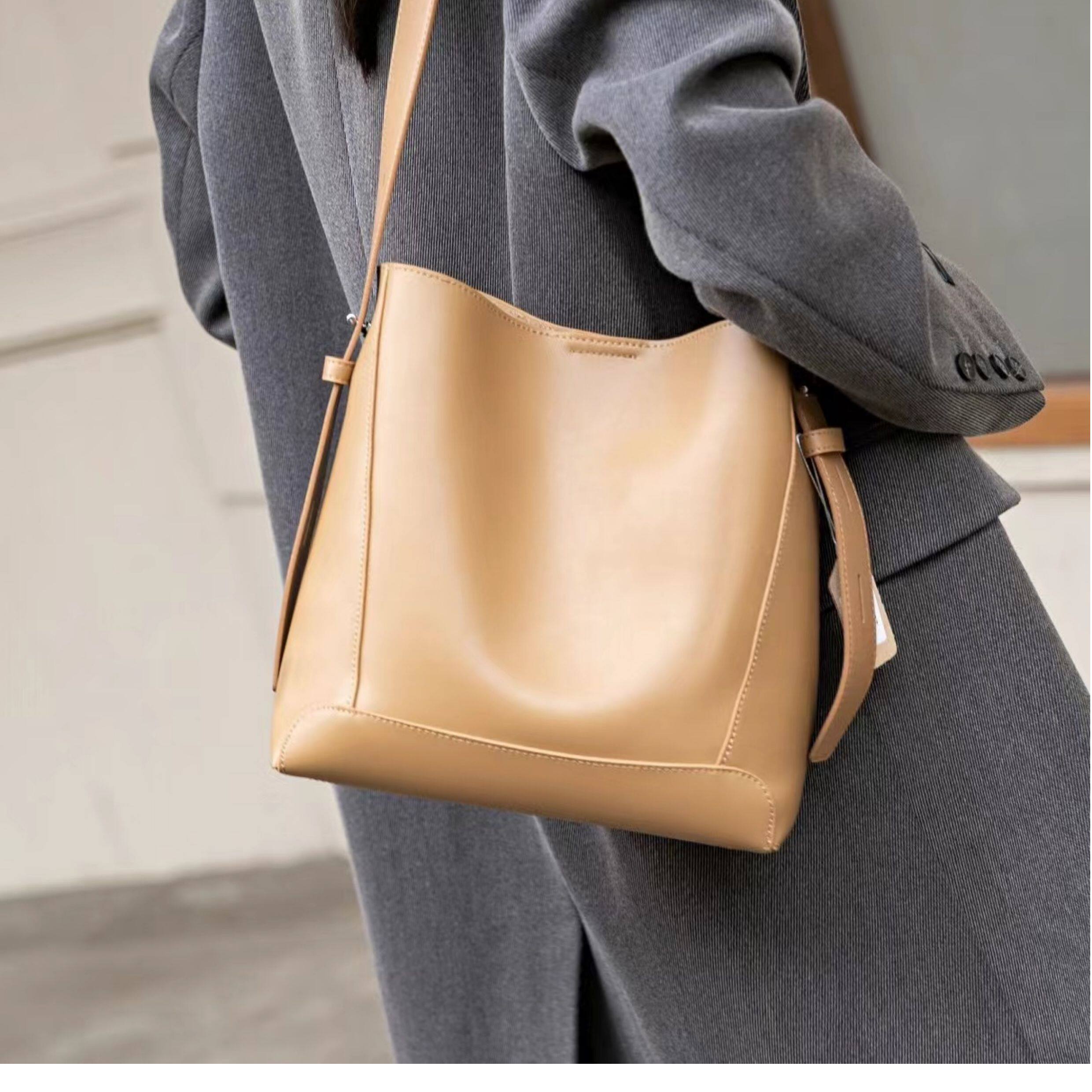 水桶包2025秋冬新款單肩通勤包百搭牛皮大容量托特包斜背真皮女包