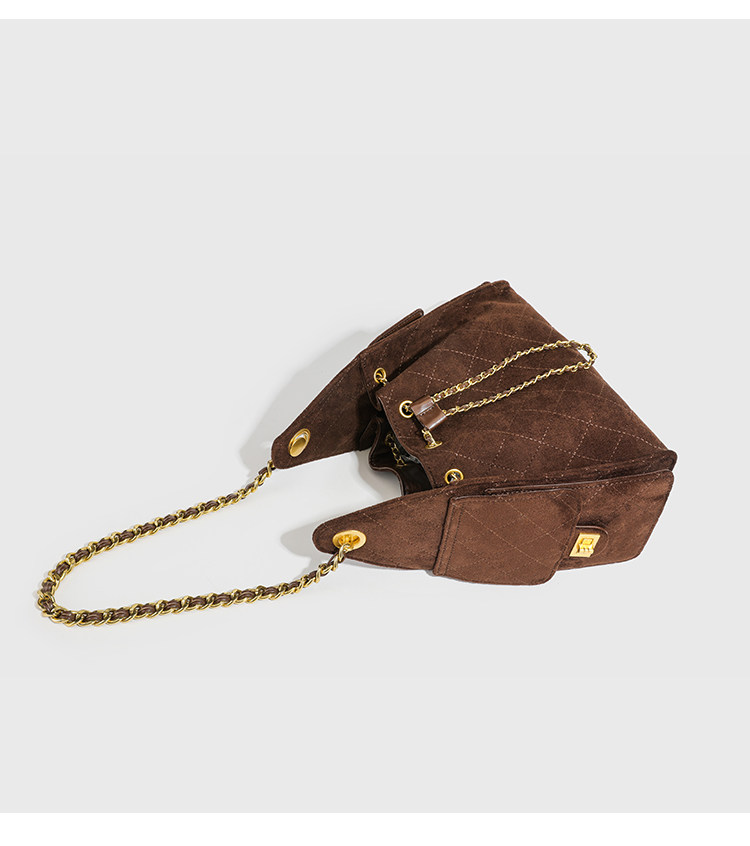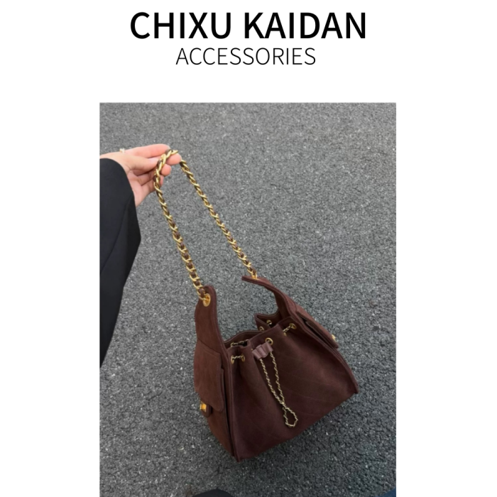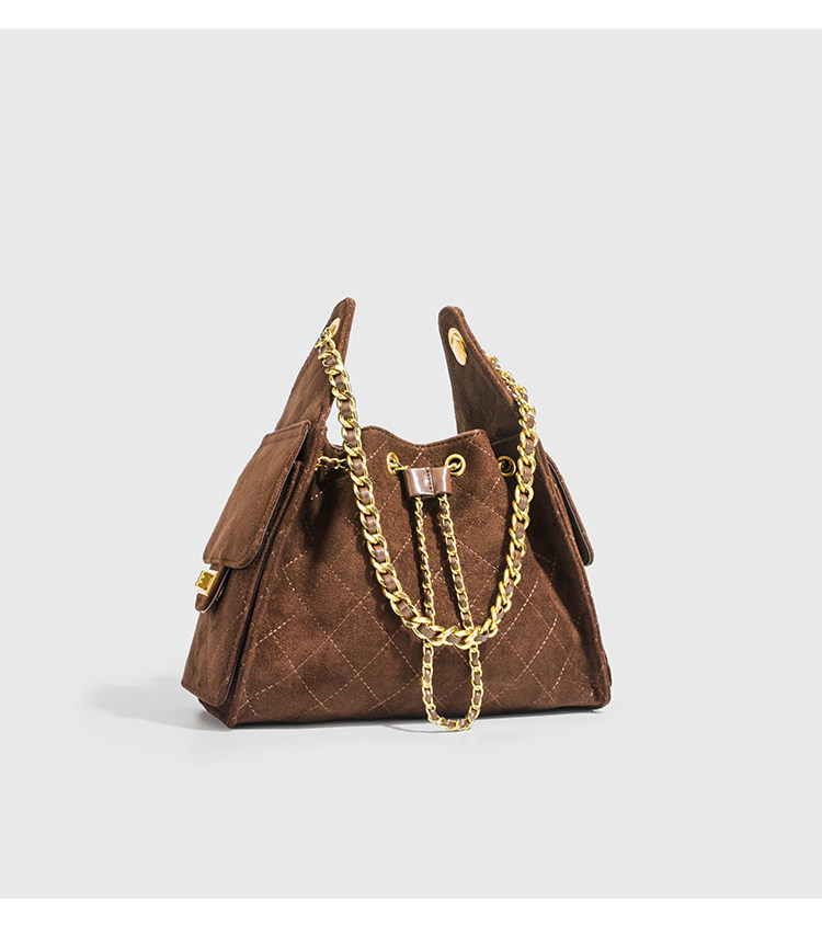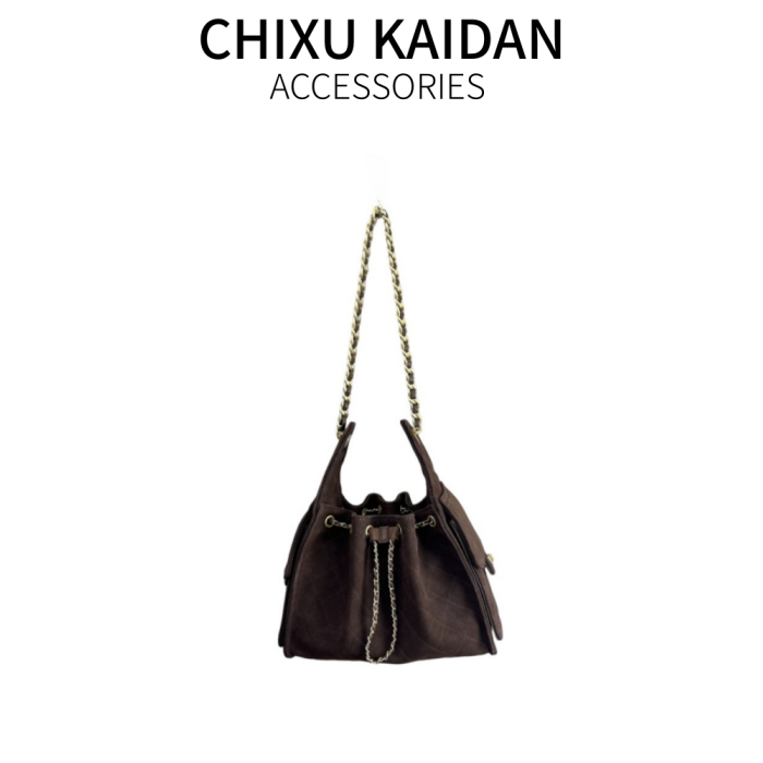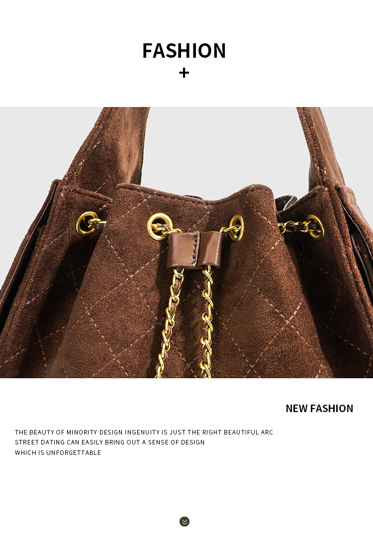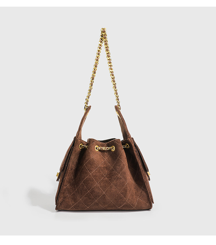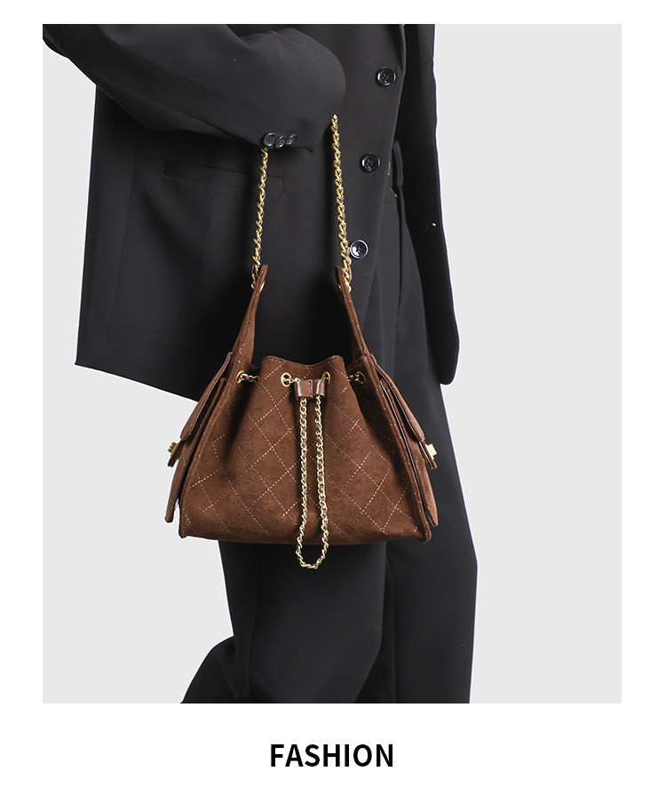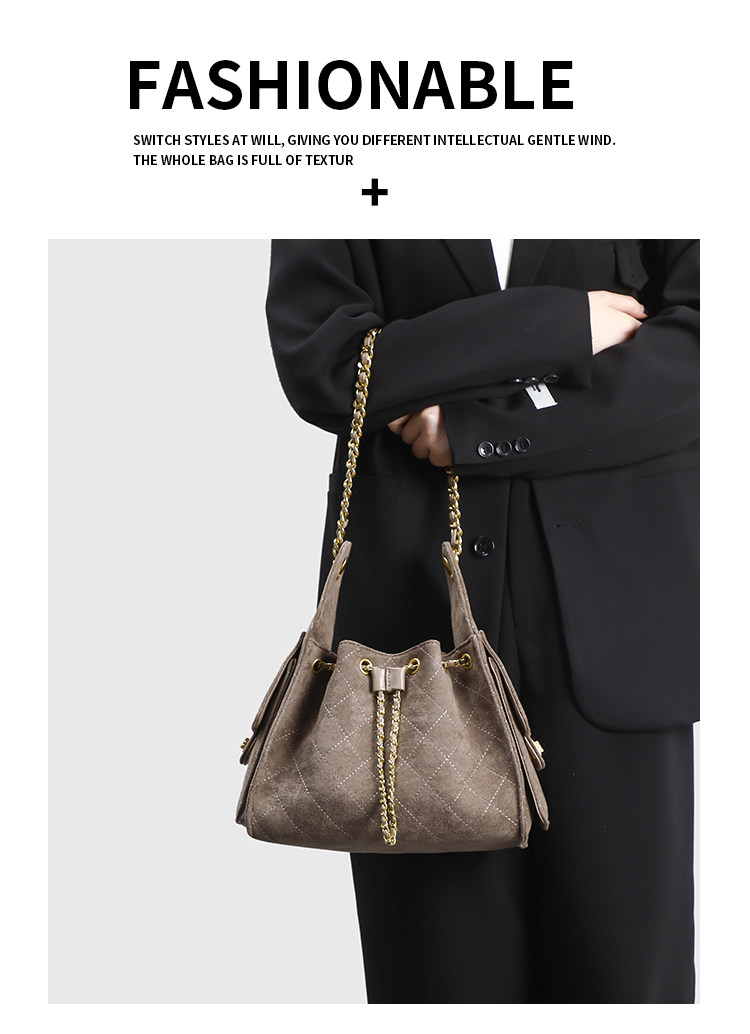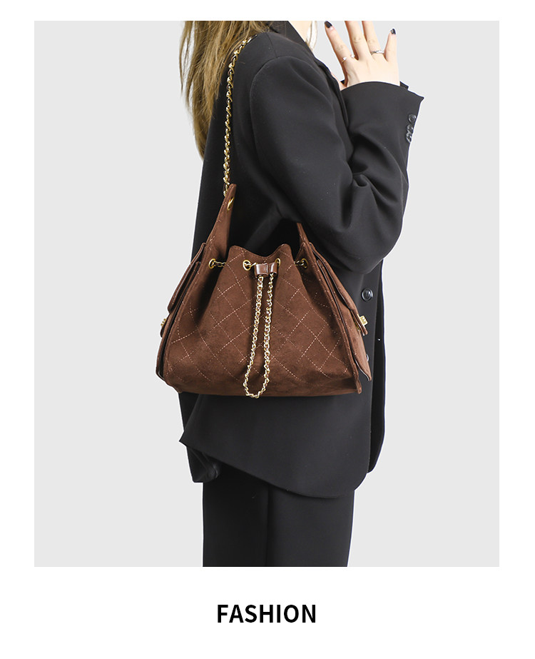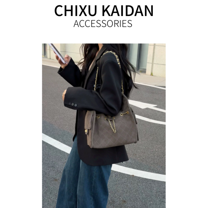 小香風抽繩水桶包秋冬新款麂皮hobo腋下包菱格鏈條托特包單肩女包
