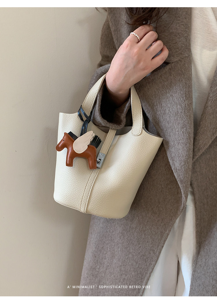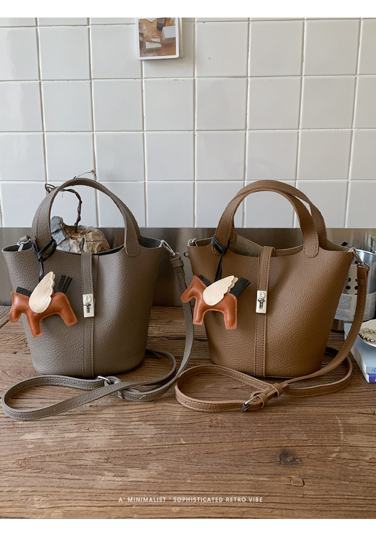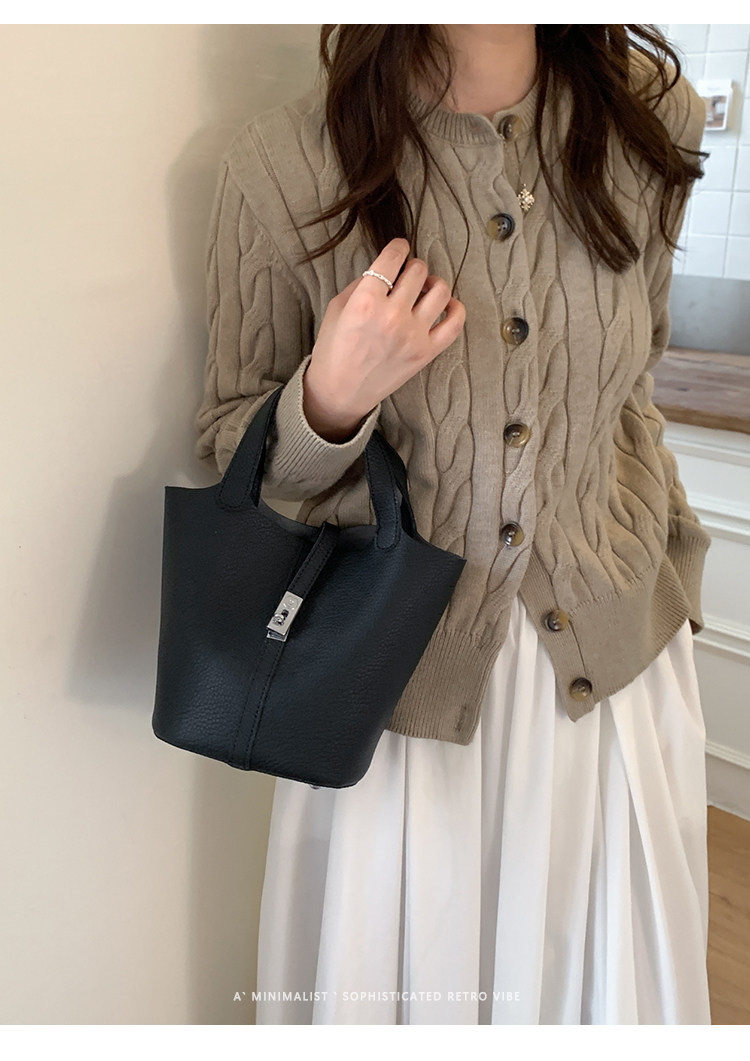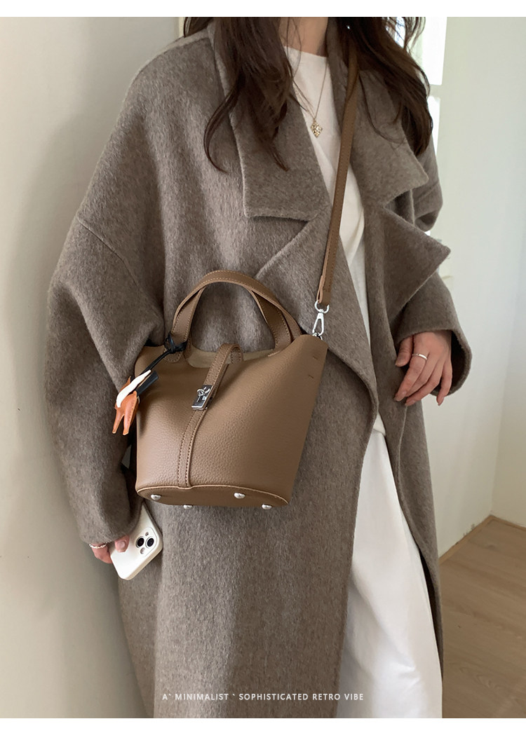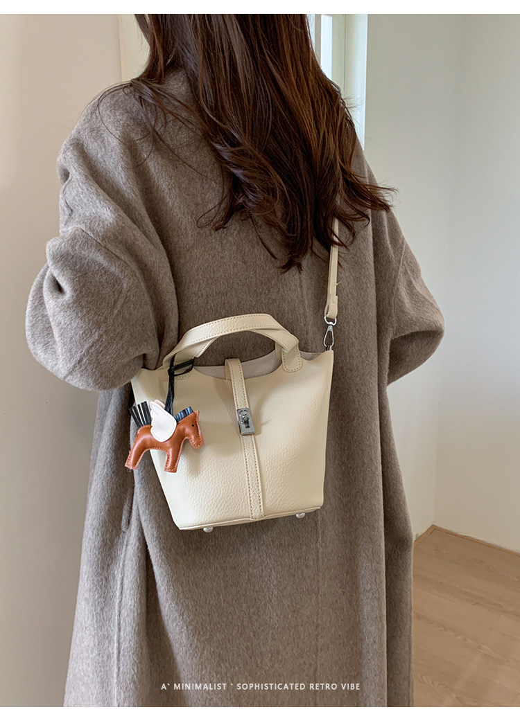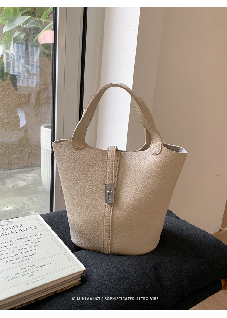 韓國小衆手提水桶包女2025新款復古荔枝紋菜籃子包鎖釦單肩斜後後背包