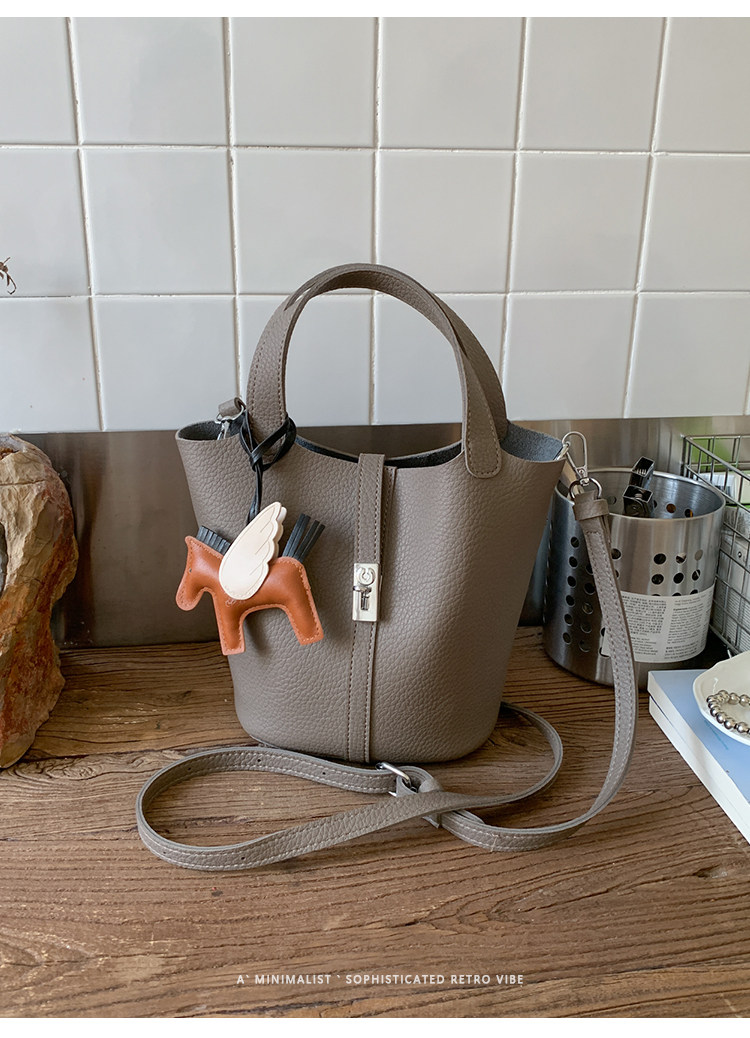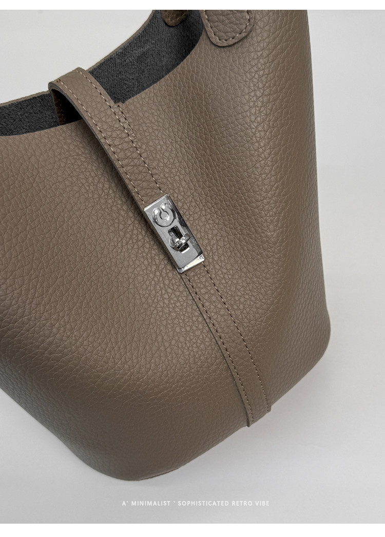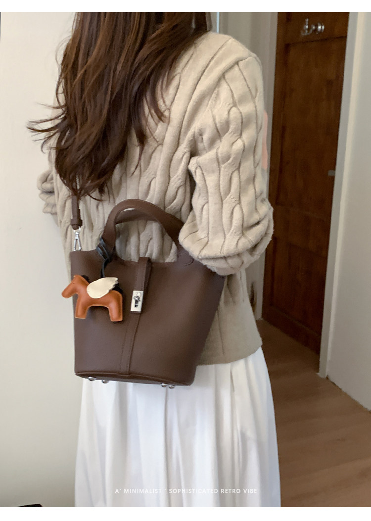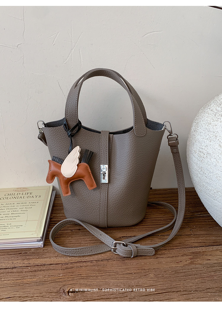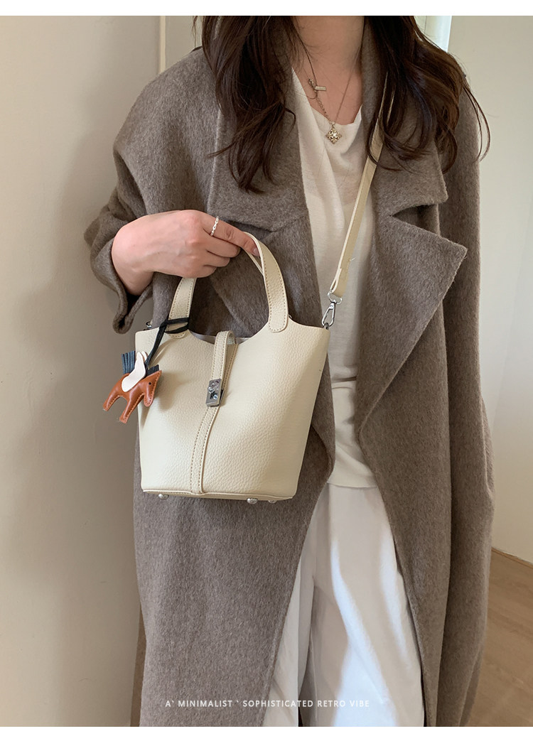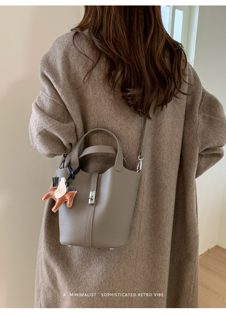 韓國小衆手提水桶包女2025新款復古荔枝紋菜籃子包鎖釦單肩斜後後背包