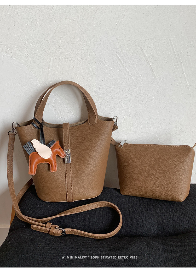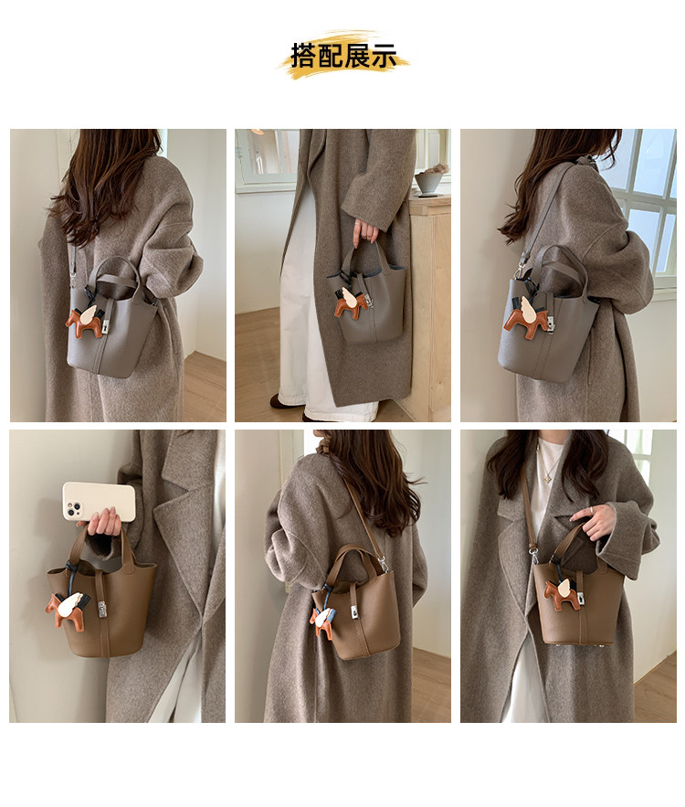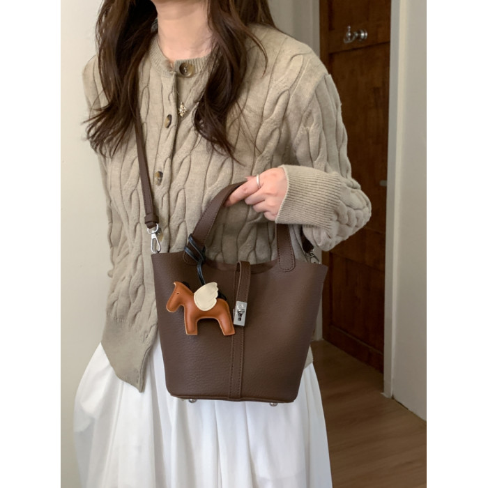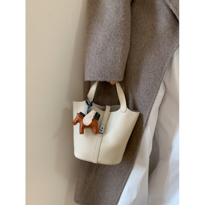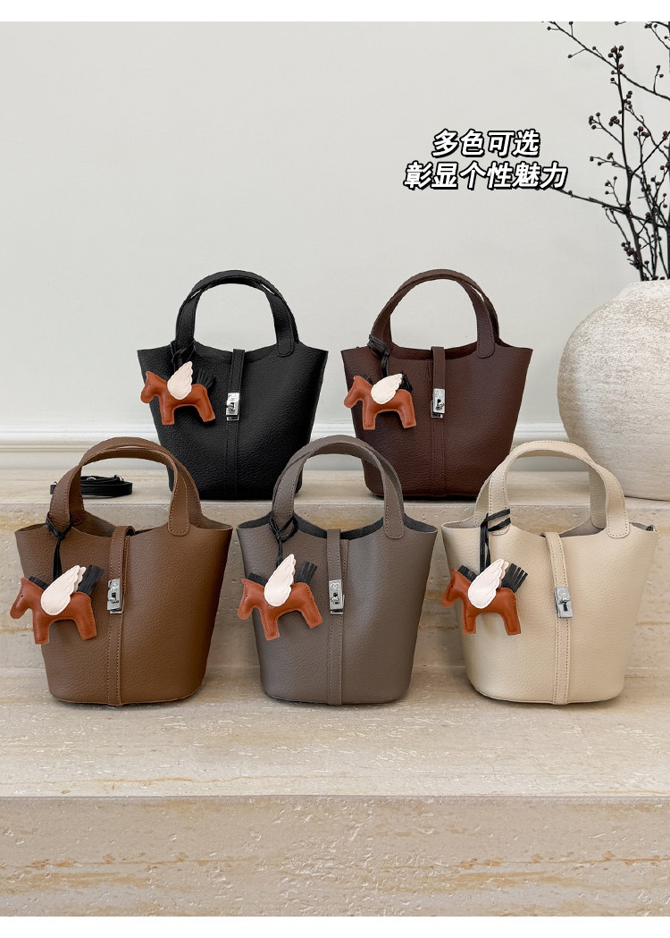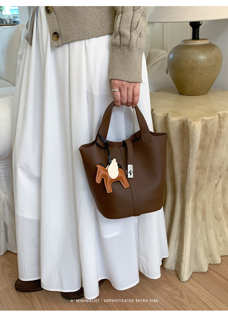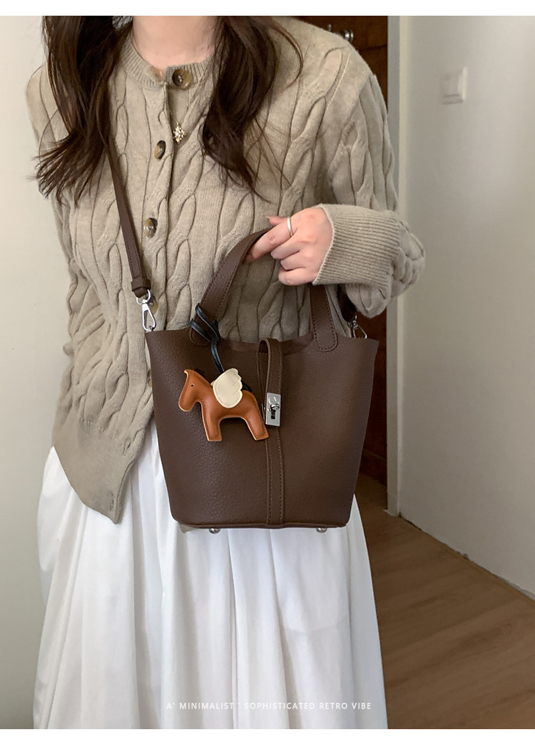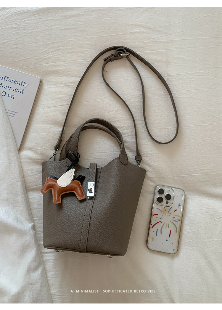 韓國小衆手提水桶包女2025新款復古荔枝紋菜籃子包鎖釦單肩斜後後背包