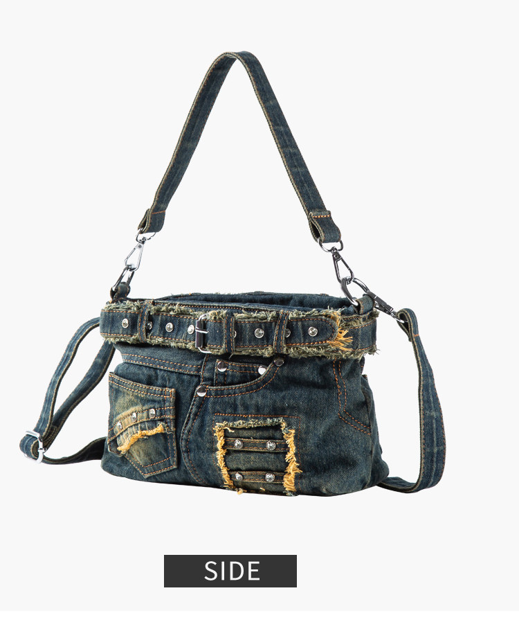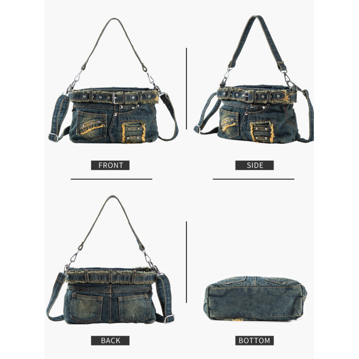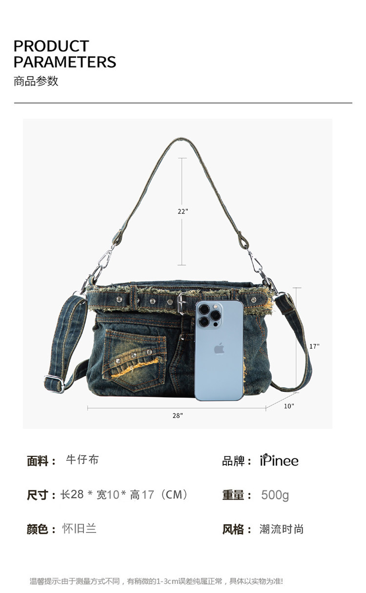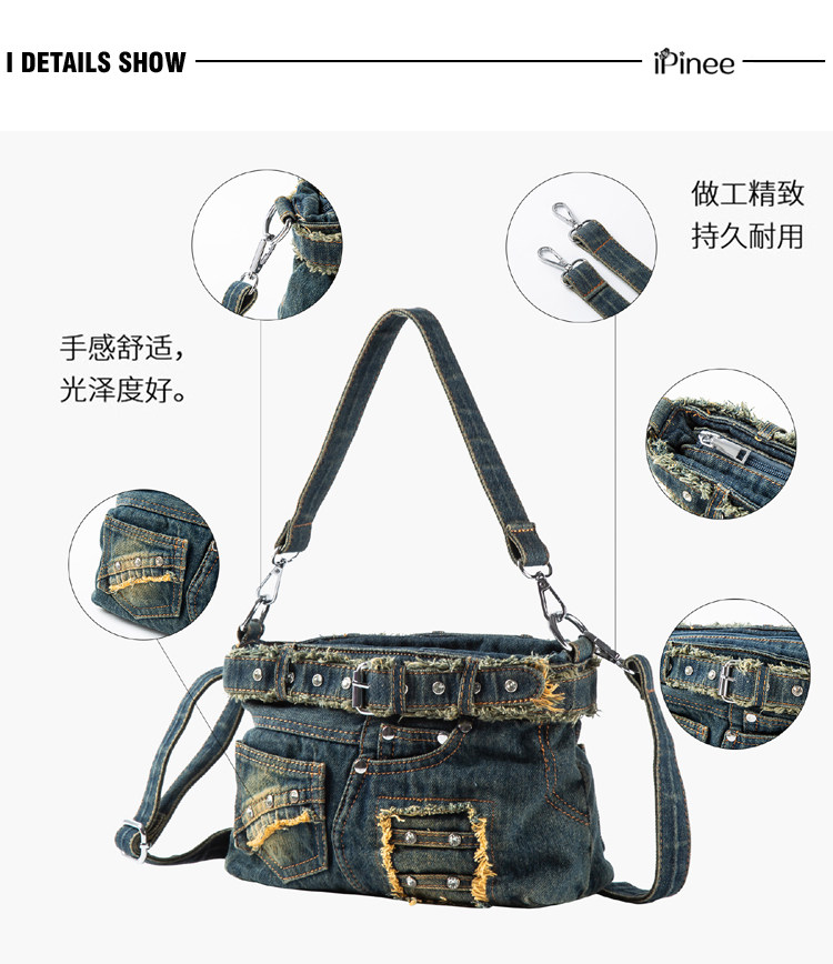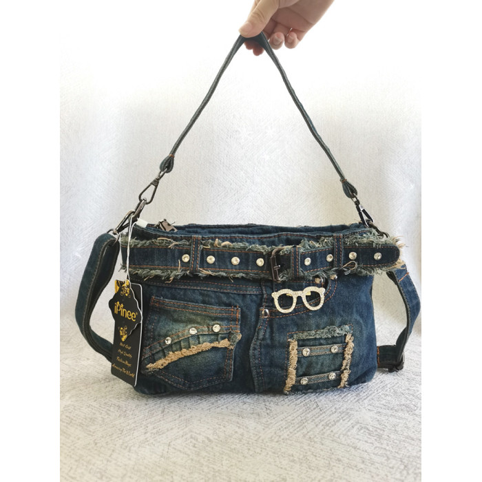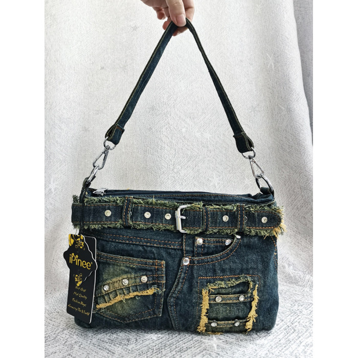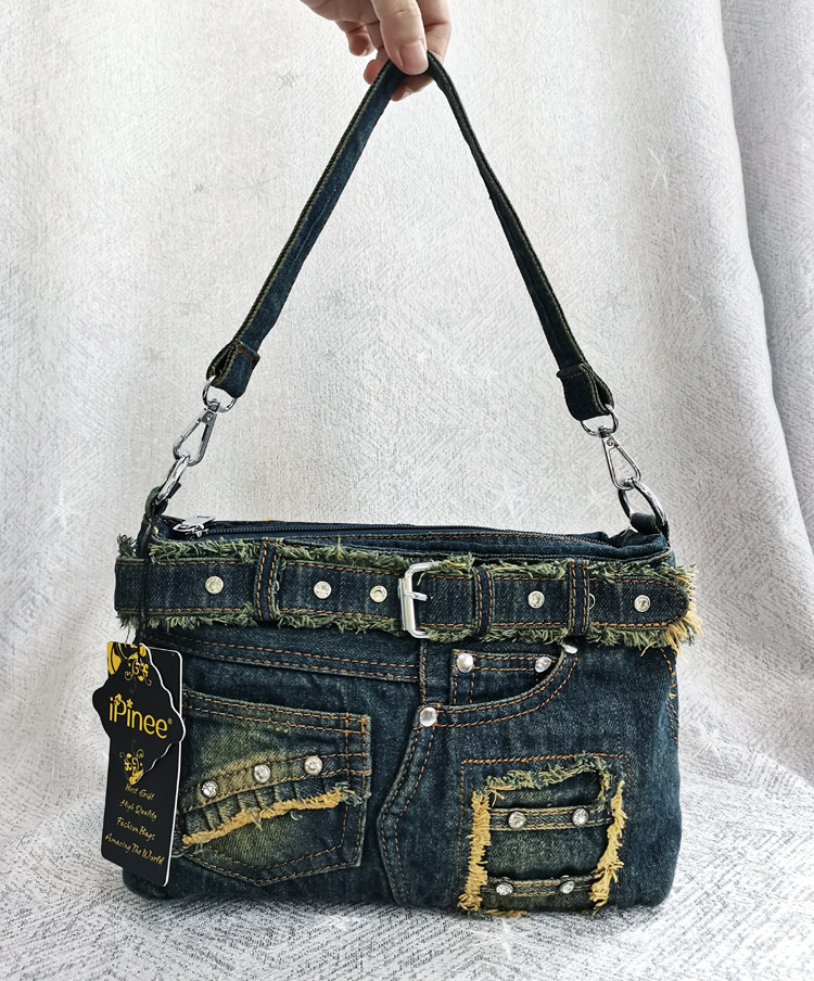 iPinee原創復古懷舊水洗牛仔布腋下包鑲鑽牛仔褲造型手提斜背女包