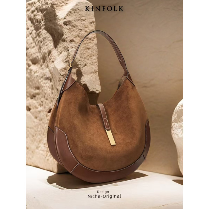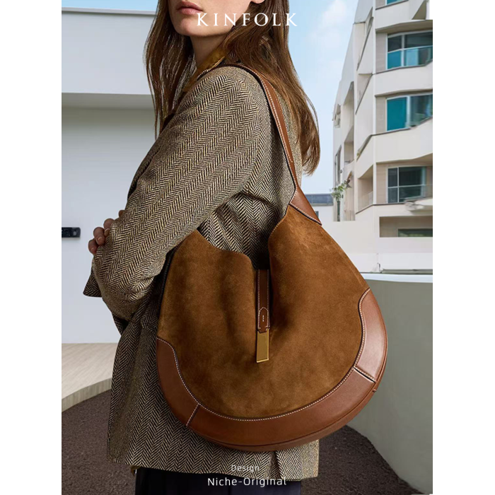 2025冬季新款麂皮絨拼接撞色馬鞍包高品質托特包鄭秀晶同款女包