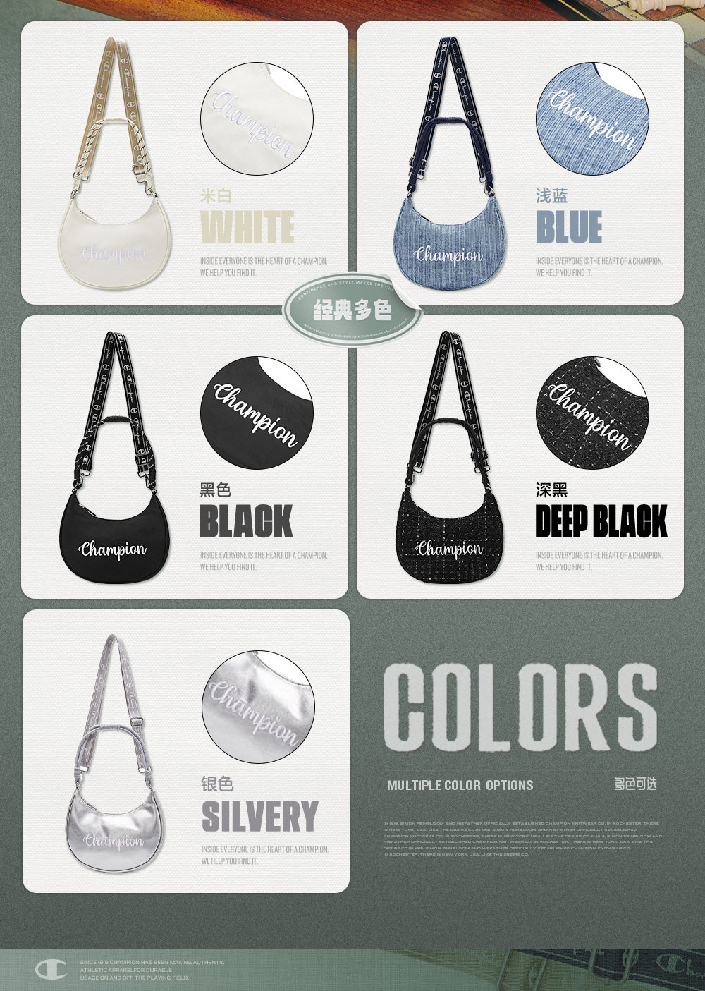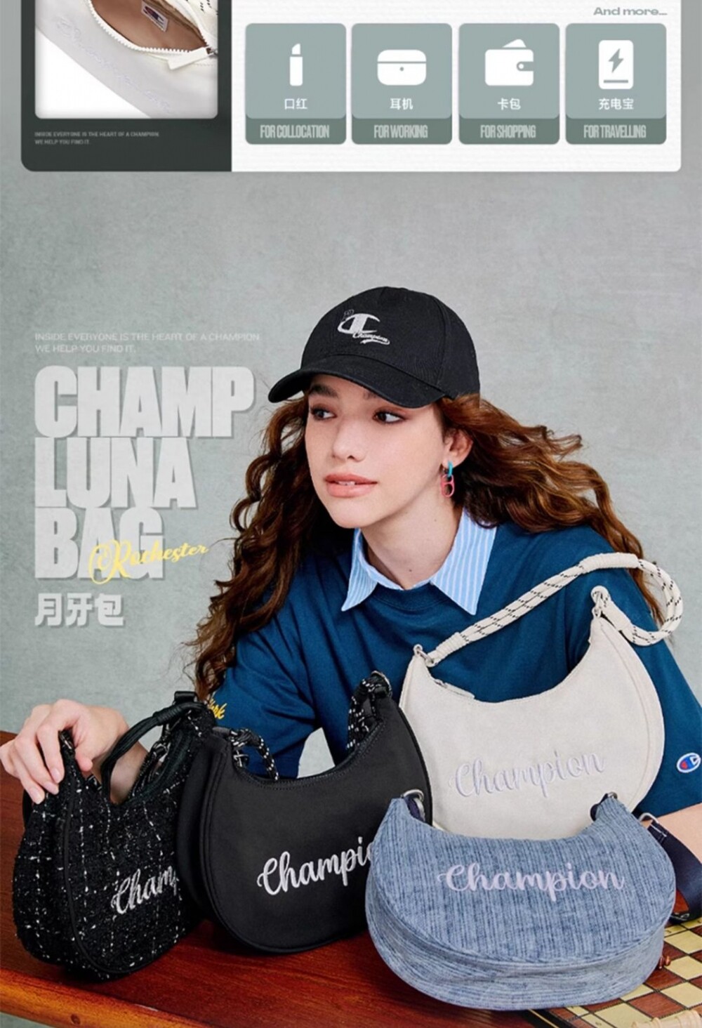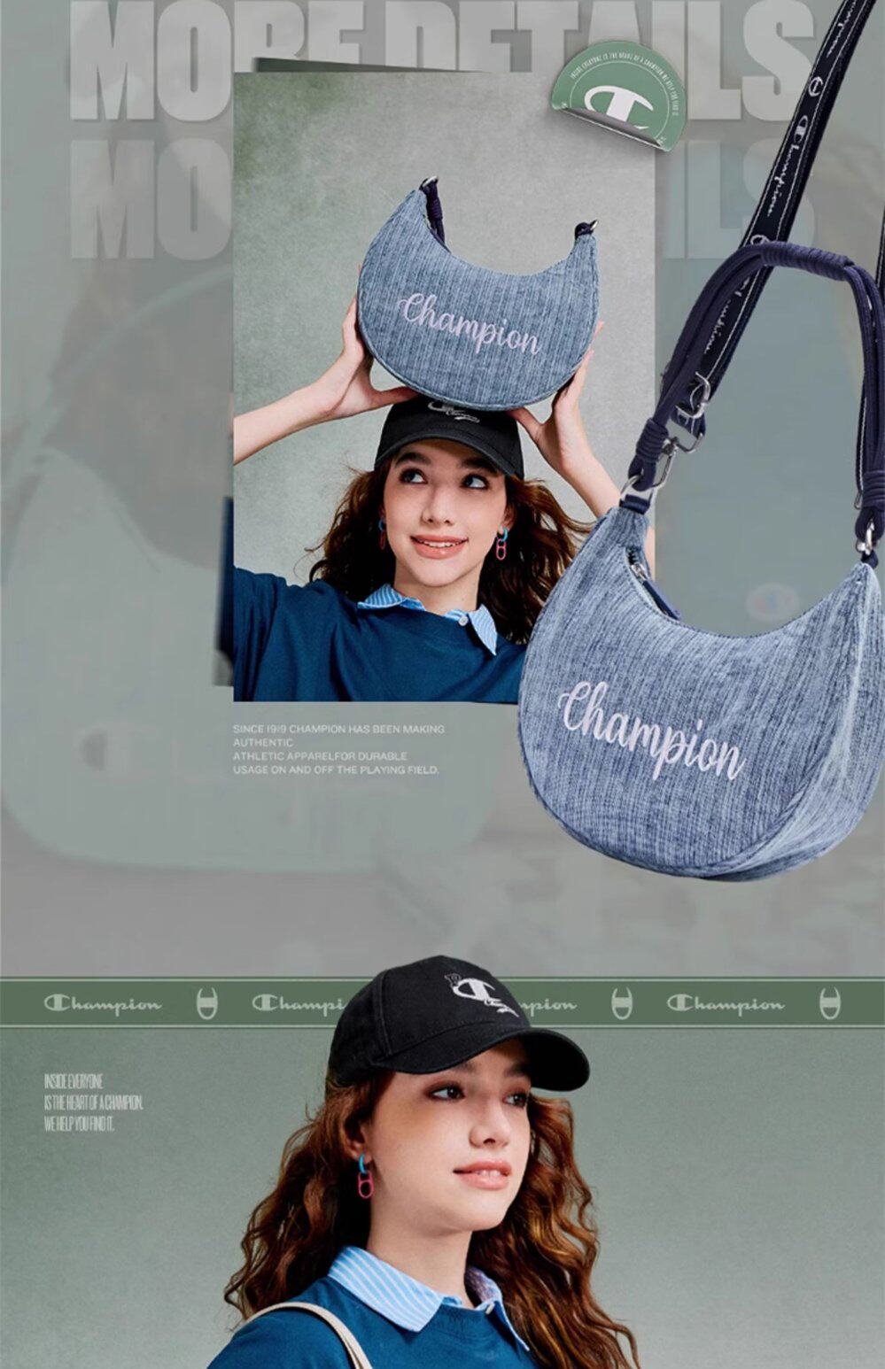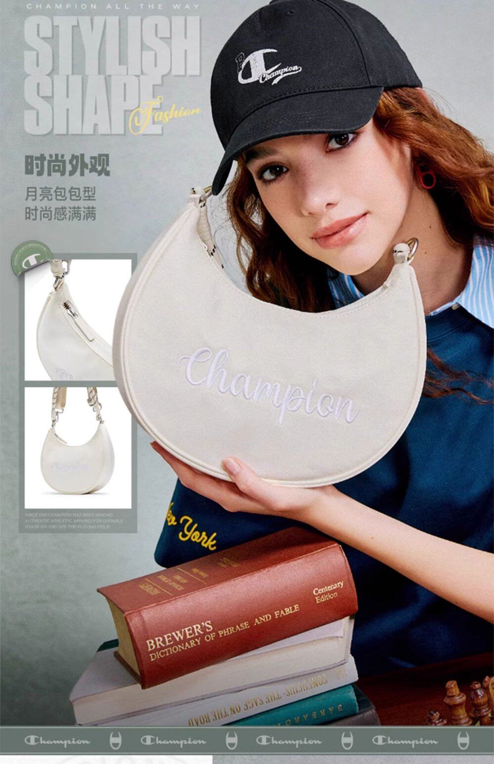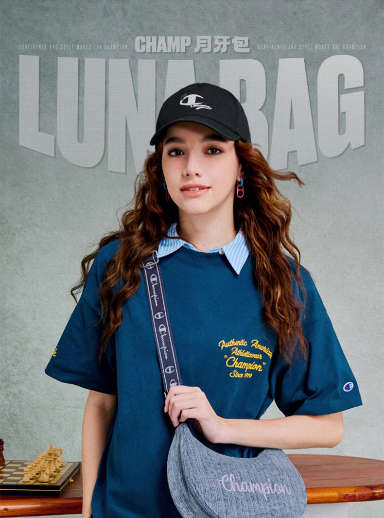 Champion冠軍官方月牙包女腋下包純色刺綉字母單肩斜背背式兩用包