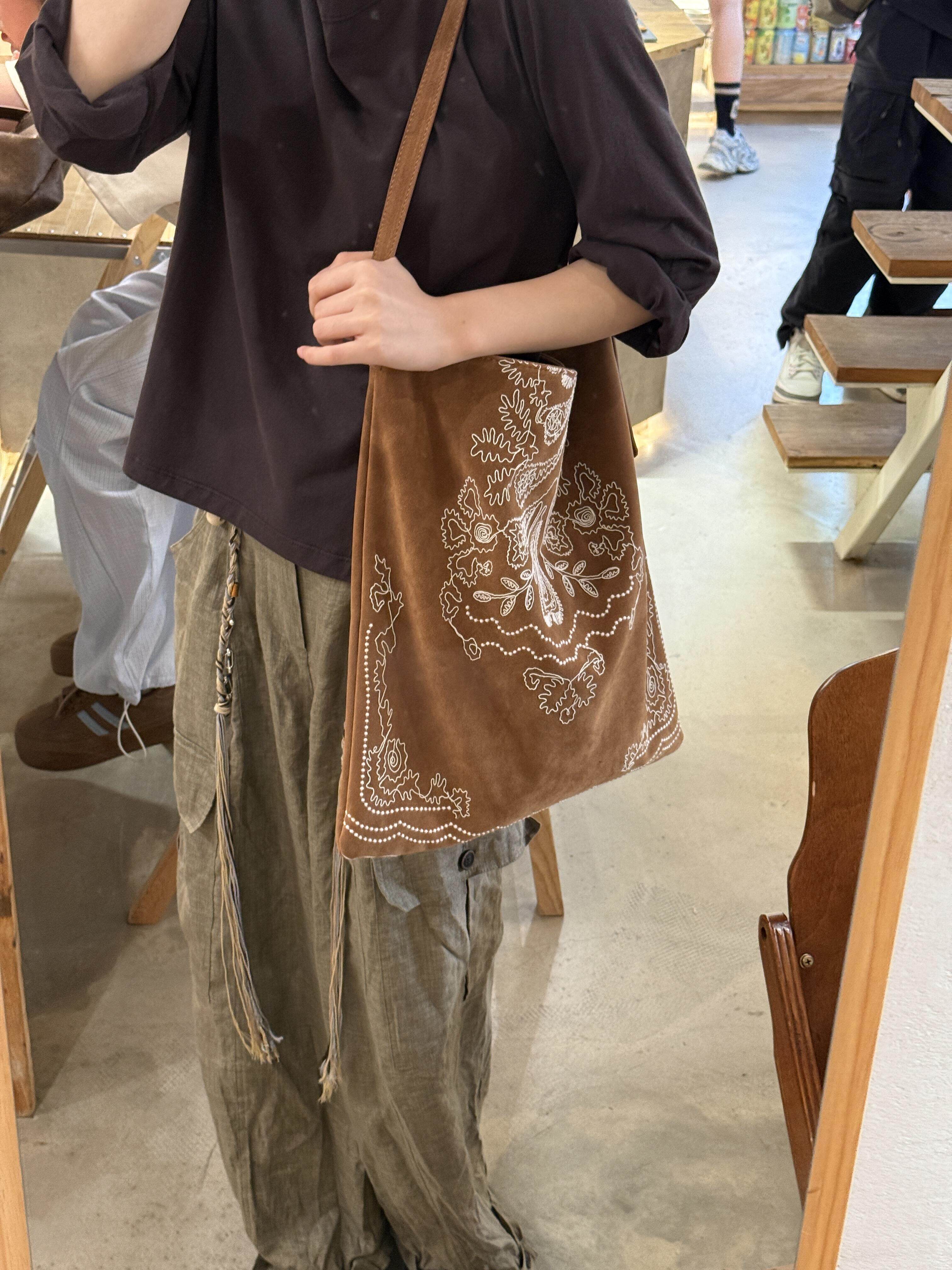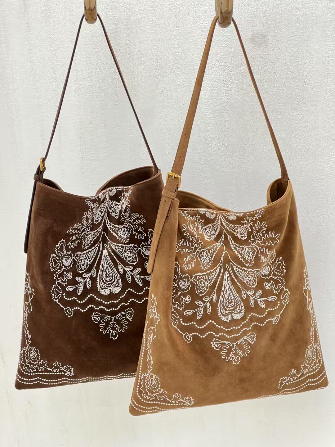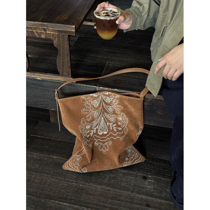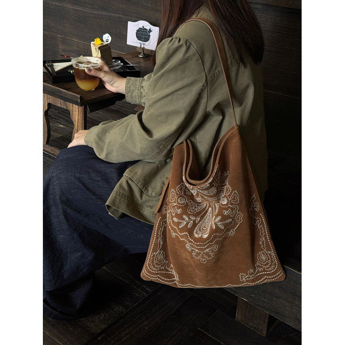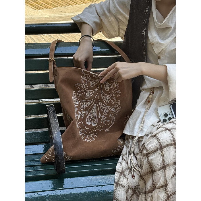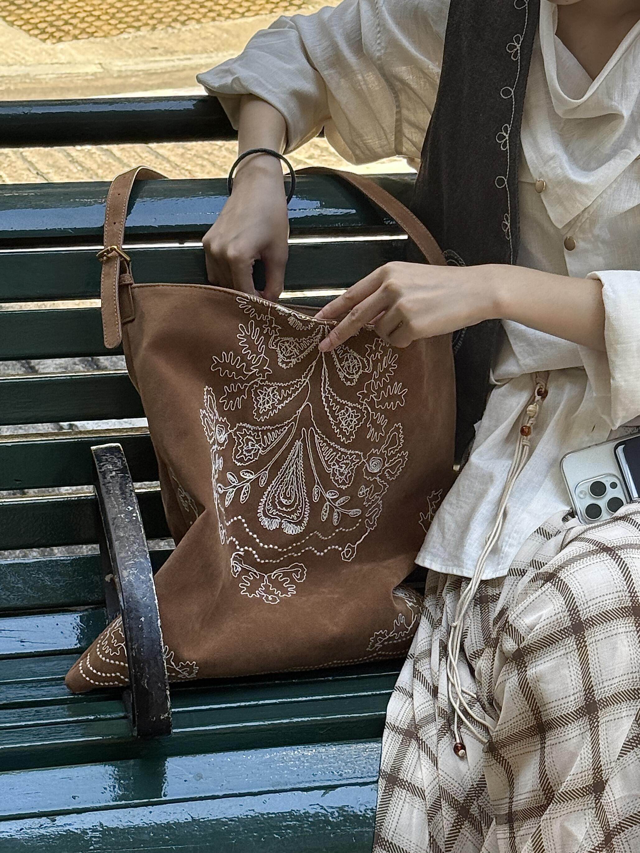 波西米亞風刺綉磨砂皮托特包珠珠大容量復古百搭單肩手提大包包女
