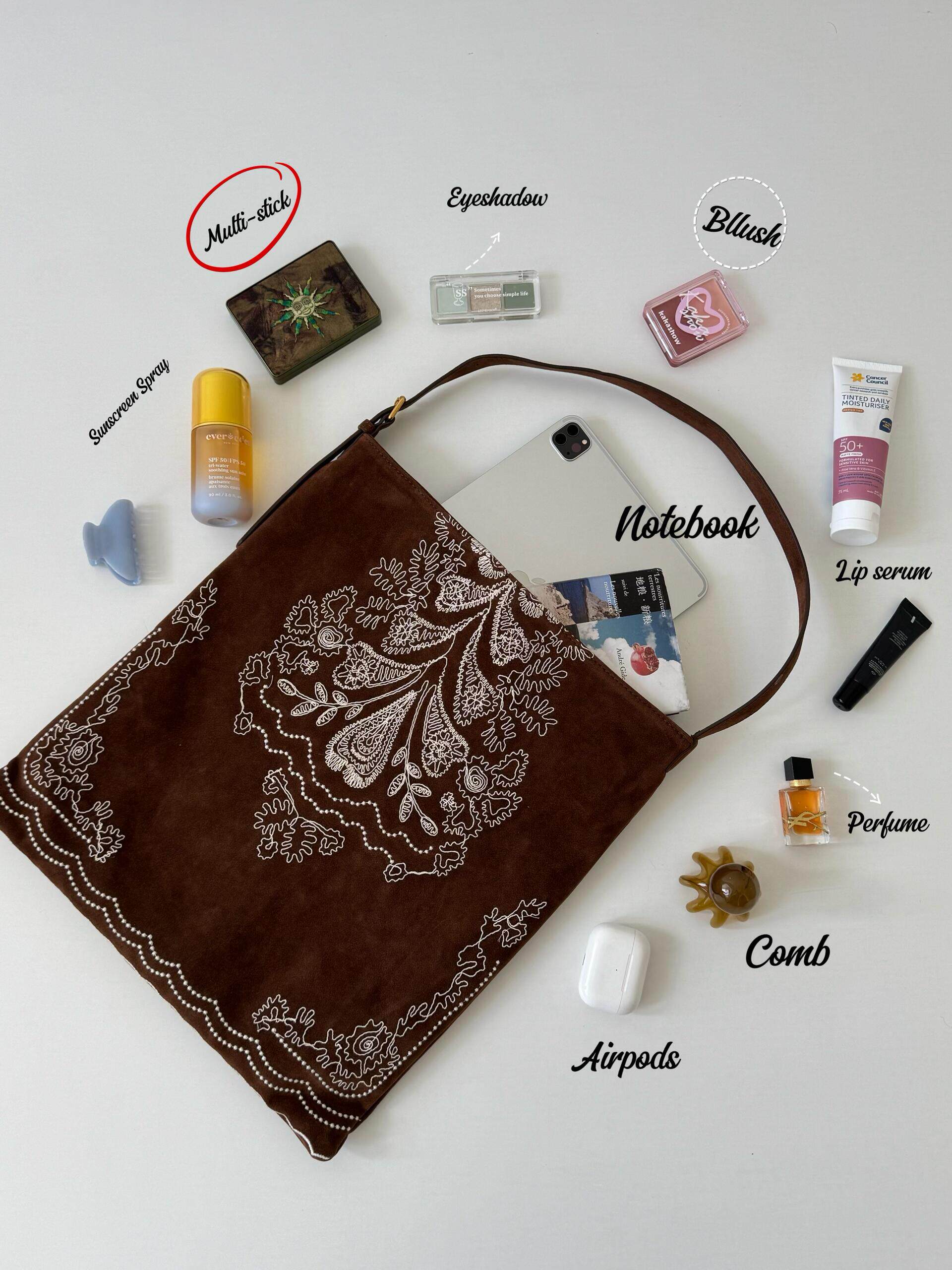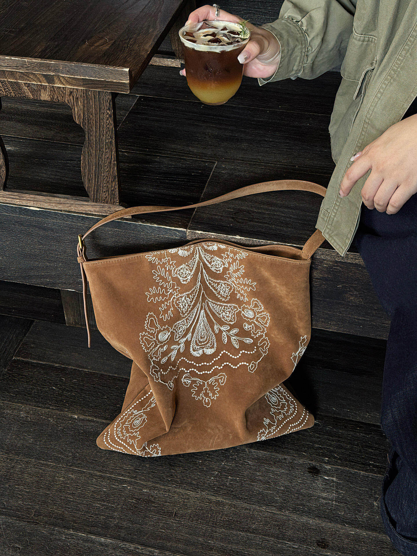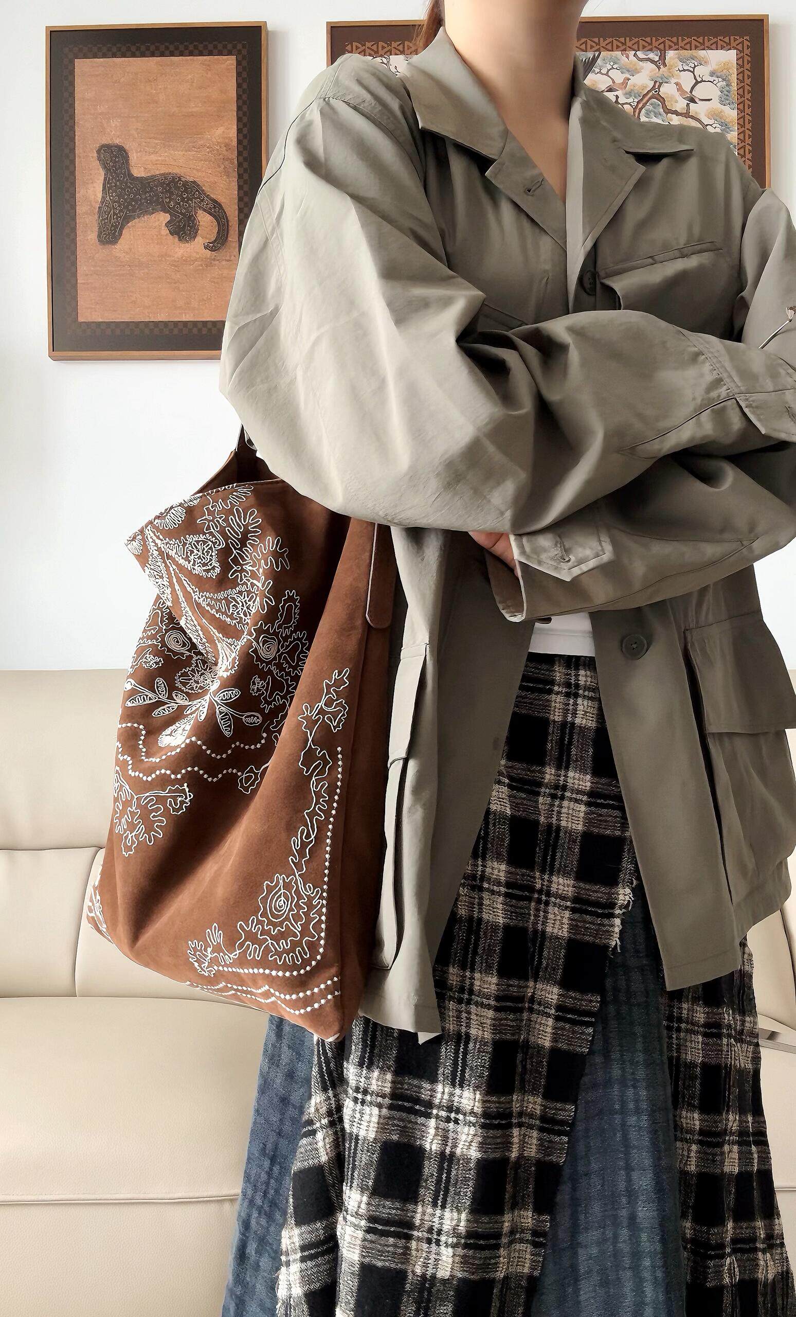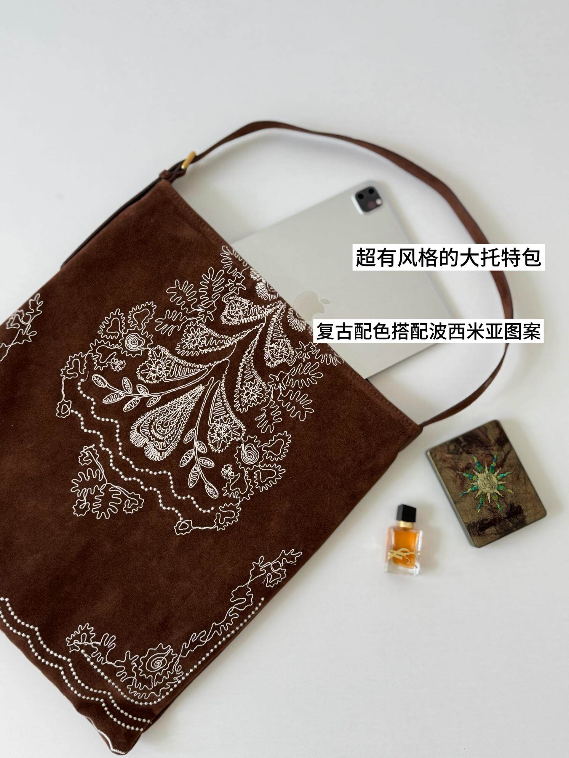 波西米亞風刺綉磨砂皮托特包珠珠大容量復古百搭單肩手提大包包女