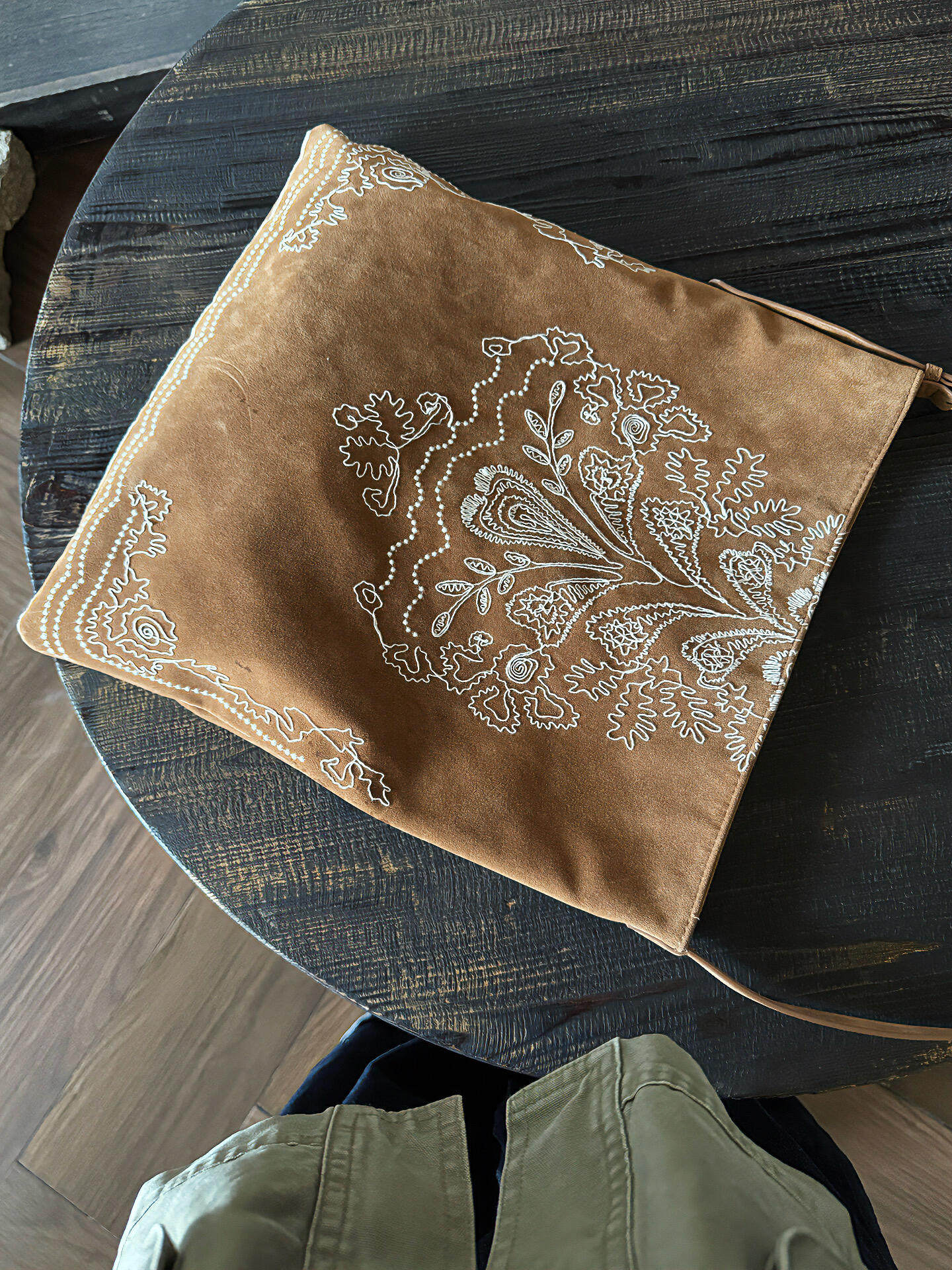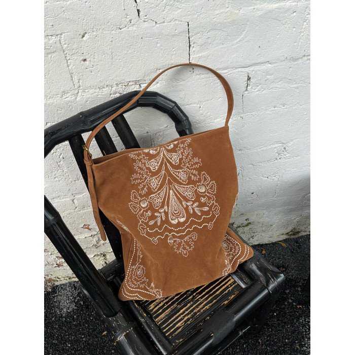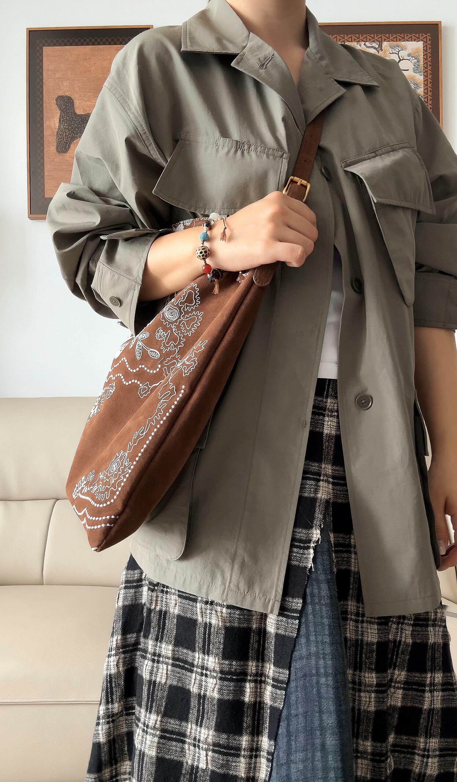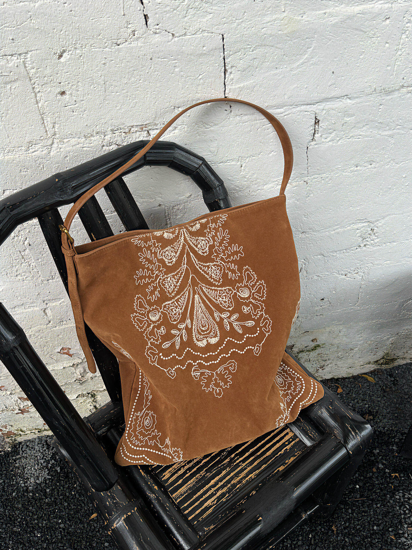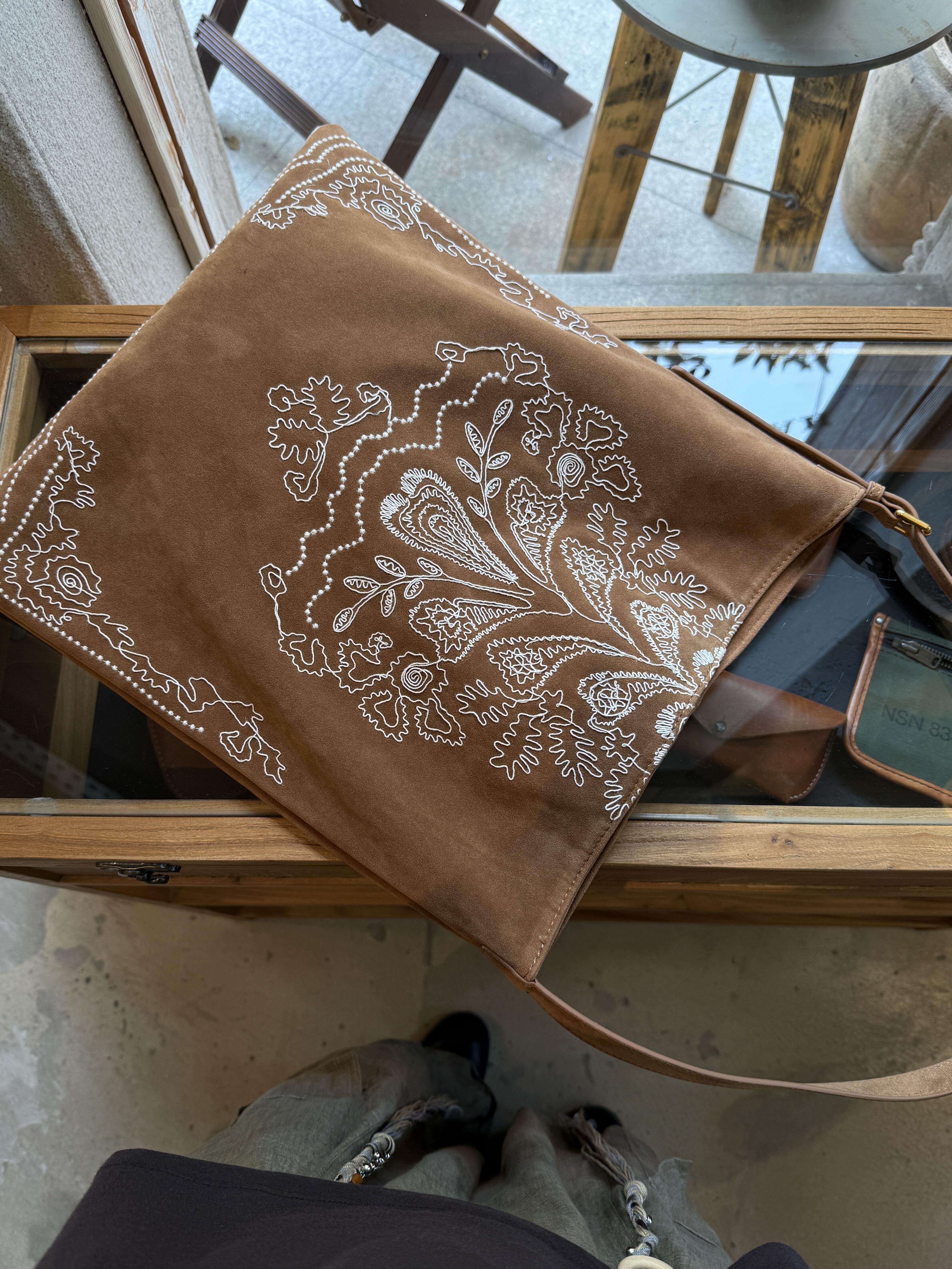 波西米亞風刺綉磨砂皮托特包珠珠大容量復古百搭單肩手提大包包女