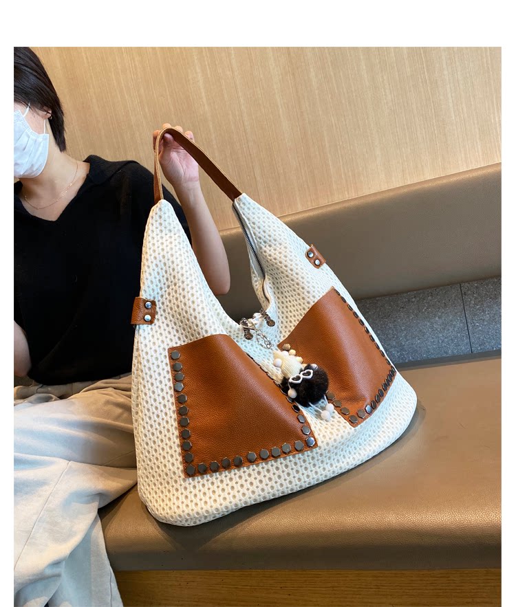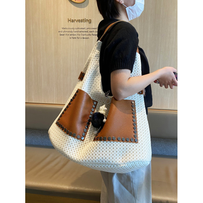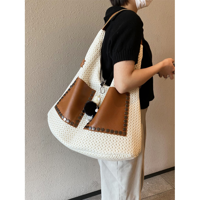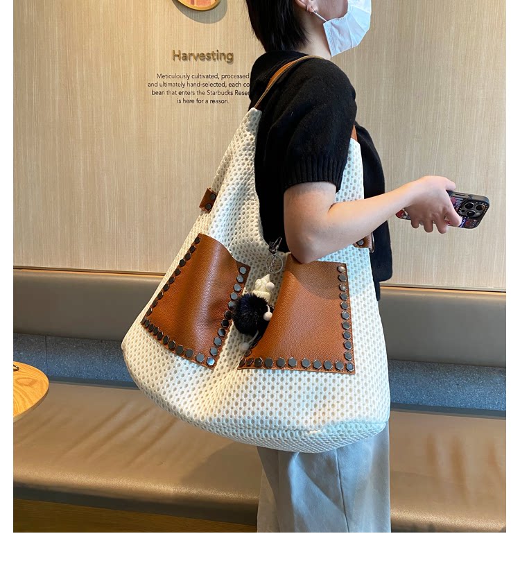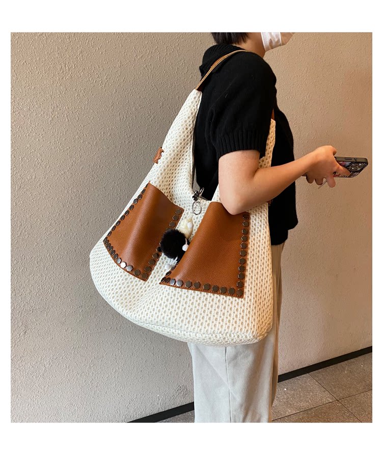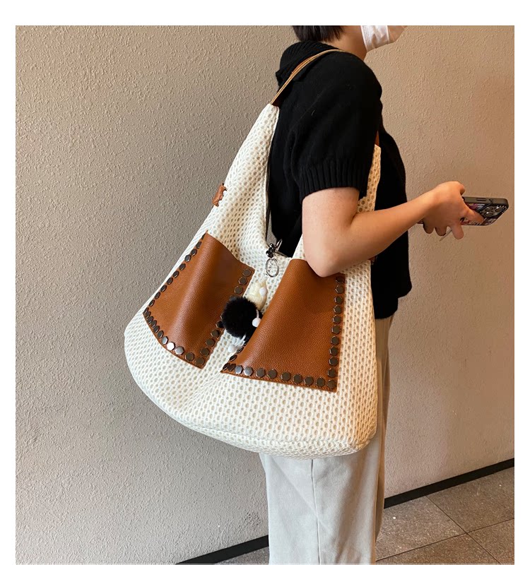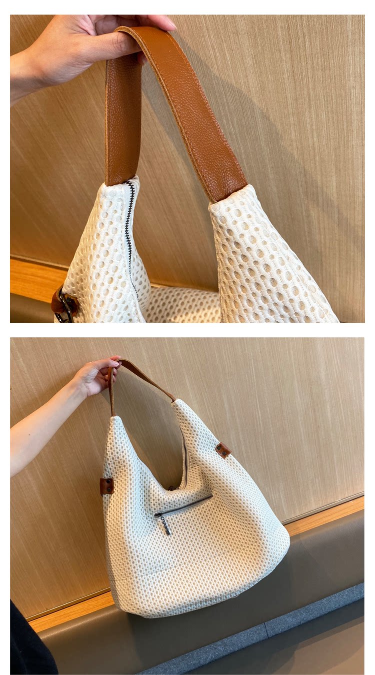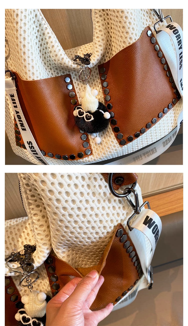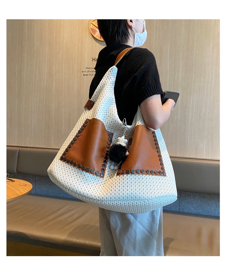 歐美風高級感大托特包2026女式鏤空網格布拼真皮單肩購物袋斜後後背包