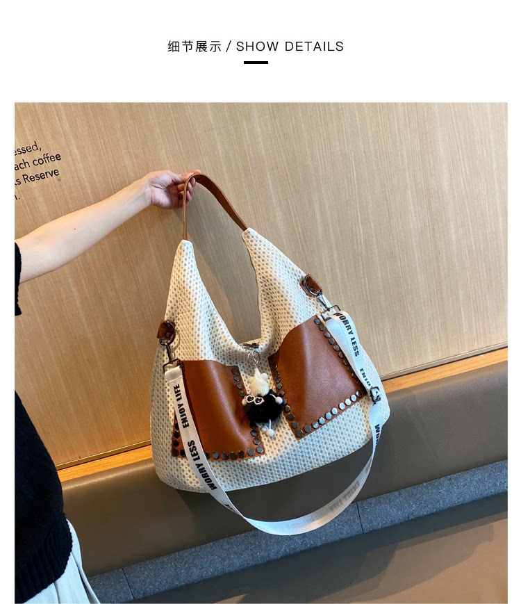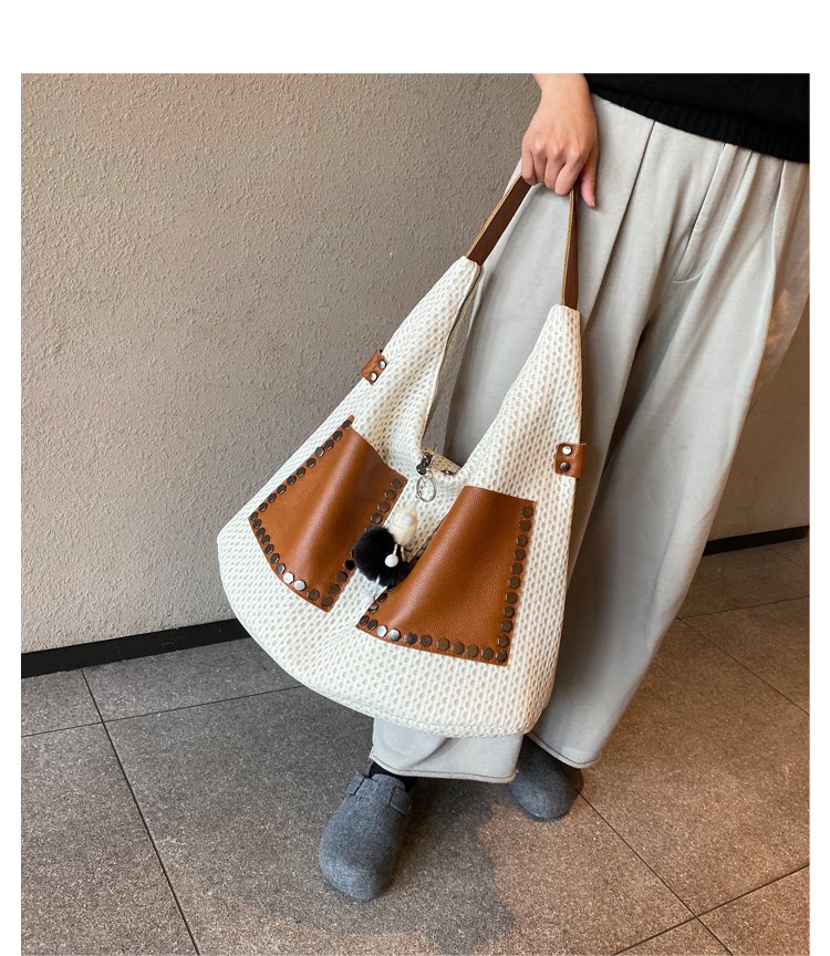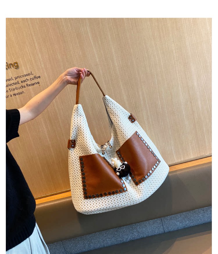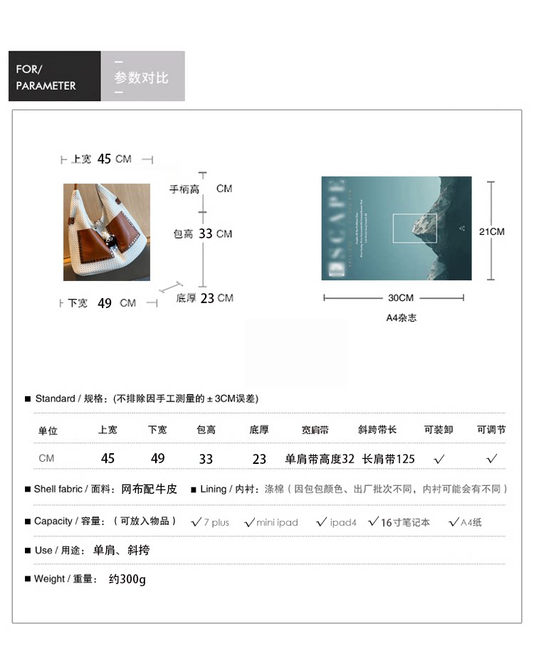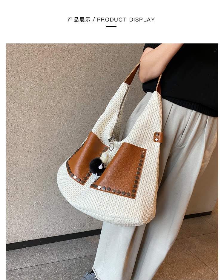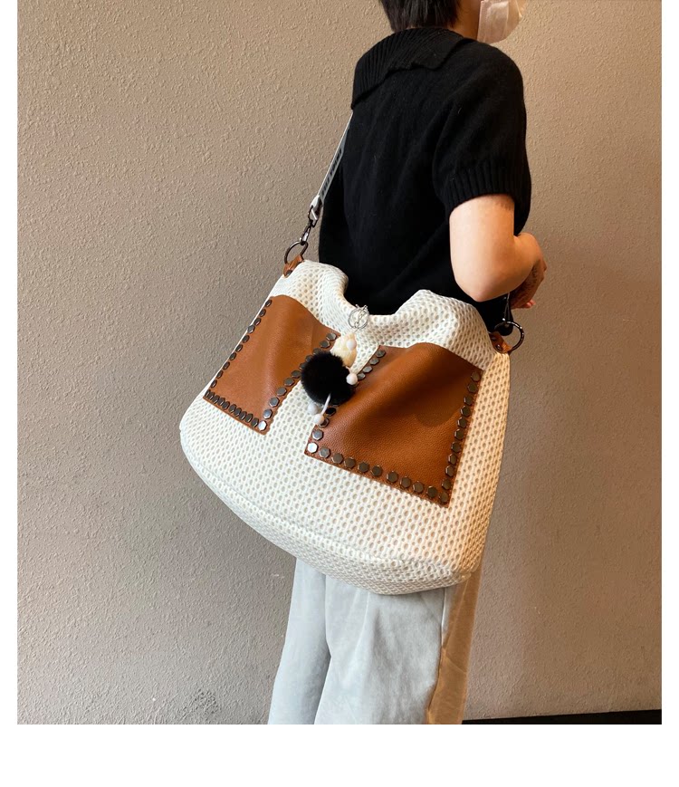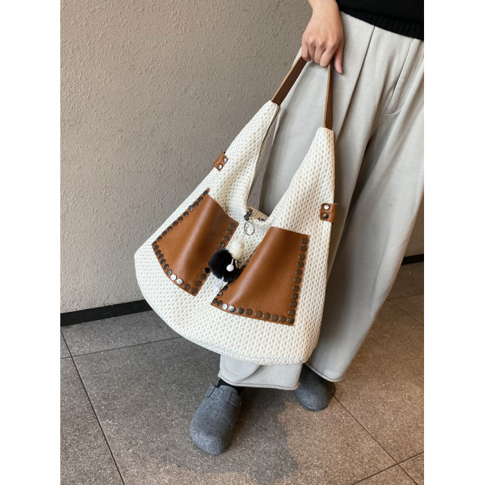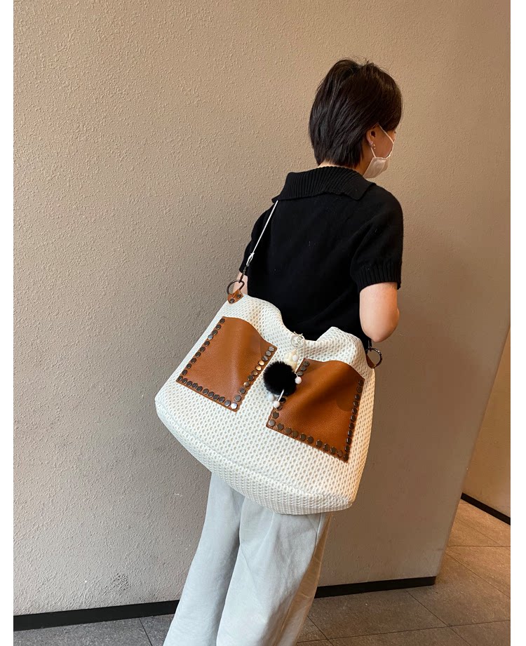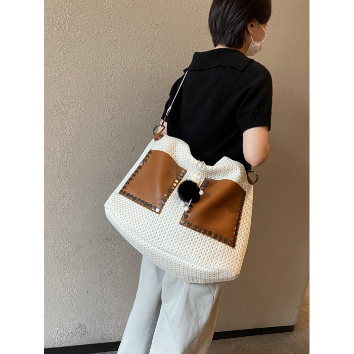 歐美風高級感大托特包2026女式鏤空網格布拼真皮單肩購物袋斜後後背包