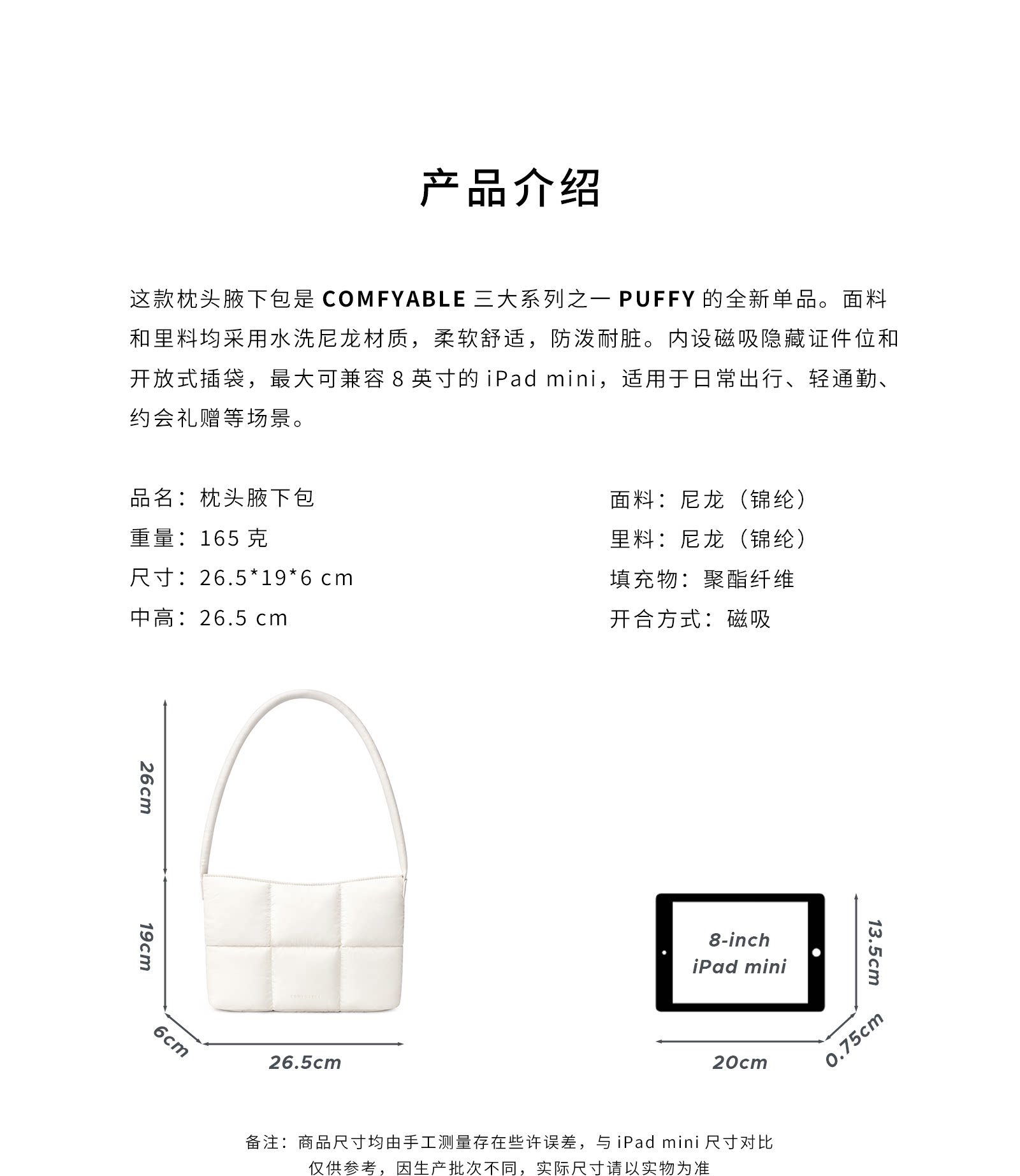 Comfyable腋下包女式磁吸單肩包通勤簡約輕便適用iPadmini7/6白色