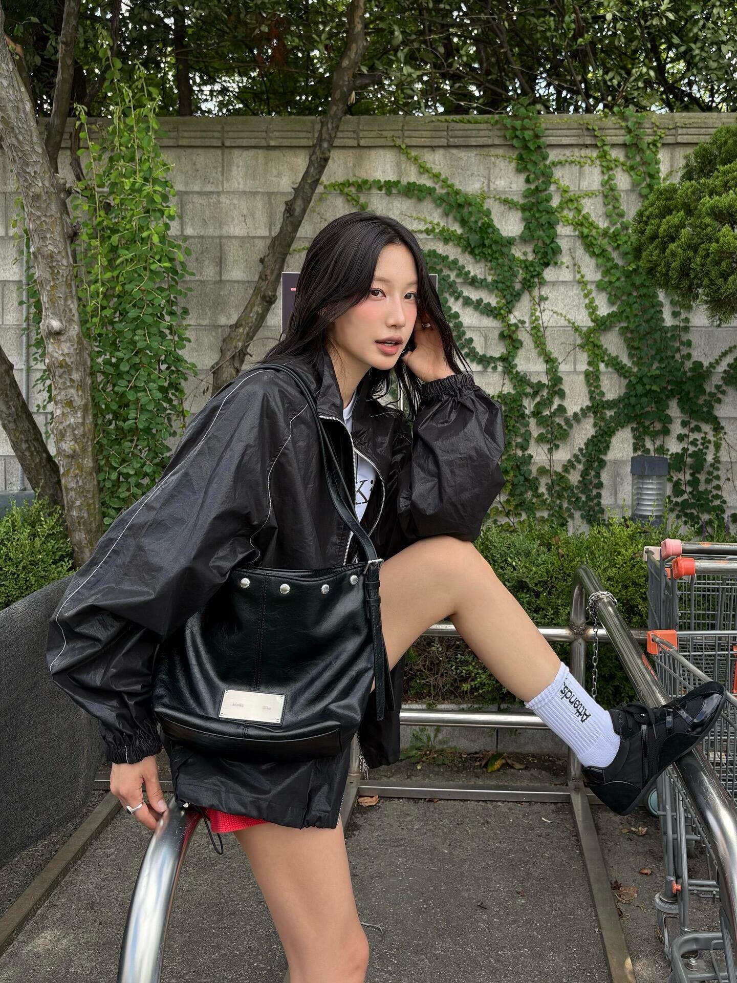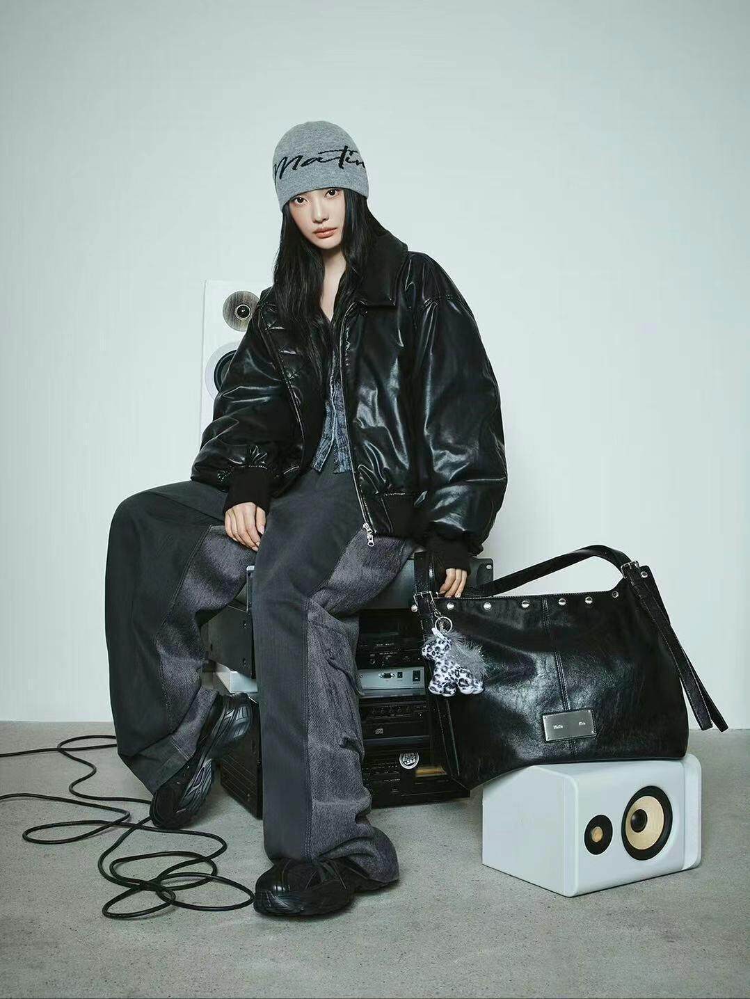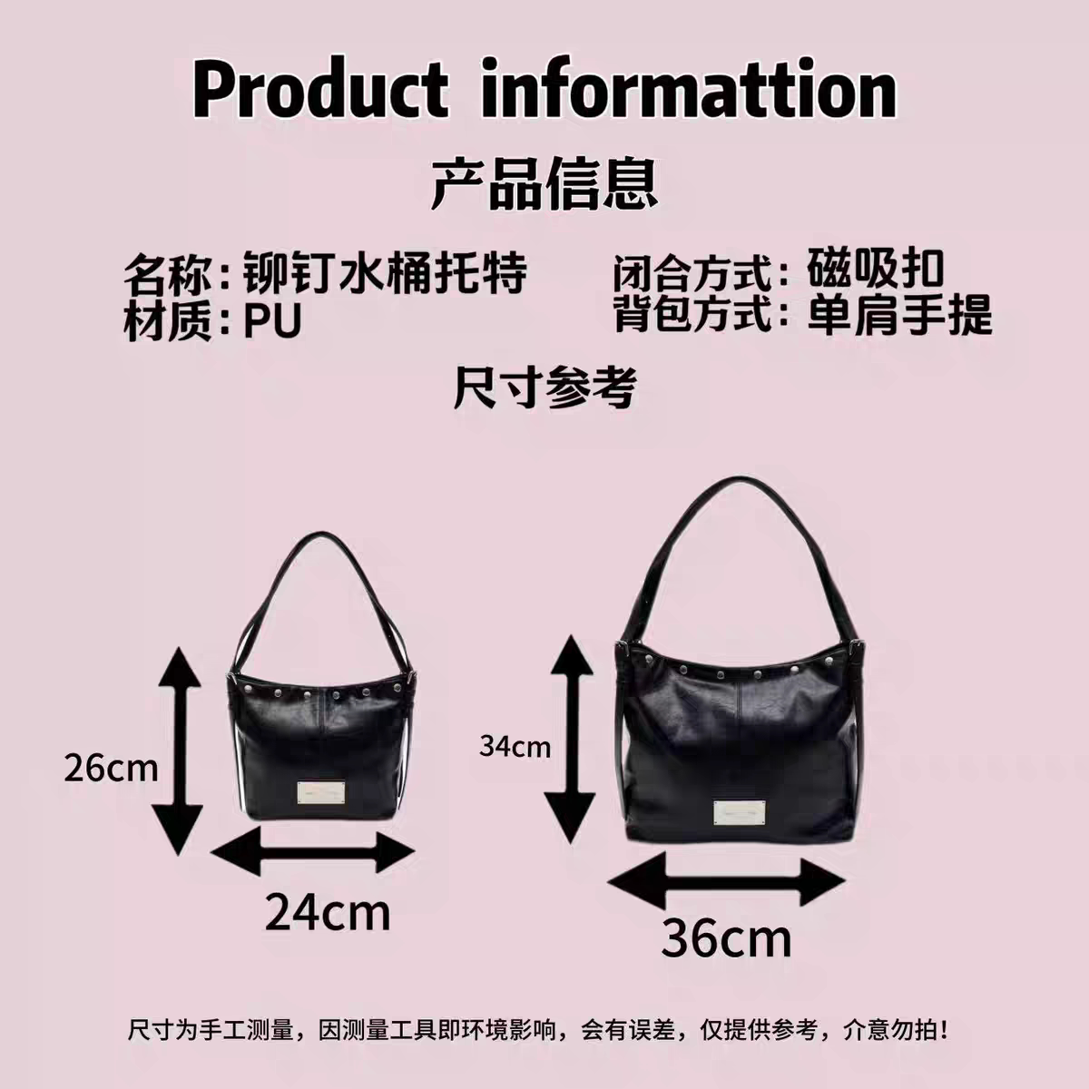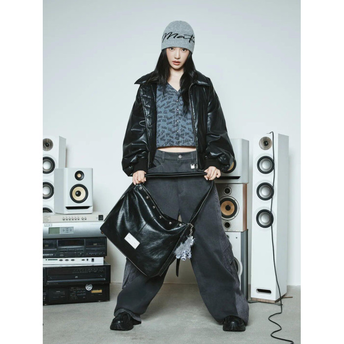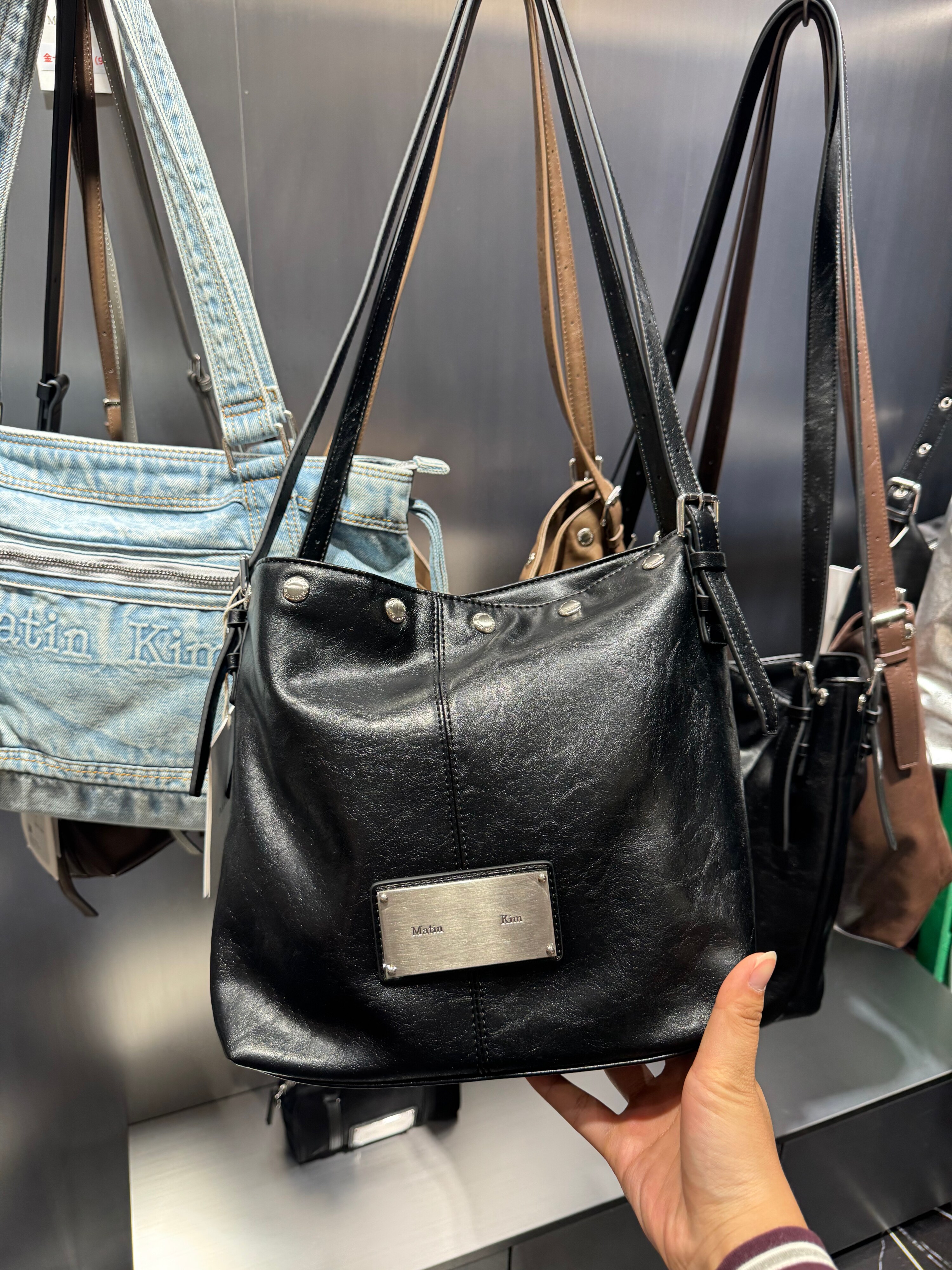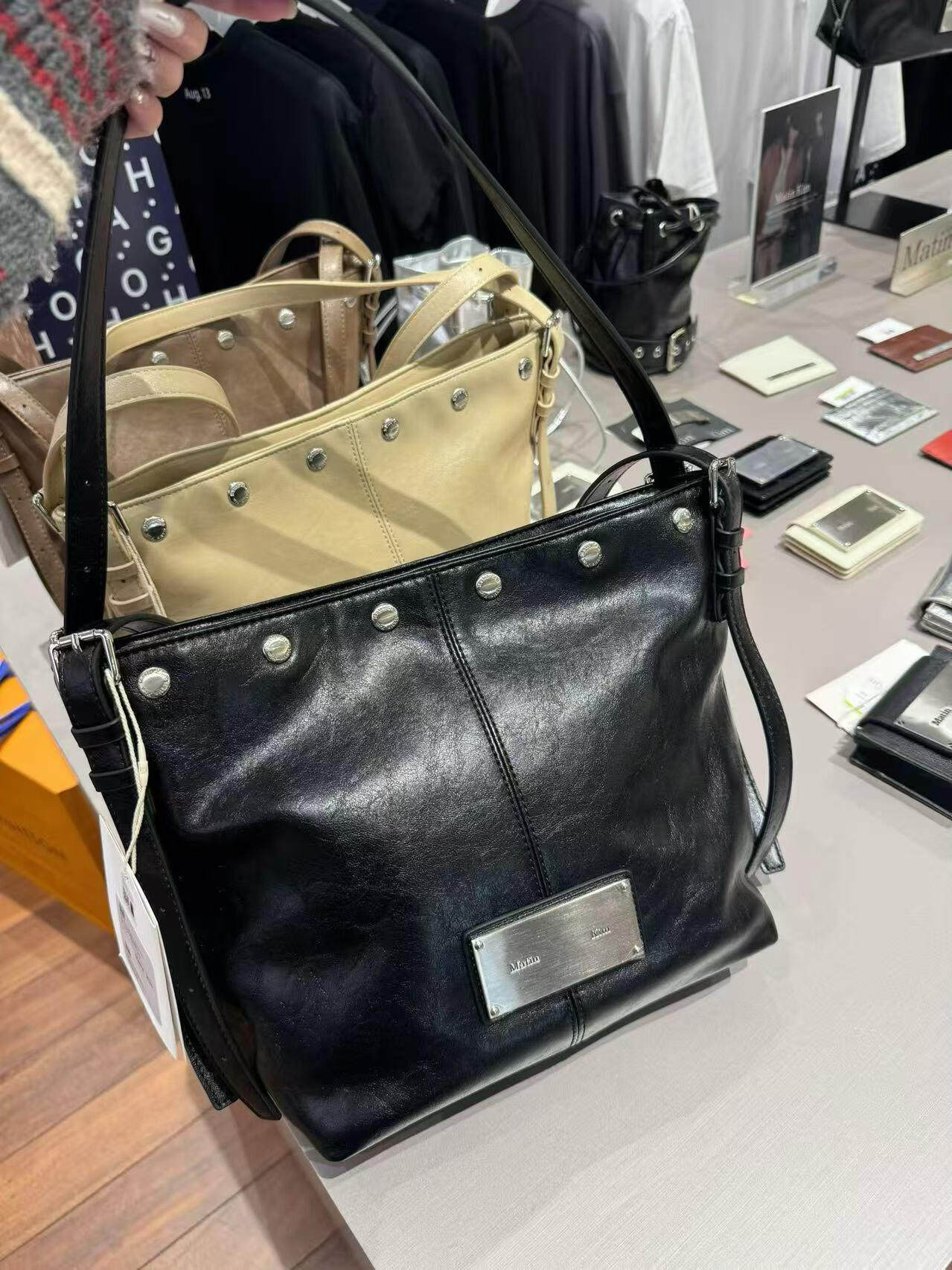 韓國Matin kim托特包油蠟皮腋下包鉚釘單肩手提包百搭機車水桶包