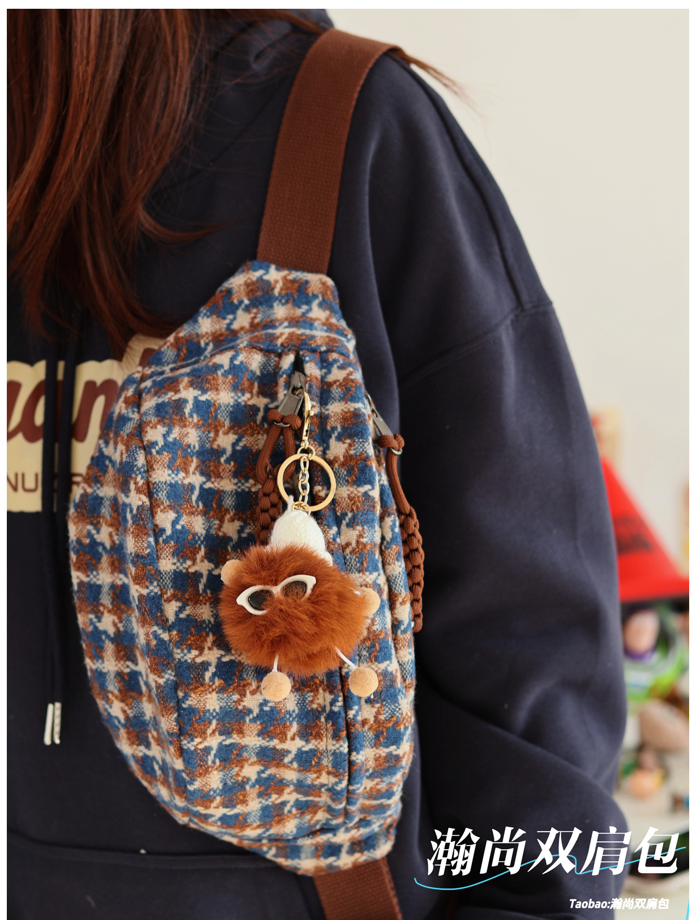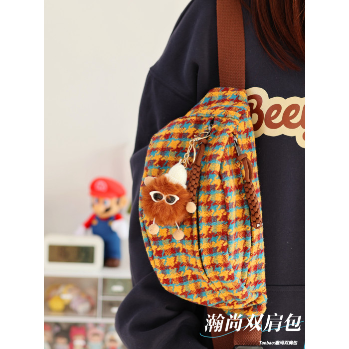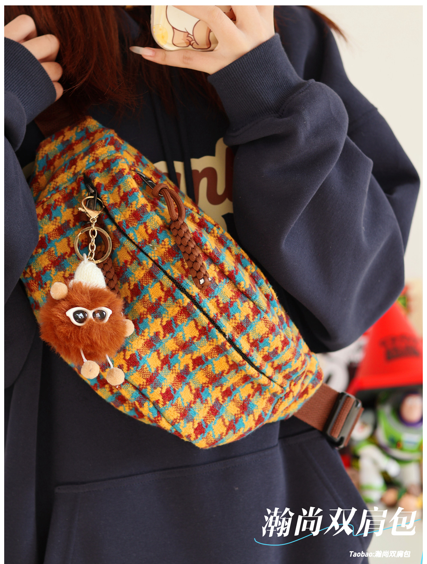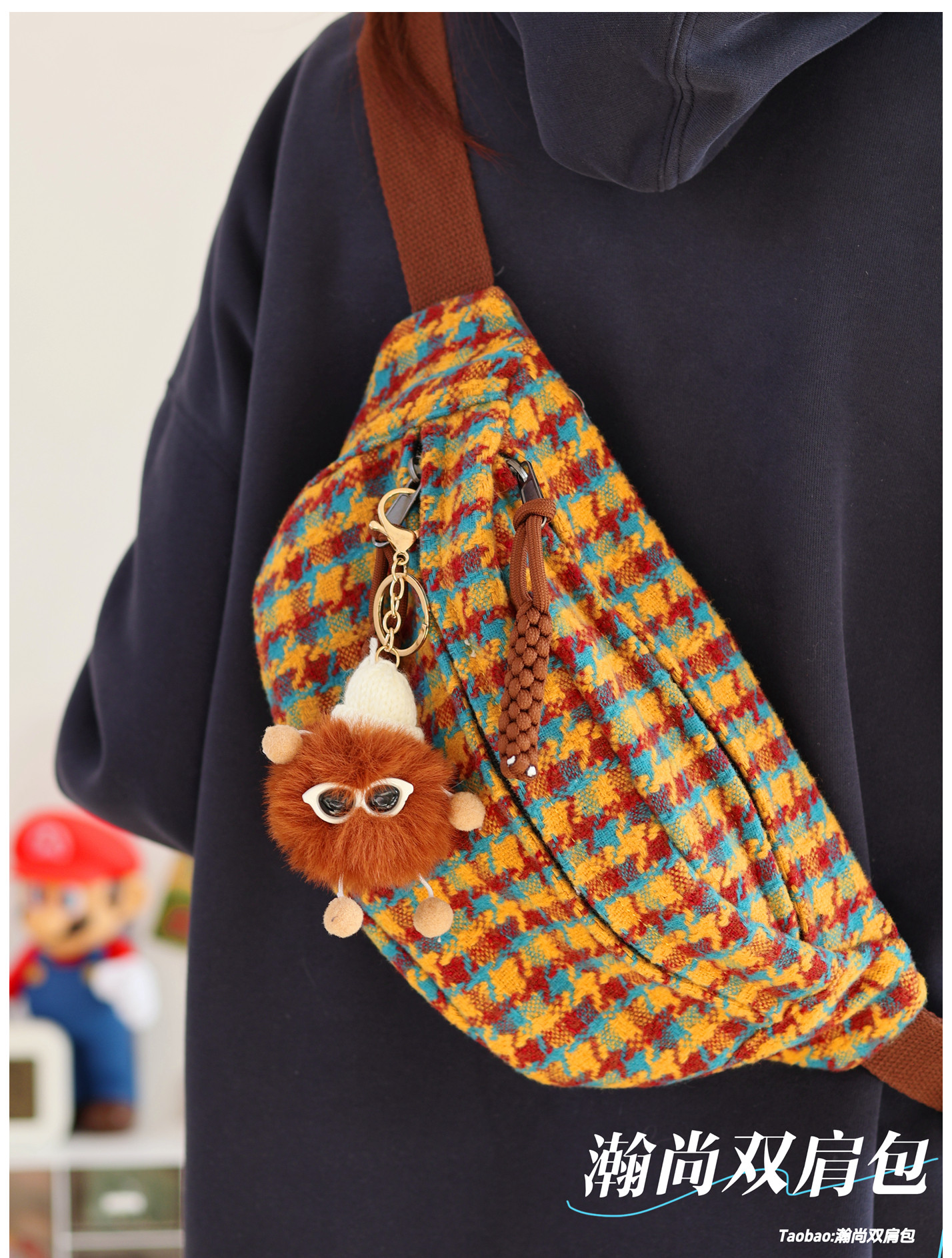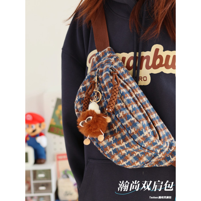 日系ins胸包女2026新款潮毛呢斜後後背包小衆千鳥格子輕便小香風腰包
