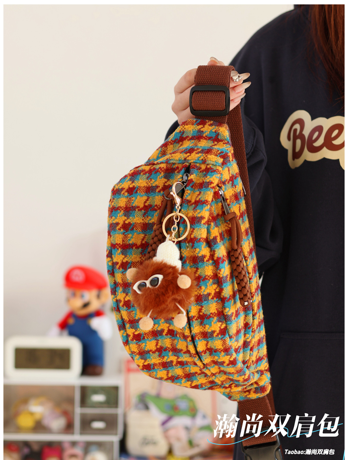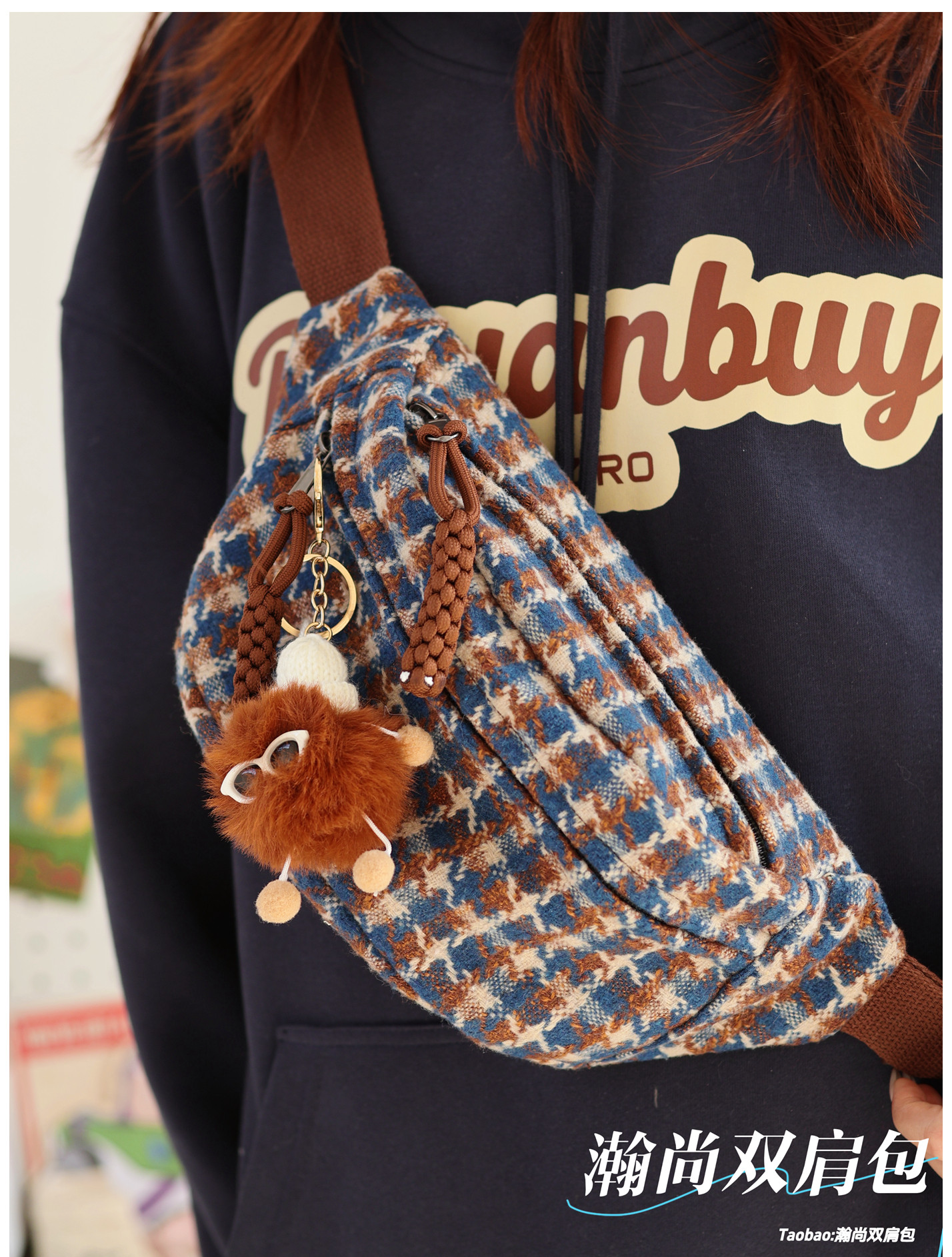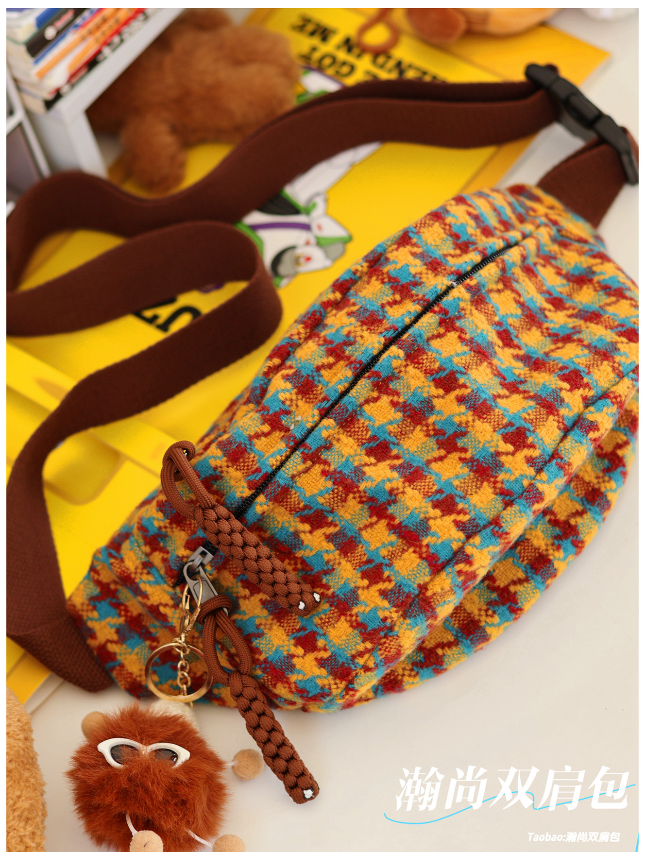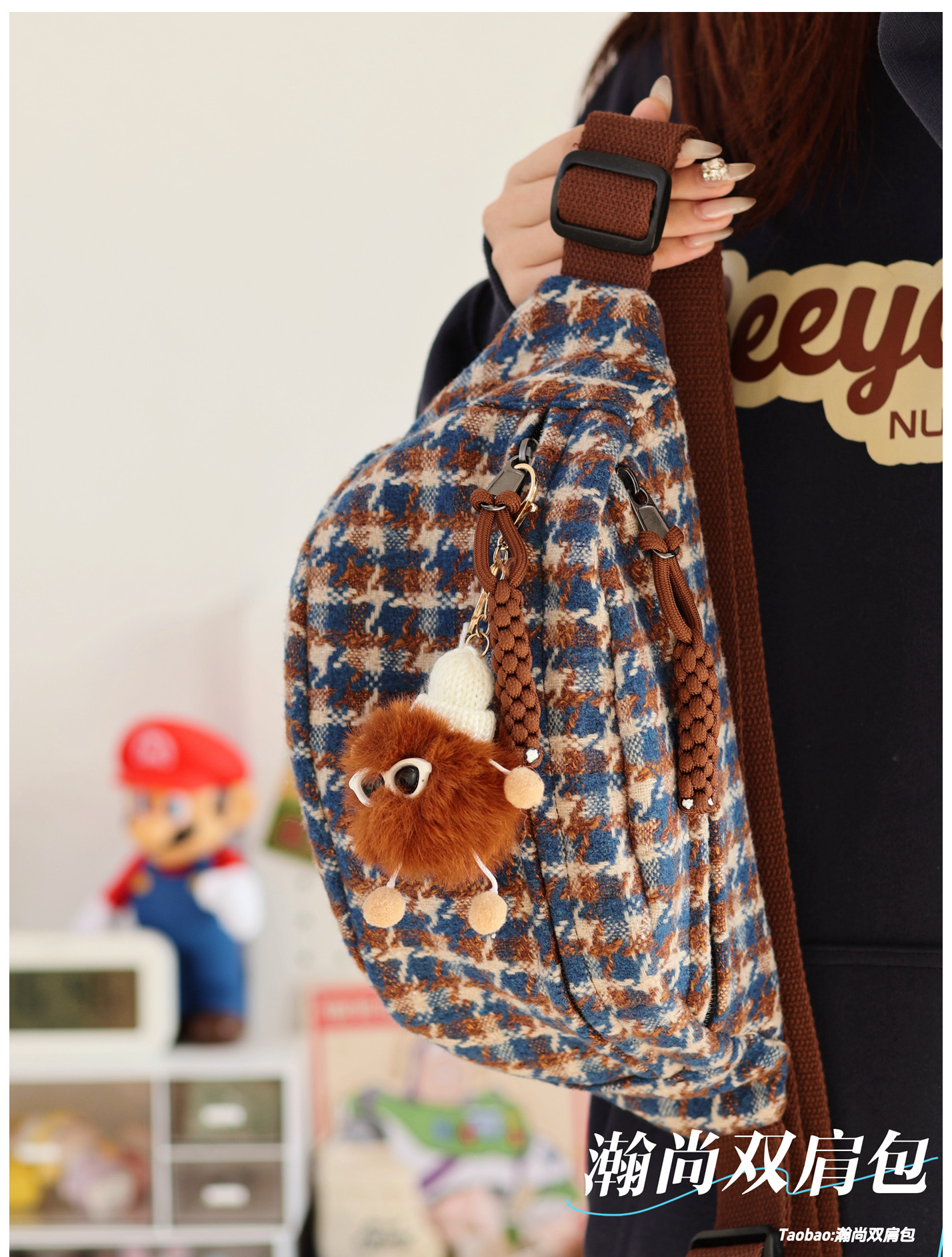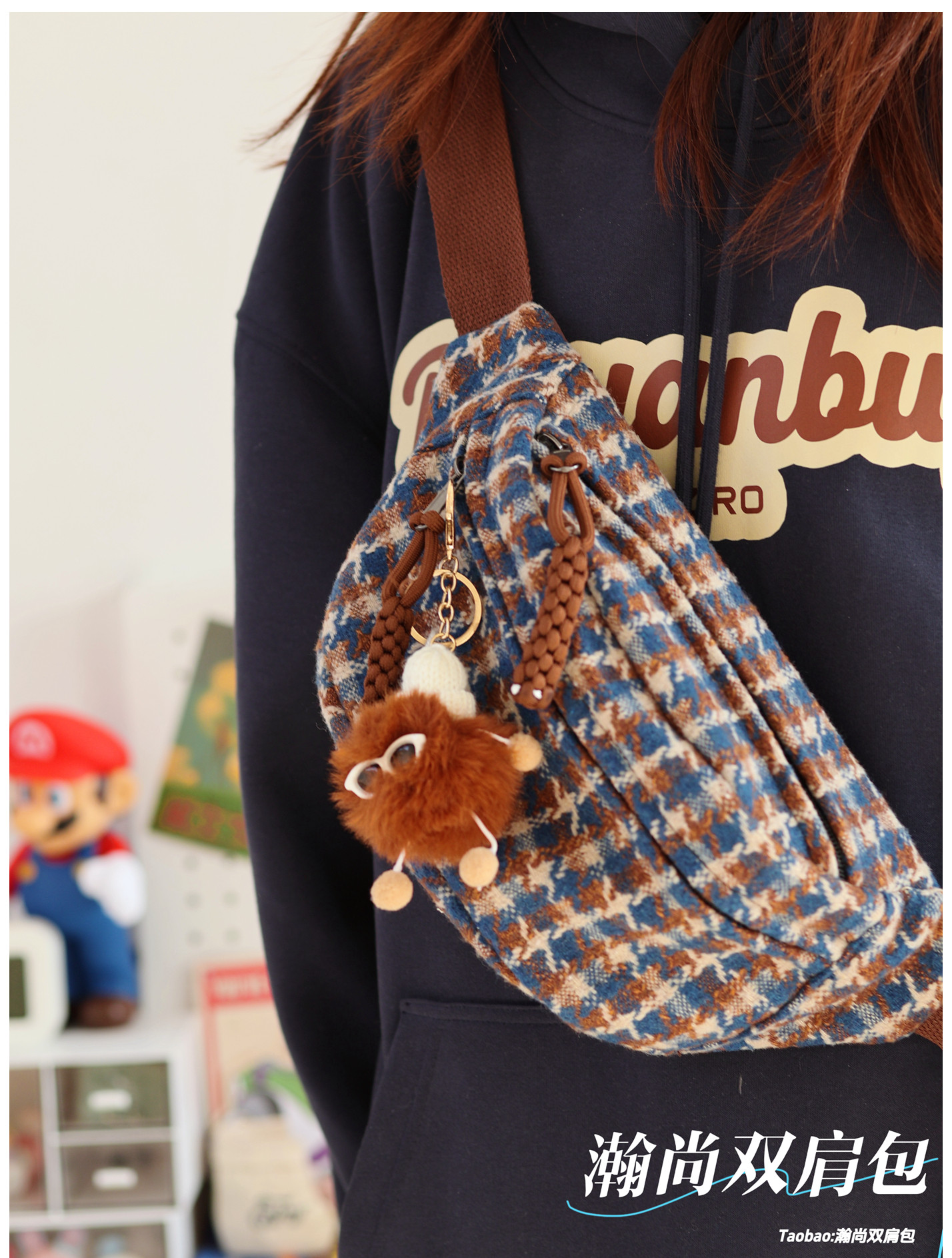 日系ins胸包女2026新款潮毛呢斜後後背包小衆千鳥格子輕便小香風腰包