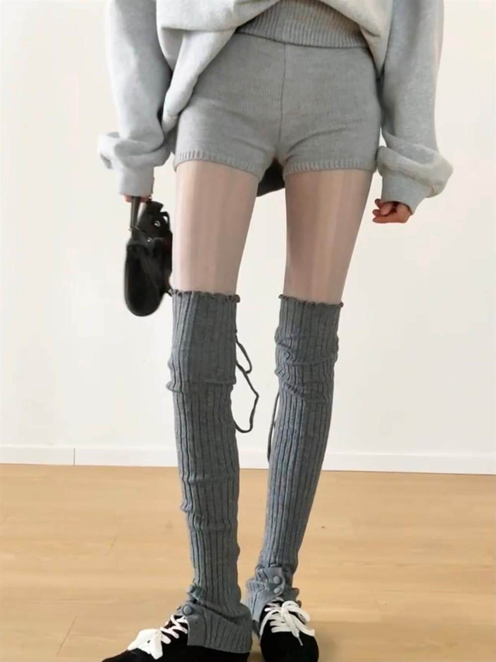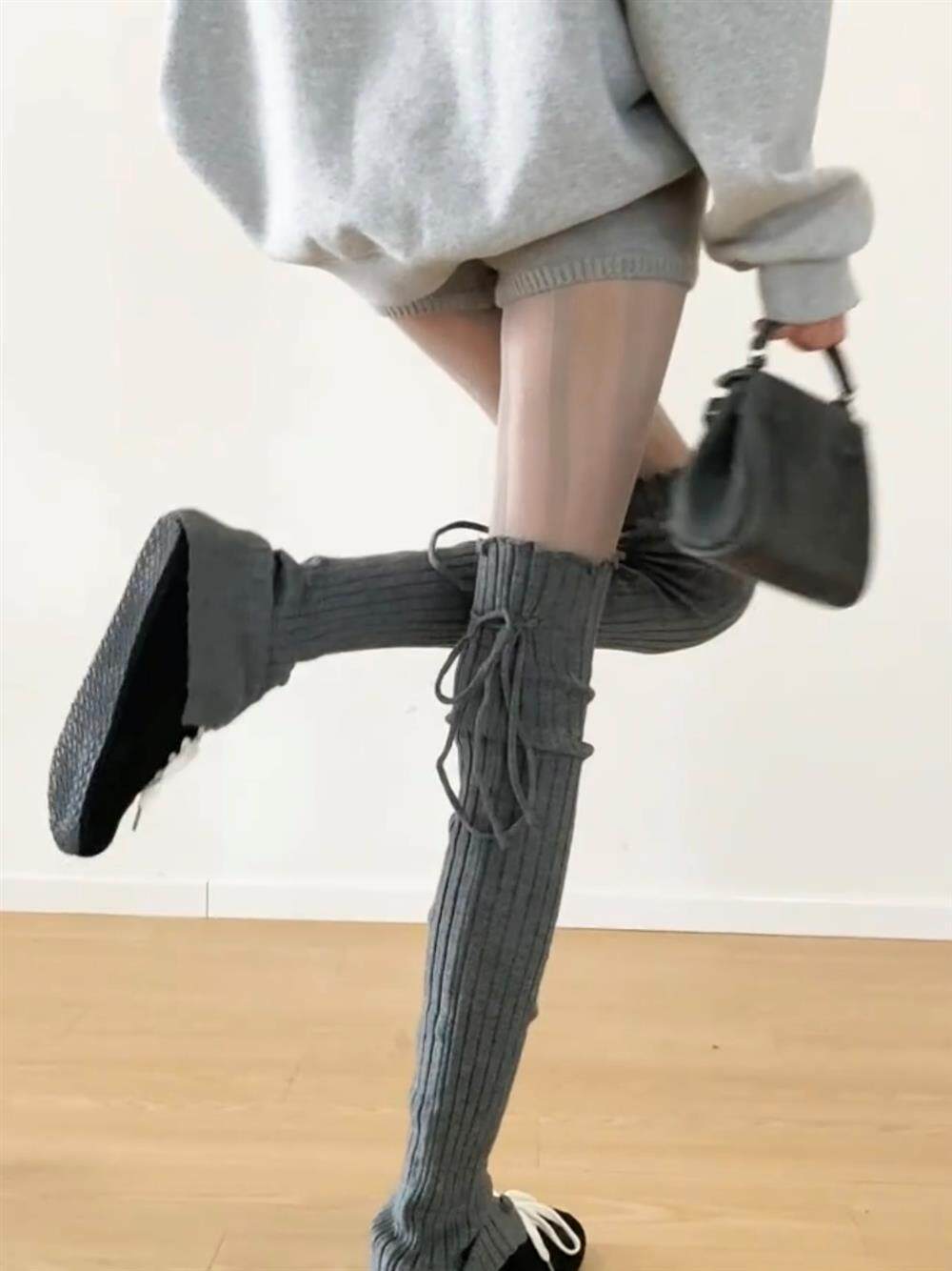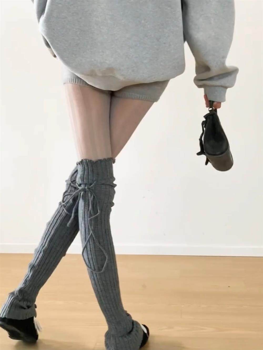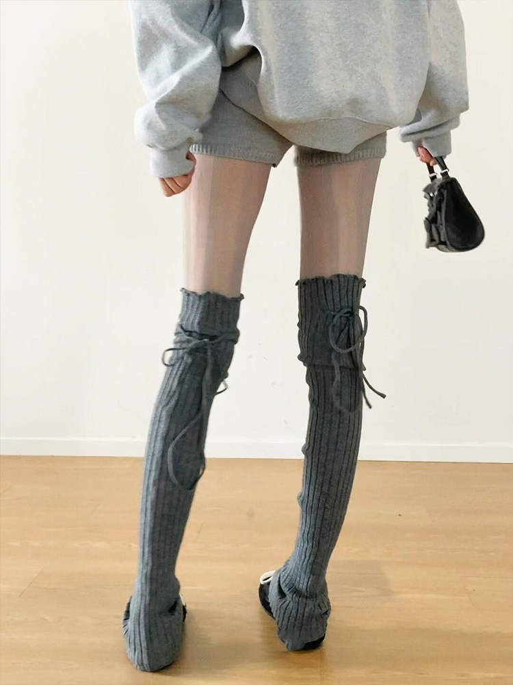 FLGG芭蕾風設計感鈕釦走秀款綁帶百搭顯瘦小衆寬條堆堆腿套咖色腿