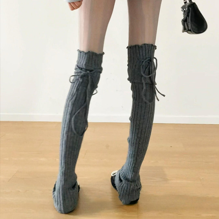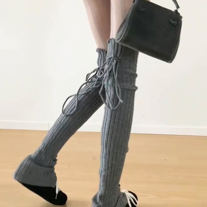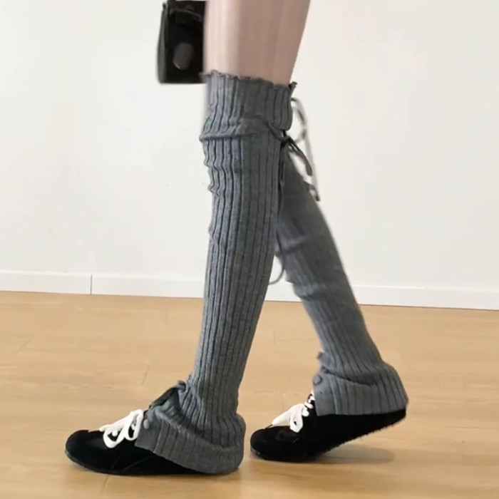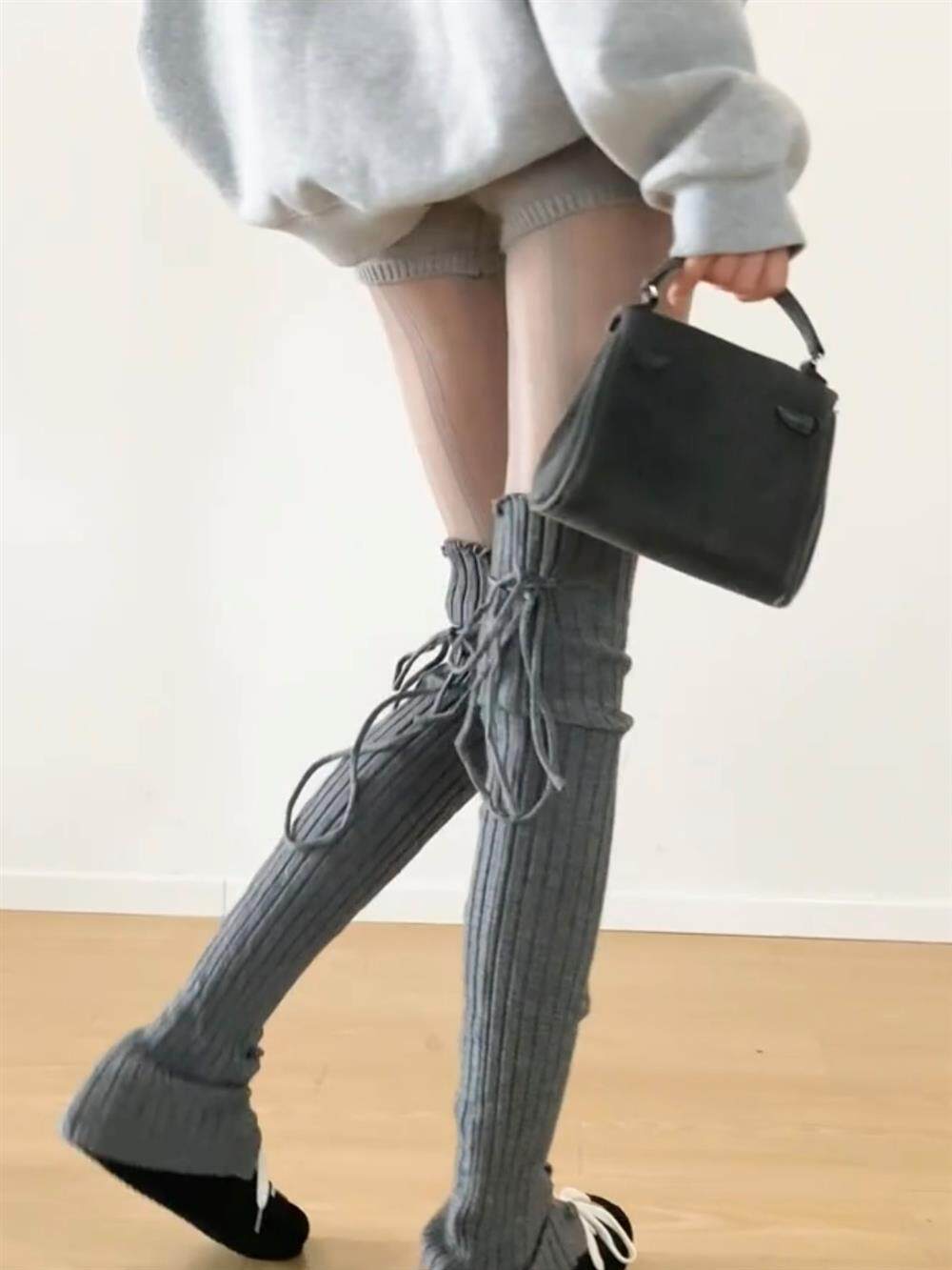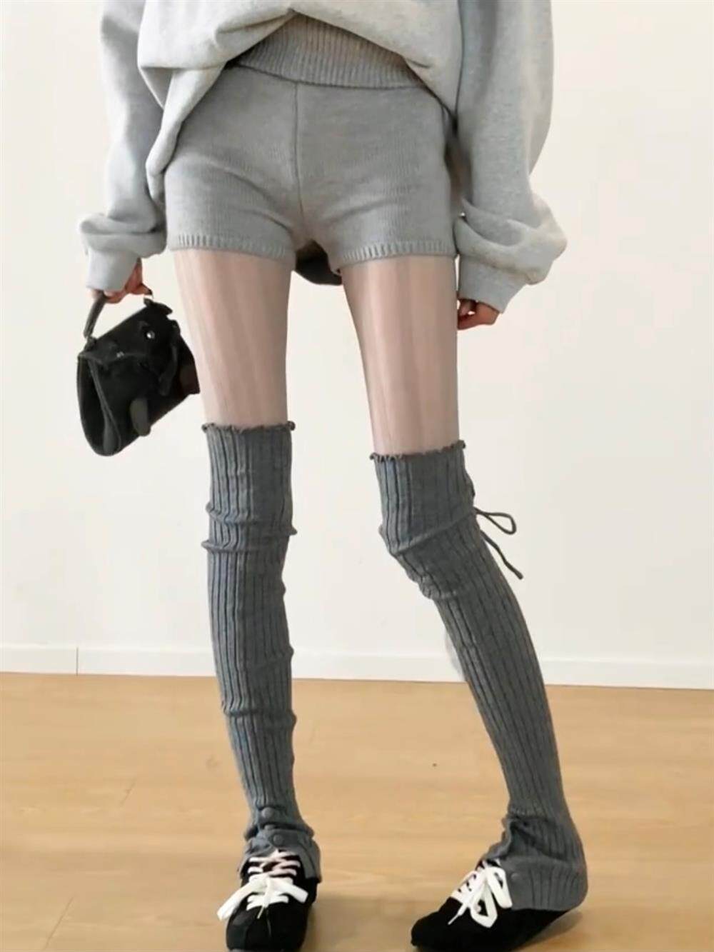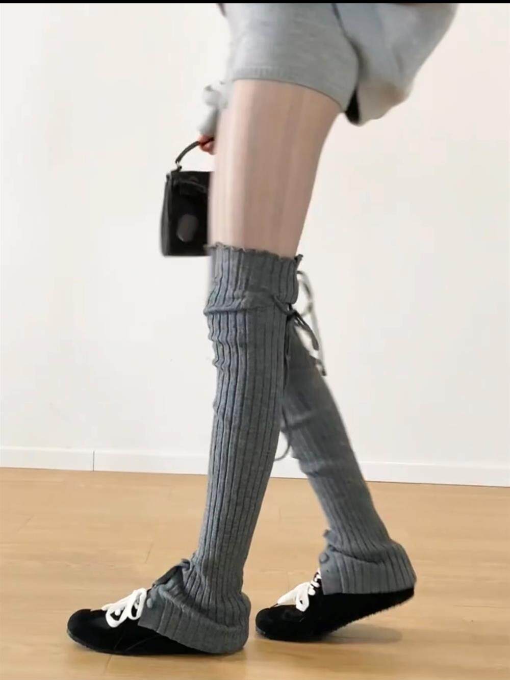 FLGG芭蕾風設計感鈕釦走秀款綁帶百搭顯瘦小衆寬條堆堆腿套咖色腿
