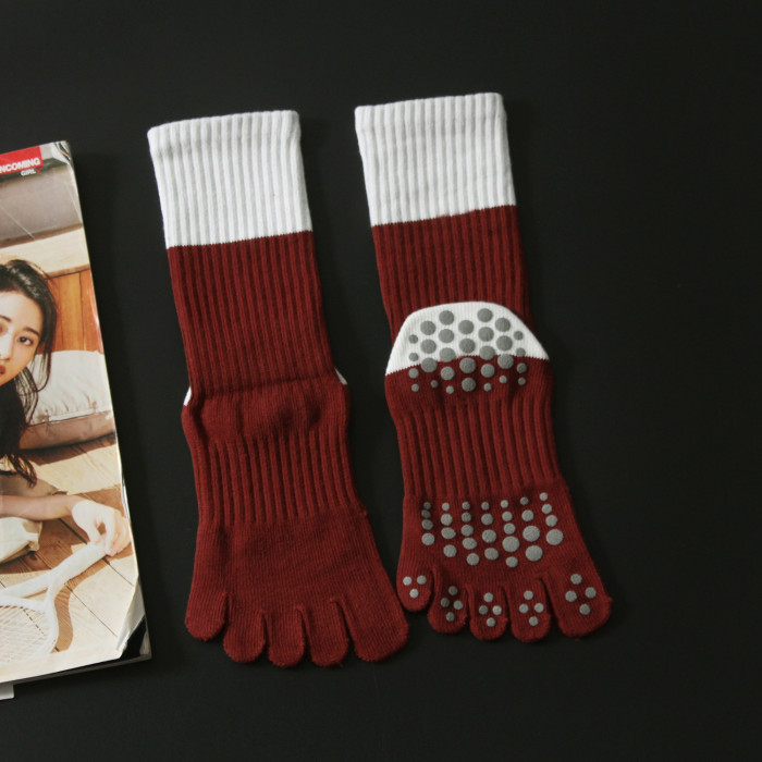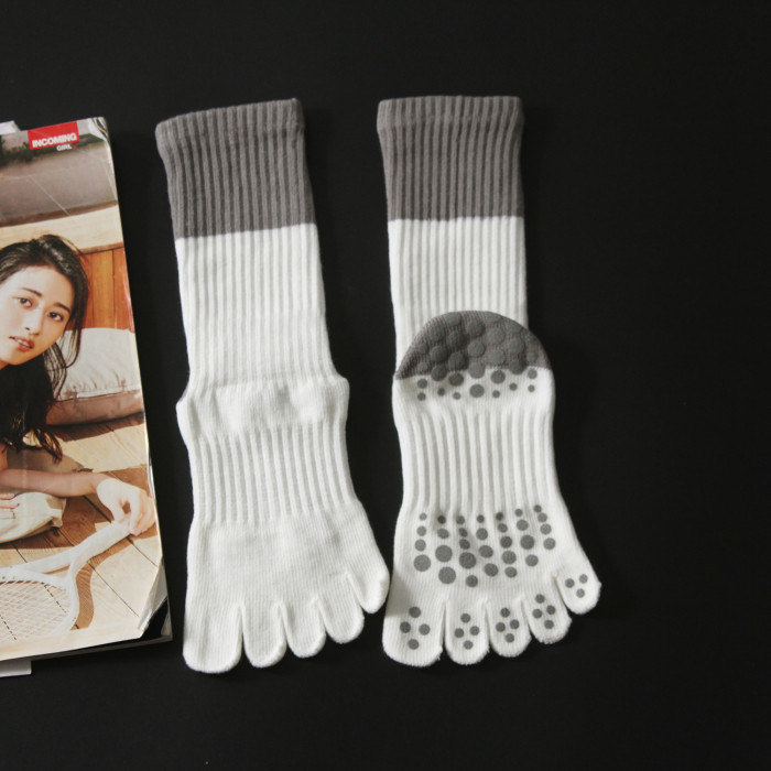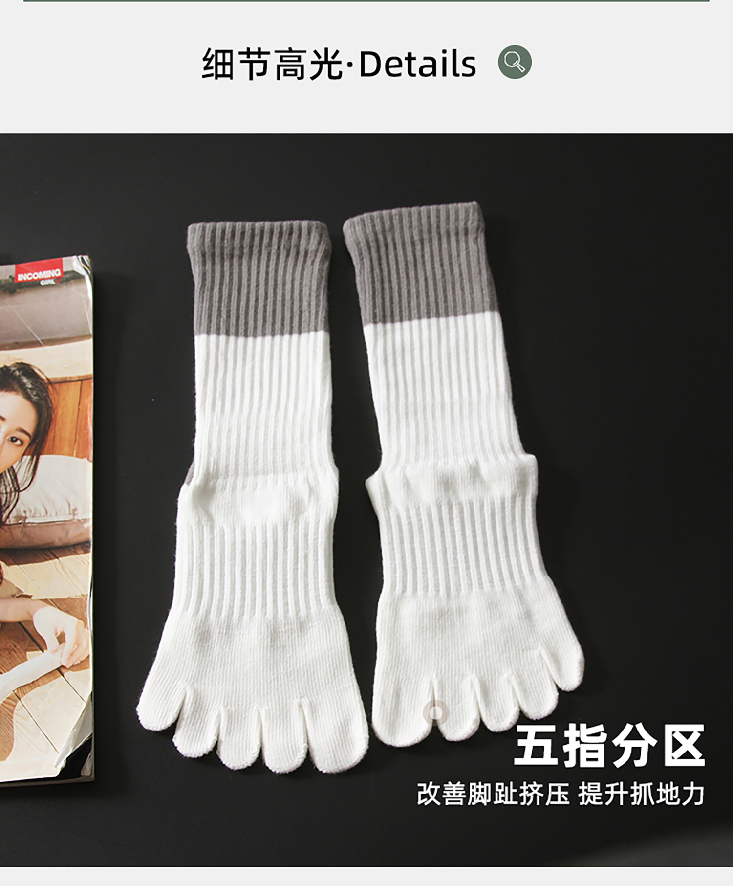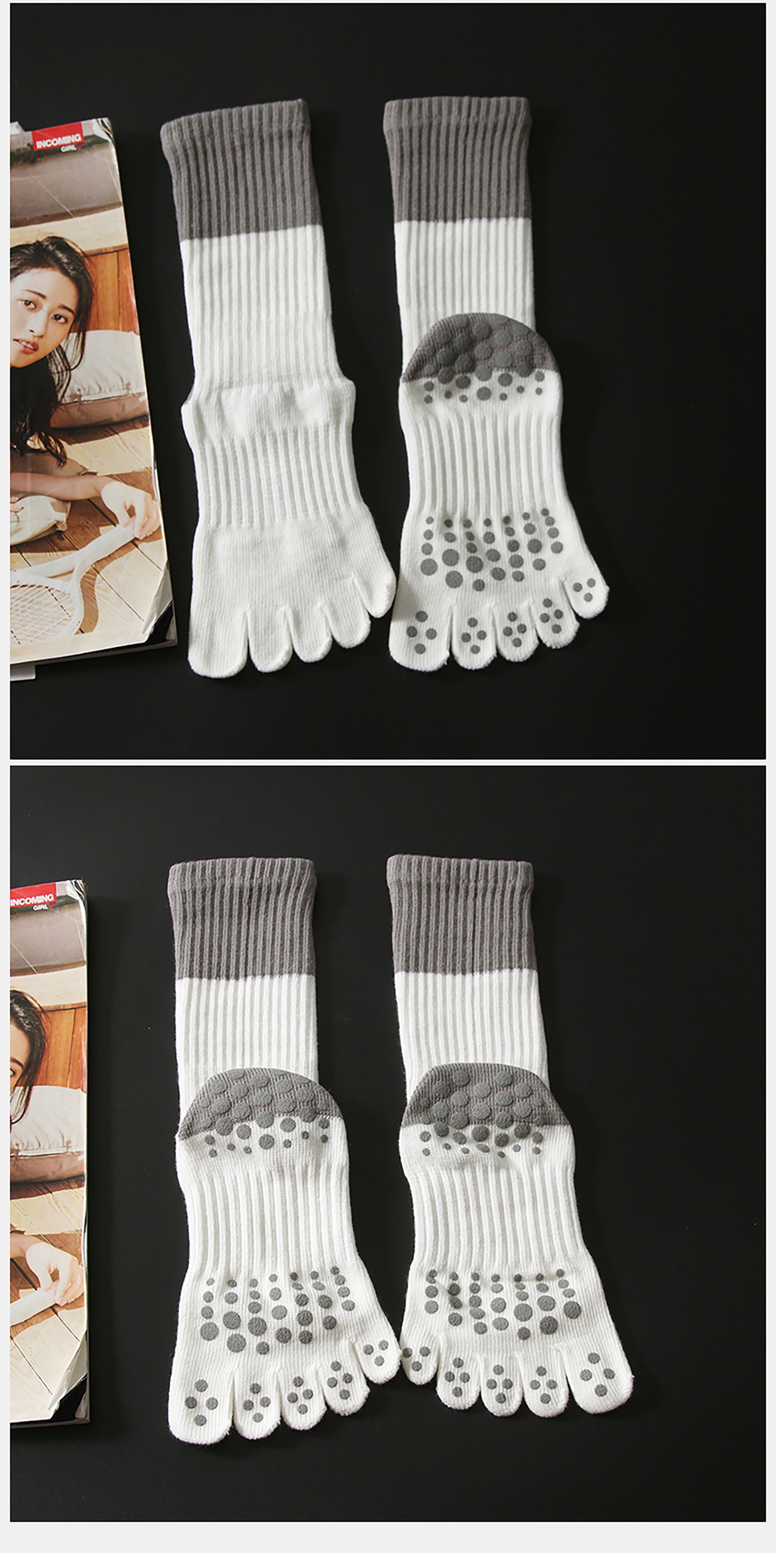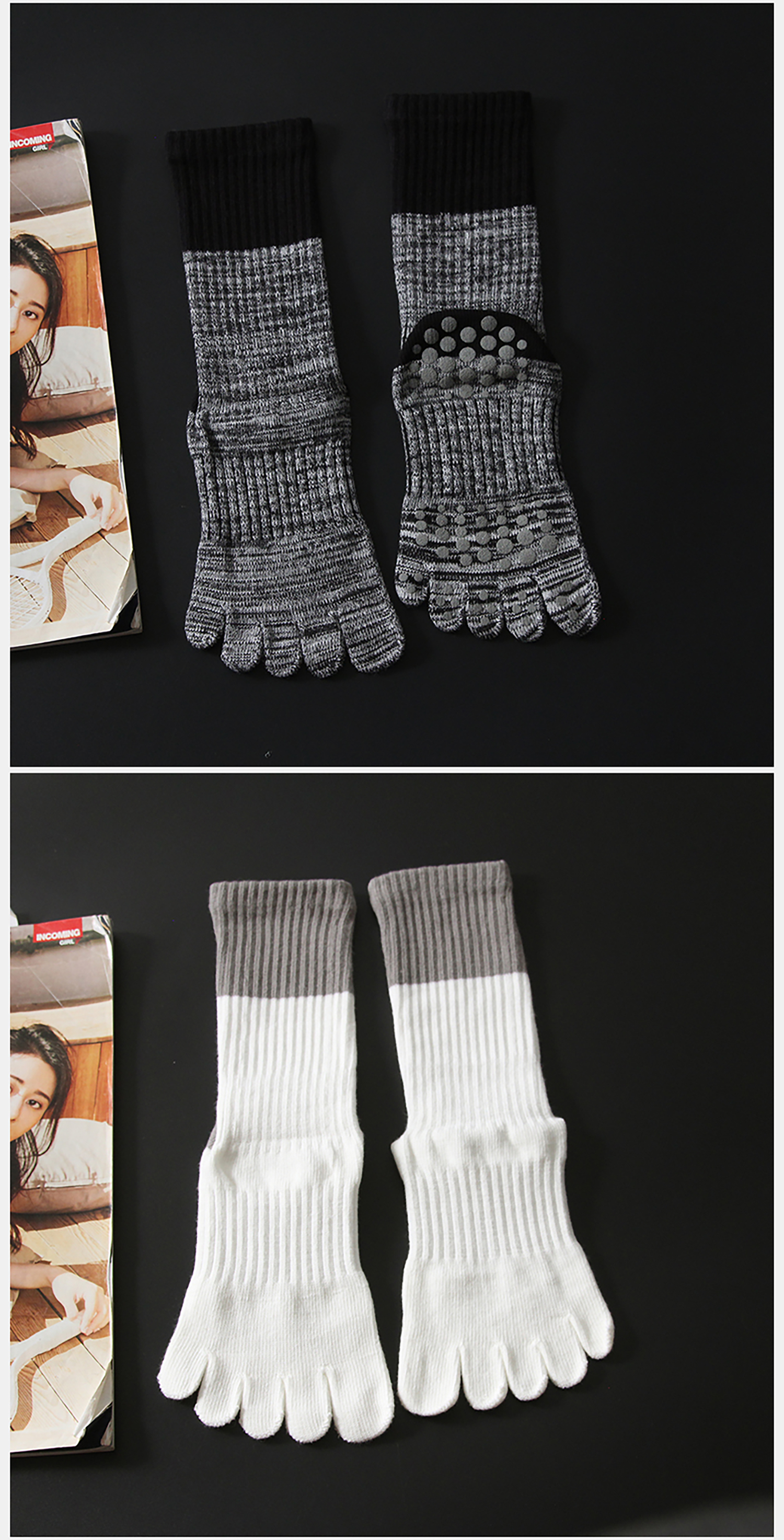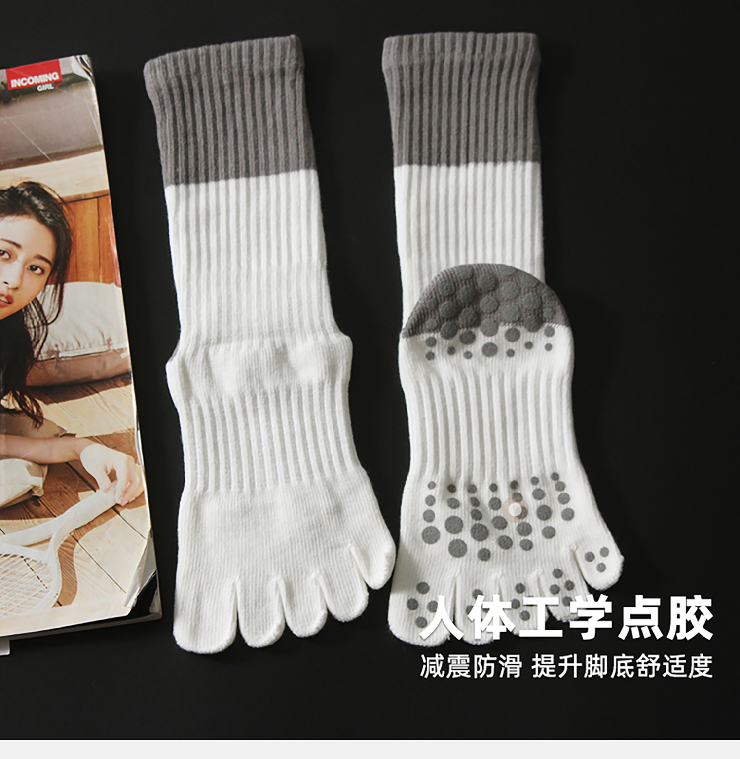 撞色羅紋防滑減震高彈棉質普拉提瑜珈五指中筒襪