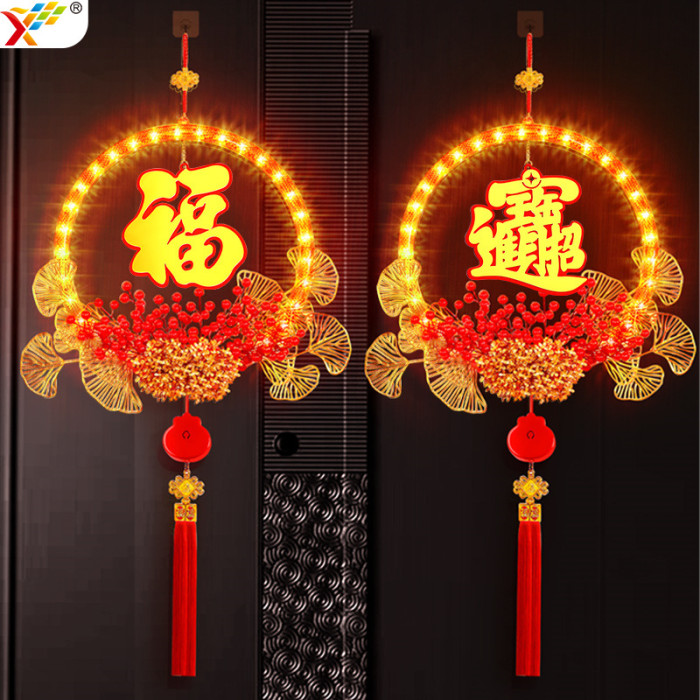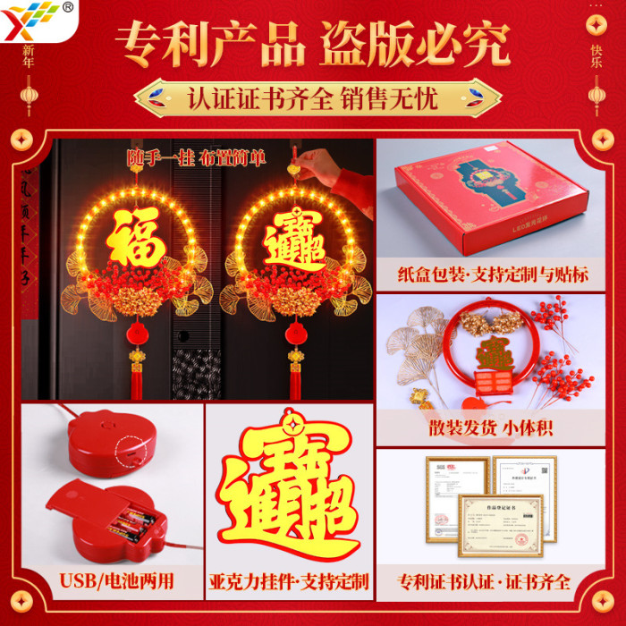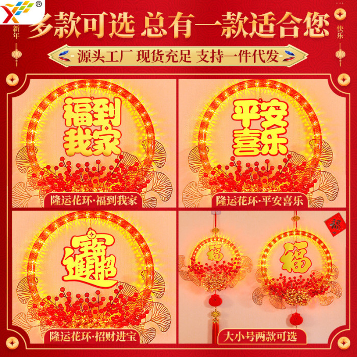 發光招財進寶花環LED彩燈掛件2026新年福字氛圍掛門上裝飾布置