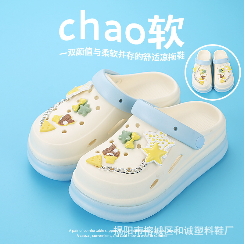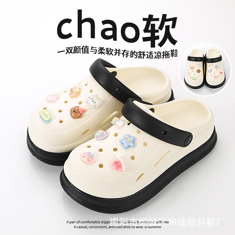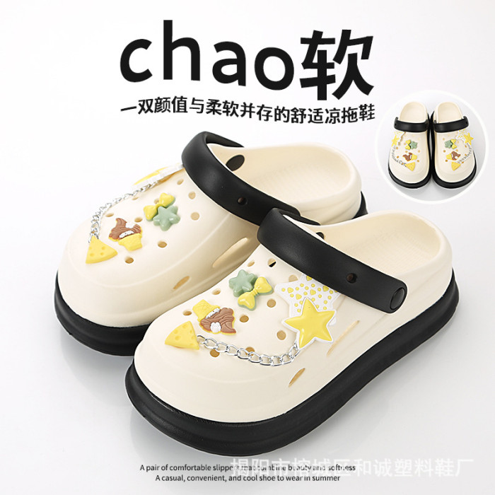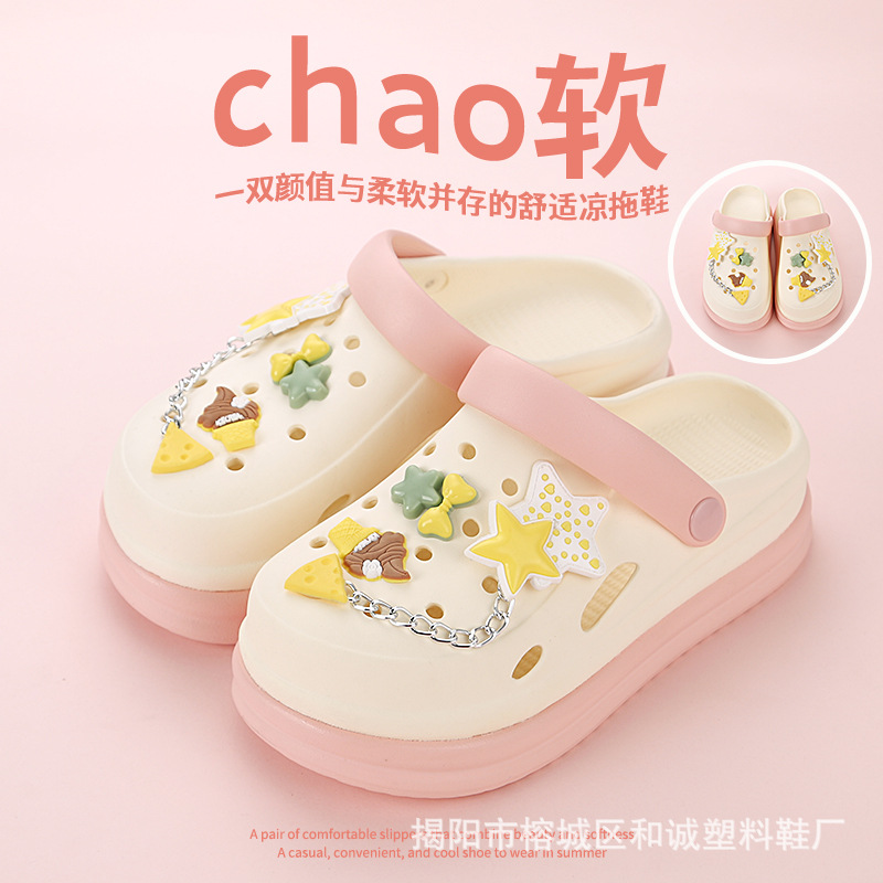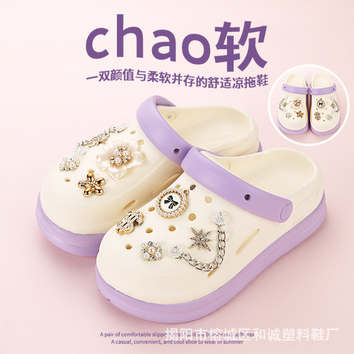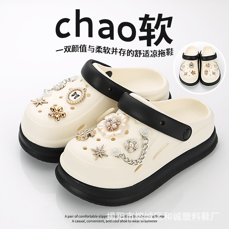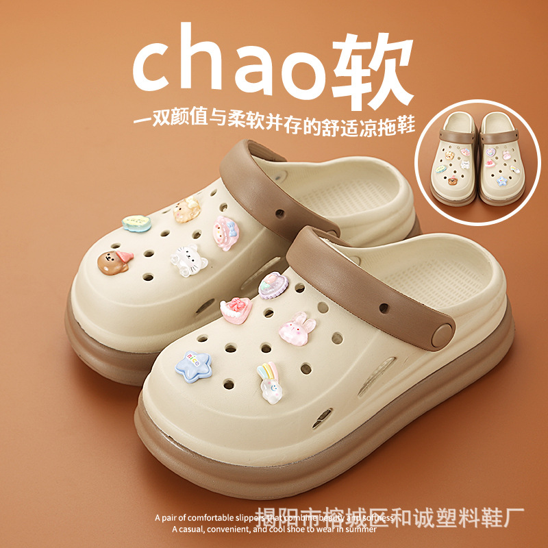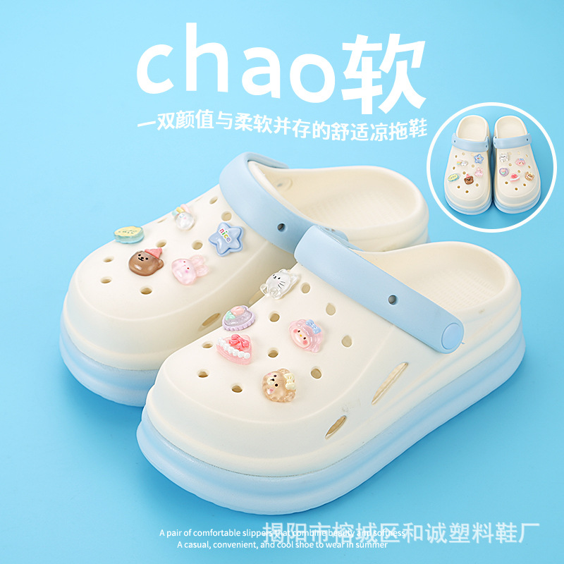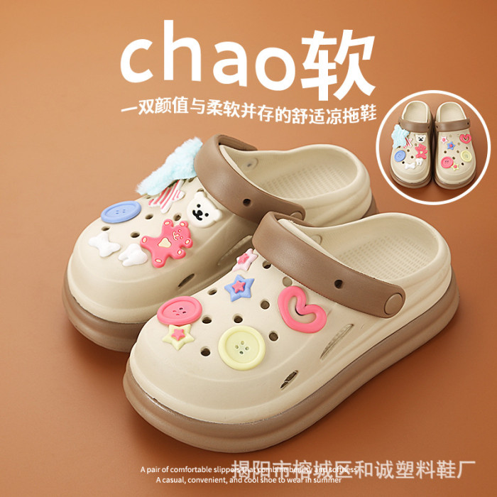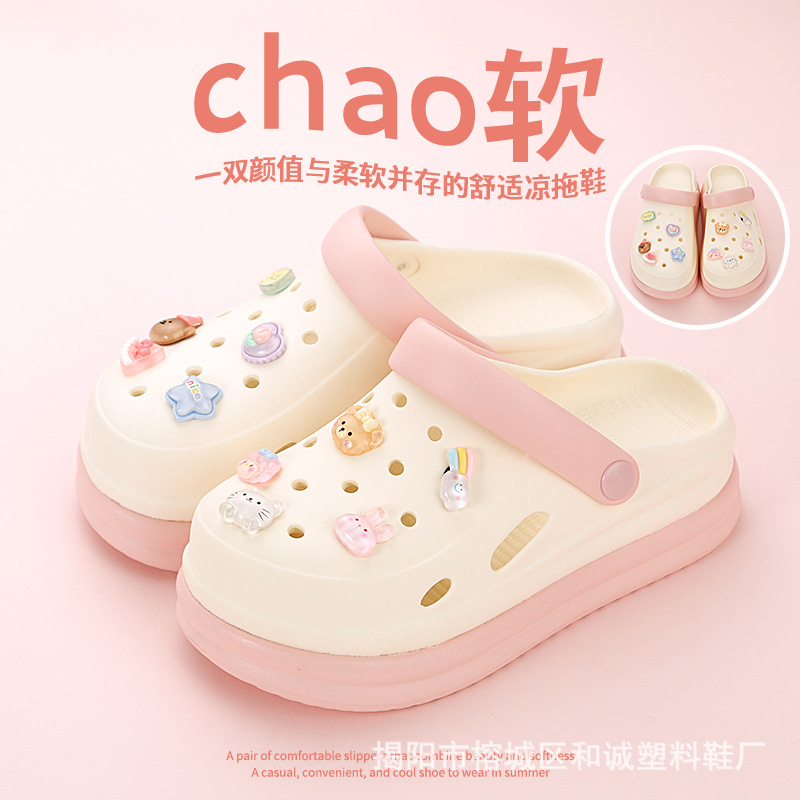 卡通可愛花朵配飾洞洞鞋女夏季外穿2025新款厚底增高包頭涼拖鞋