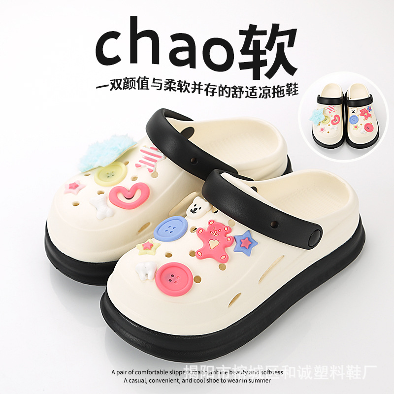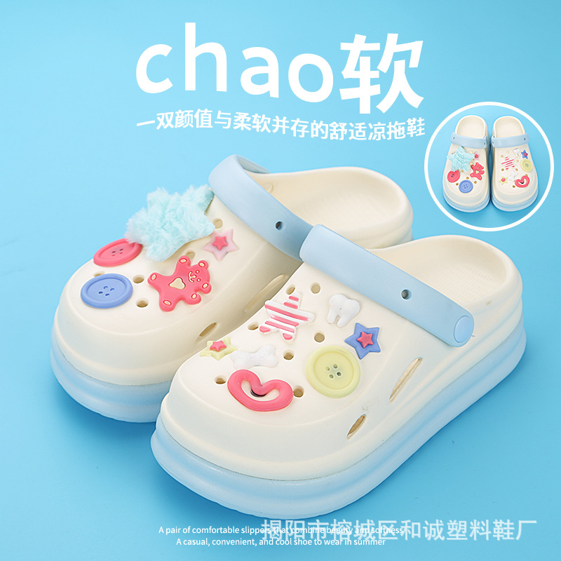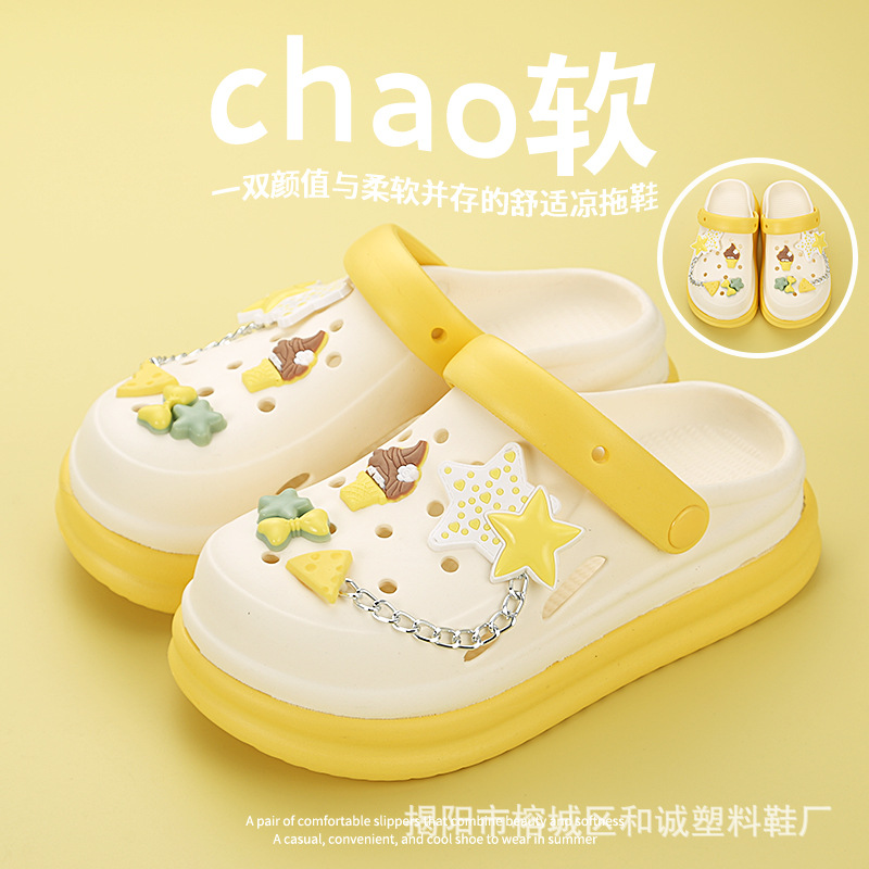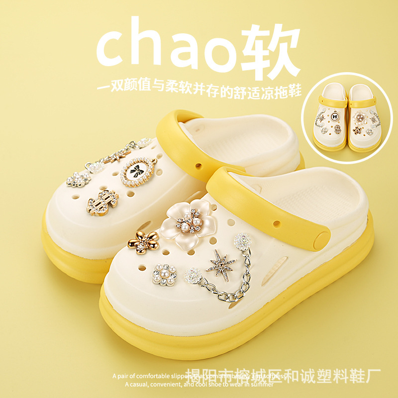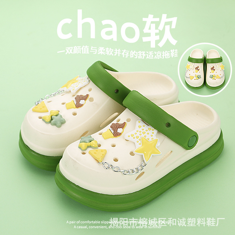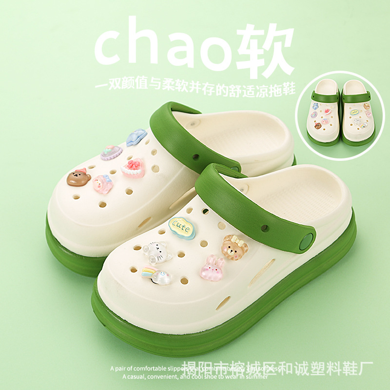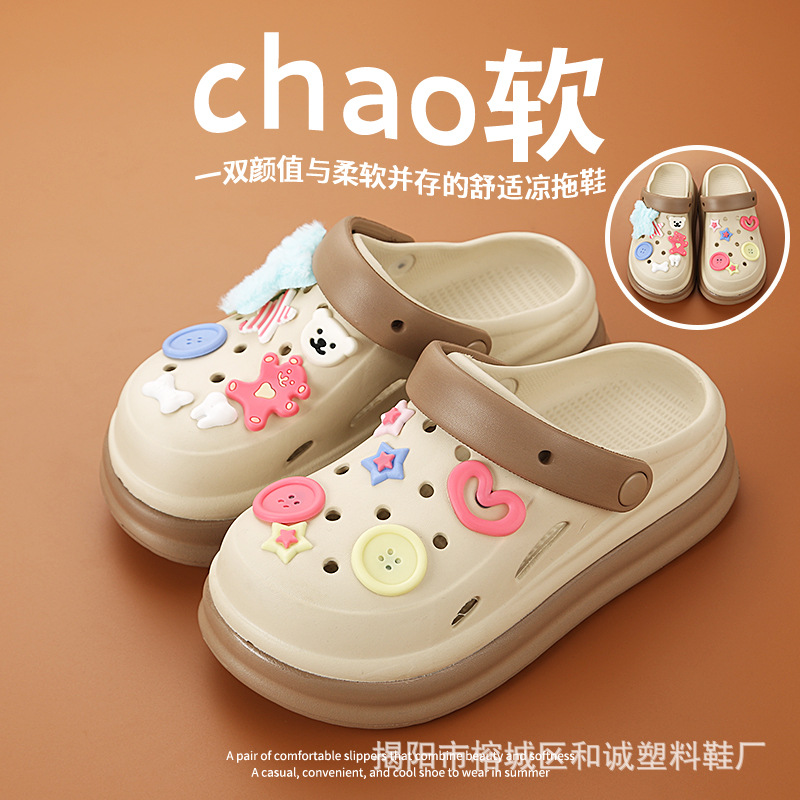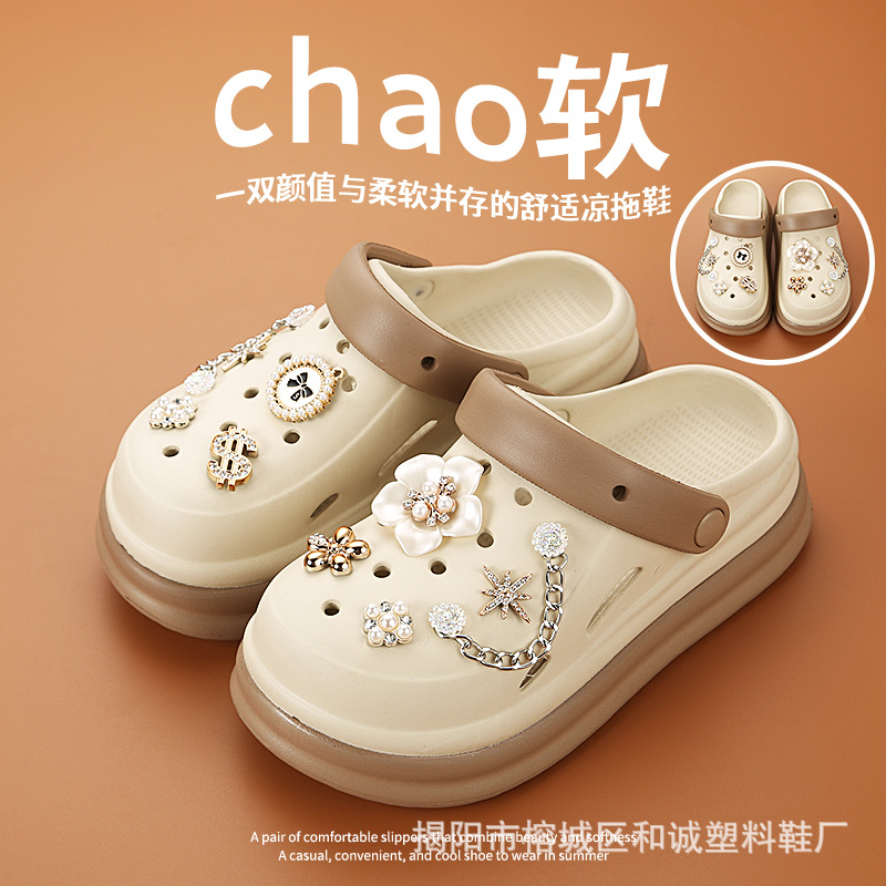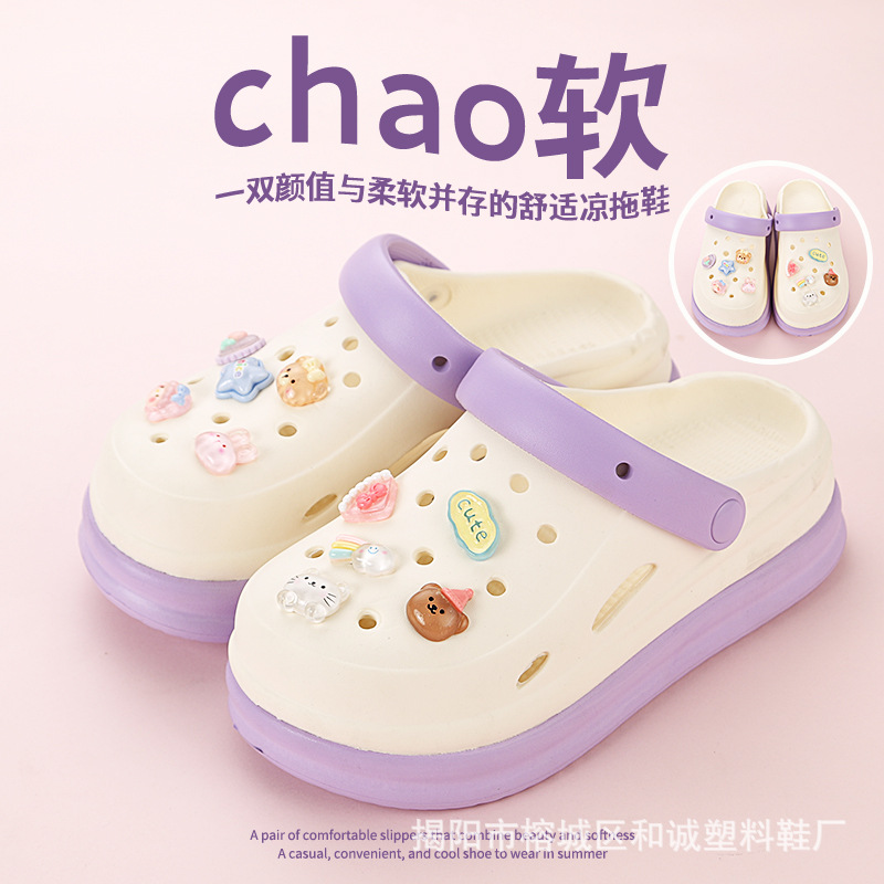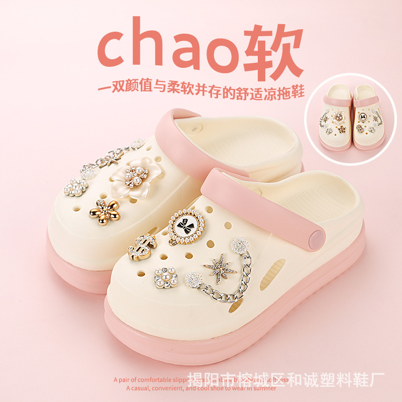 卡通可愛花朵配飾洞洞鞋女夏季外穿2025新款厚底增高包頭涼拖鞋