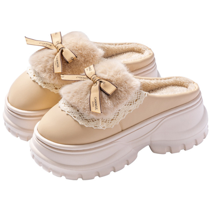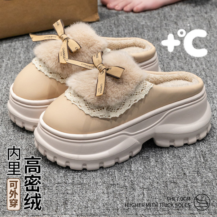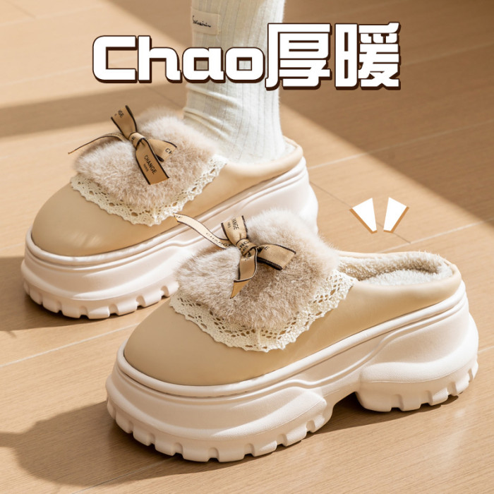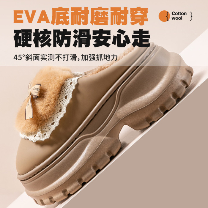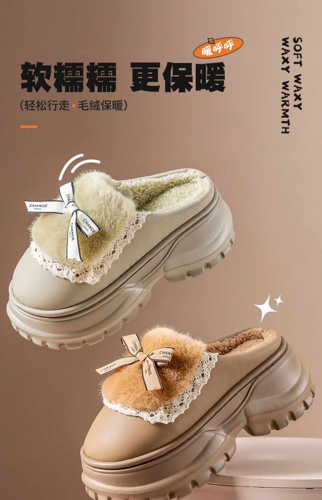 蝴蝶結棉拖鞋女秋冬季2024新款厚底踩屎感居家保暖毛毛絨防滑棉鞋