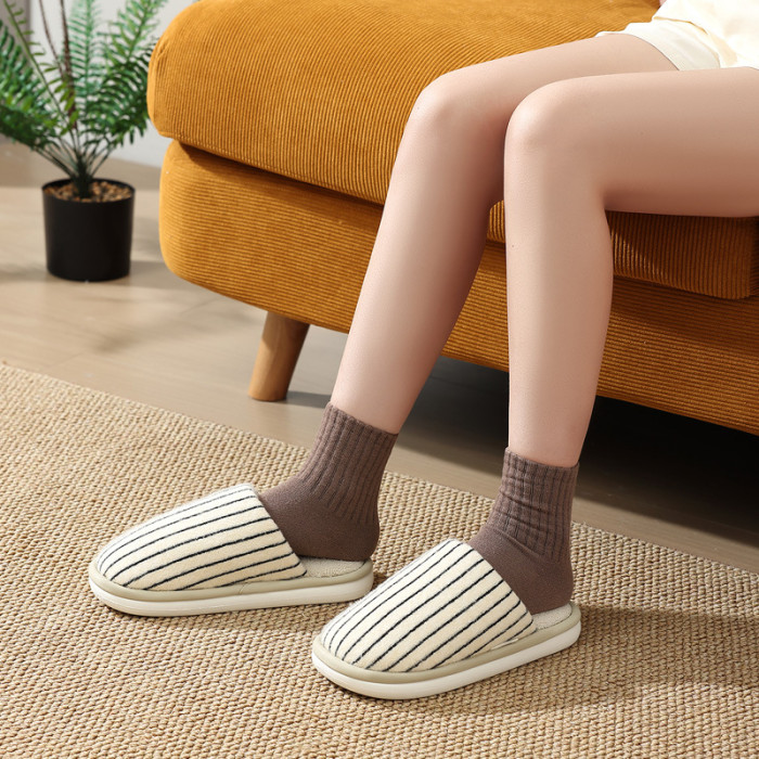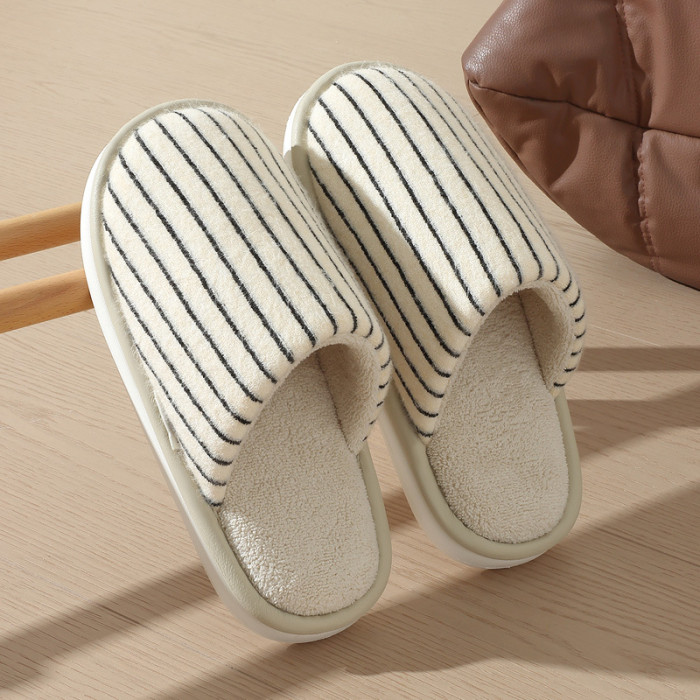 條紋棉拖鞋女秋冬季家居室內毛絨保暖情侶家用軟底防滑棉拖男