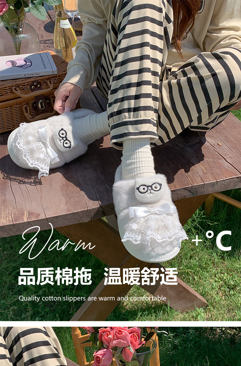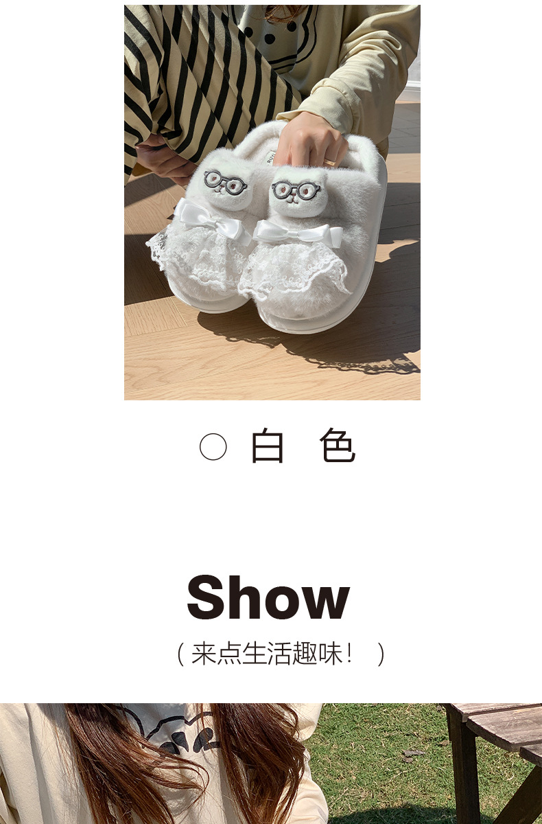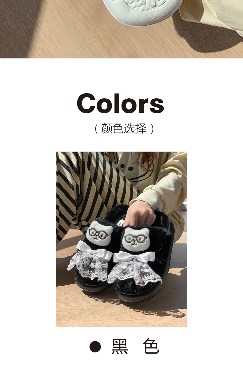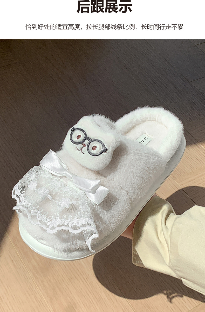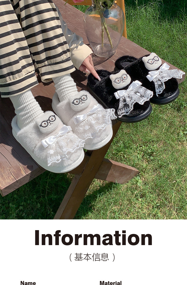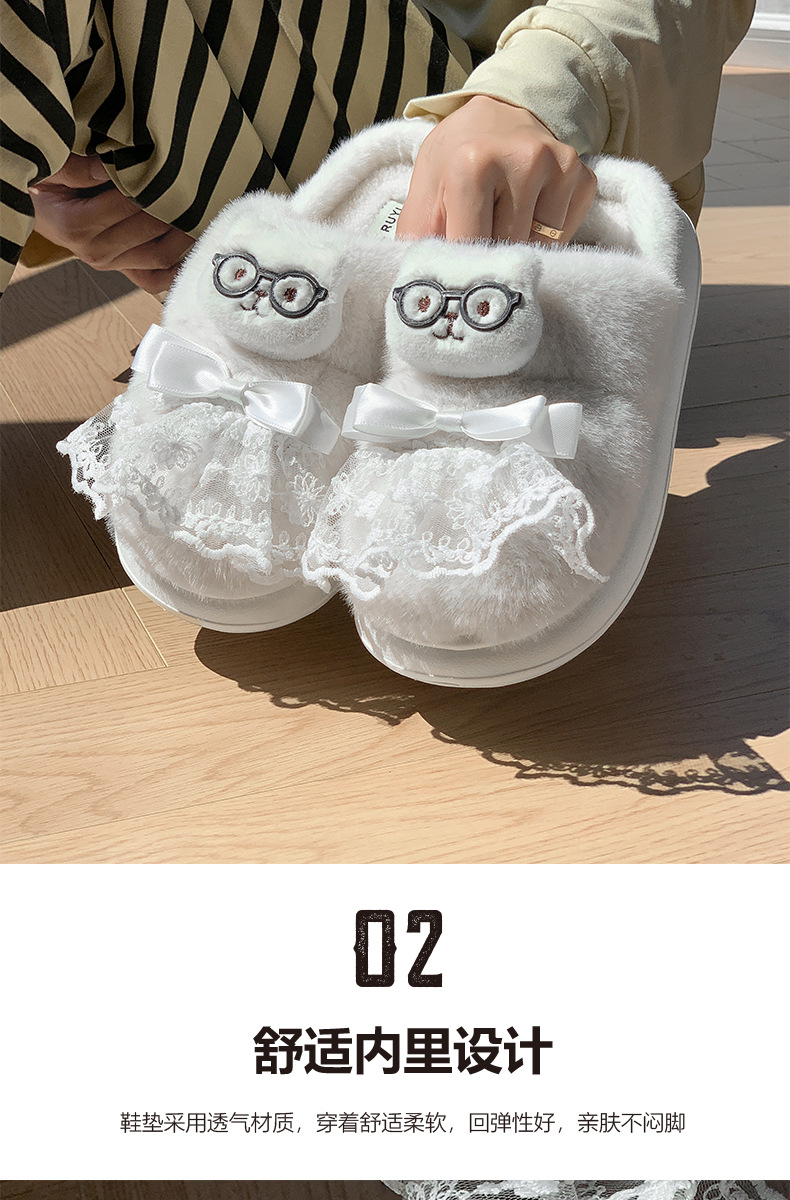 新款卡通保暖居家棉拖鞋蕾絲蝴蝶結冬季防滑輕盈柔軟毛絨情侶棉鞋