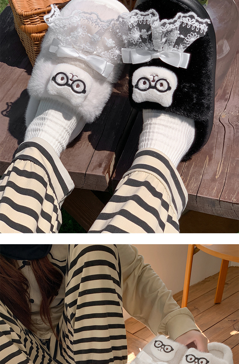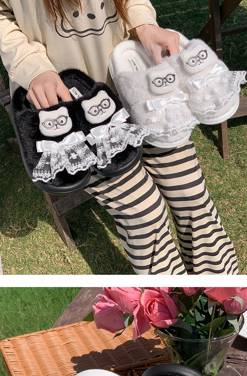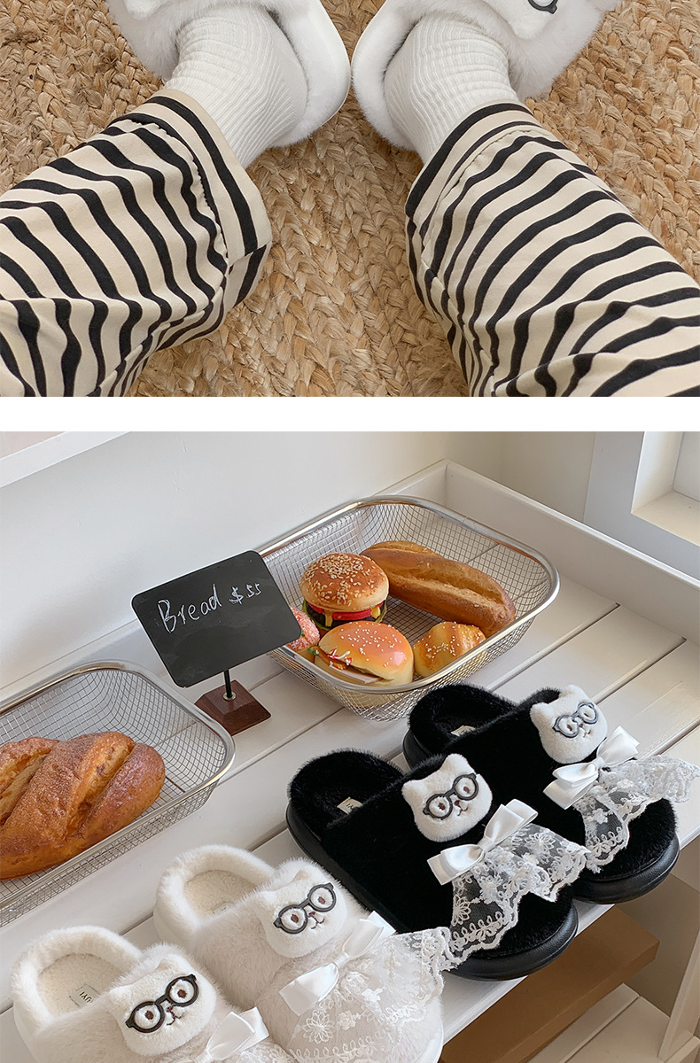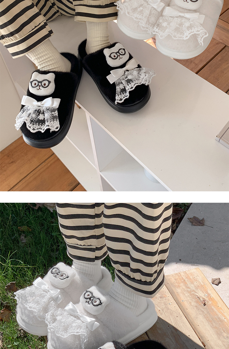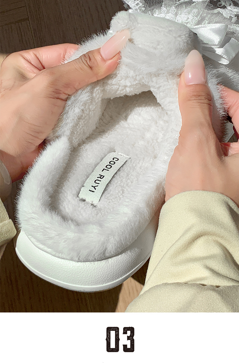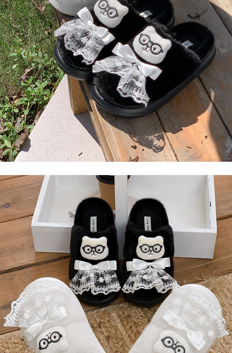 新款卡通保暖居家棉拖鞋蕾絲蝴蝶結冬季防滑輕盈柔軟毛絨情侶棉鞋