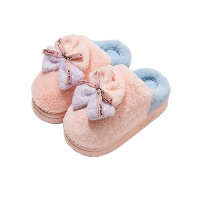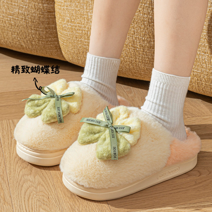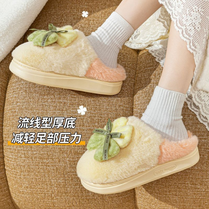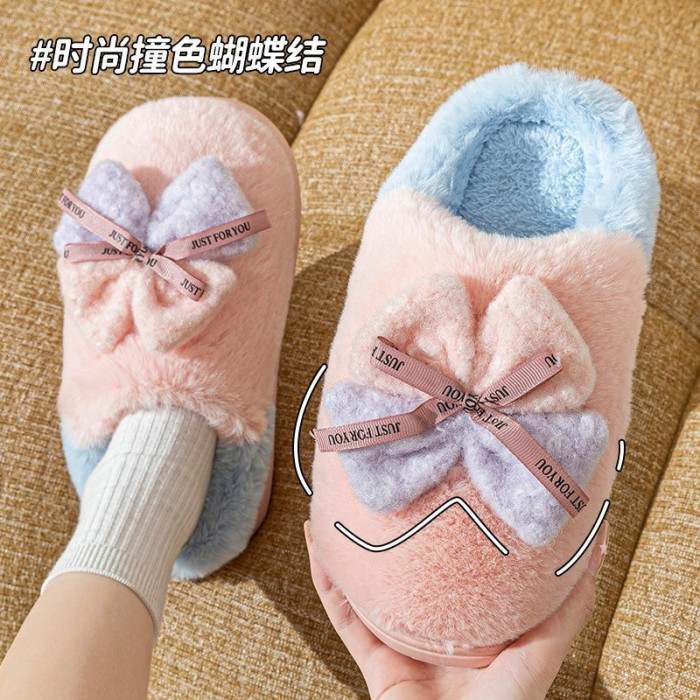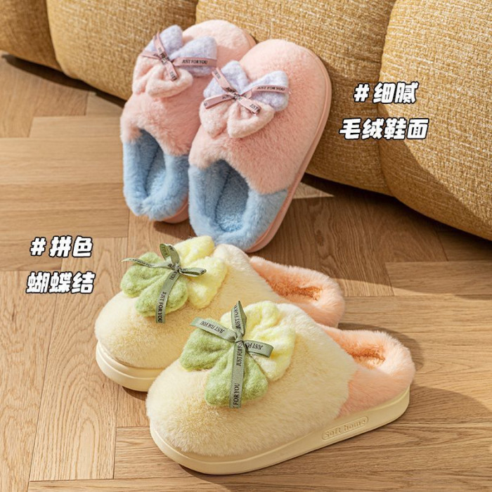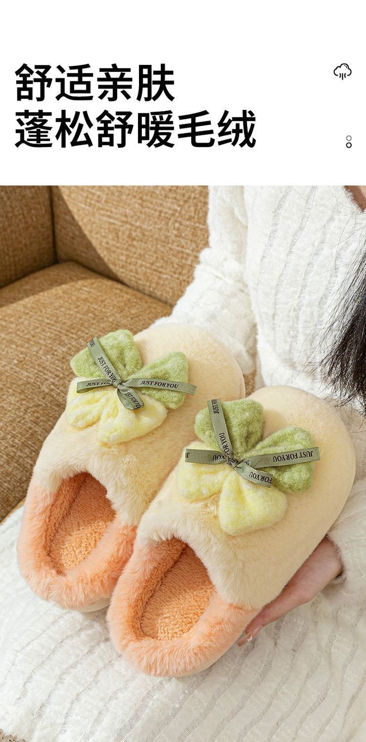 【抖音爆款】韓版厚底蝴蝶結毛茸茸棉拖鞋2025加絨厚底居家保暖