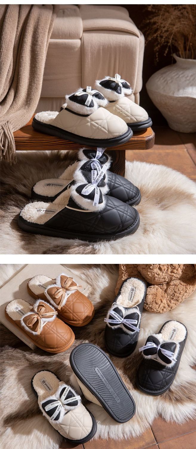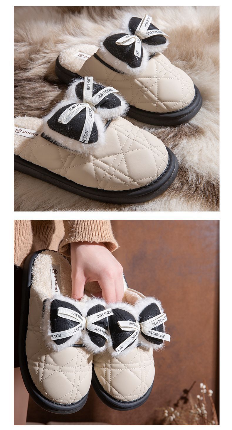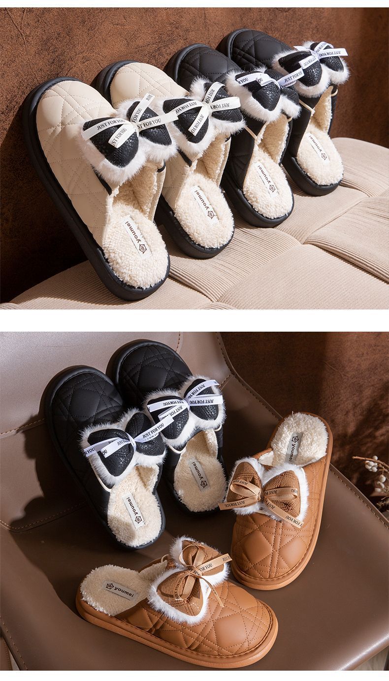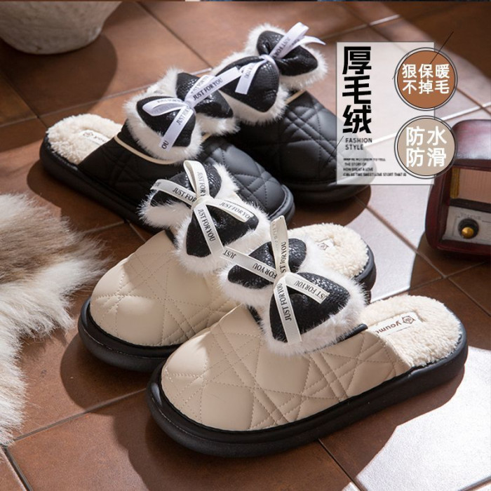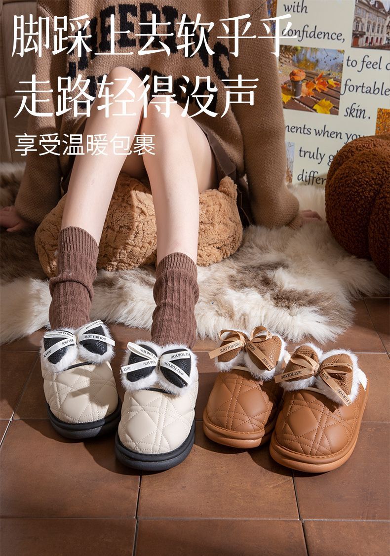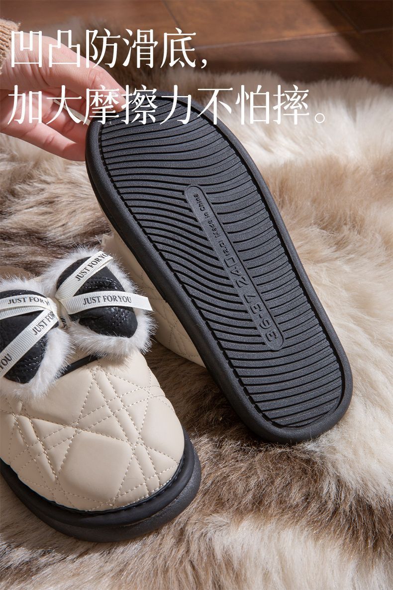 棉拖鞋女款冬季室內防水皮拖可愛蝴蝶結厚底保暖加絨外穿毛毛拖鞋
