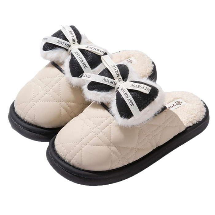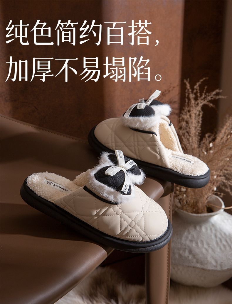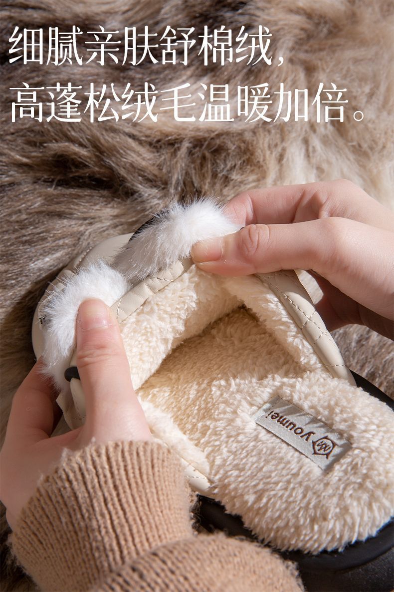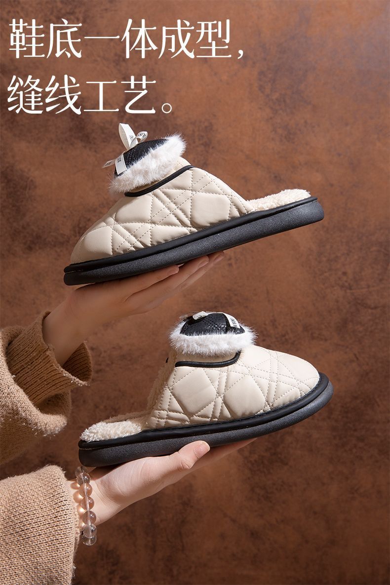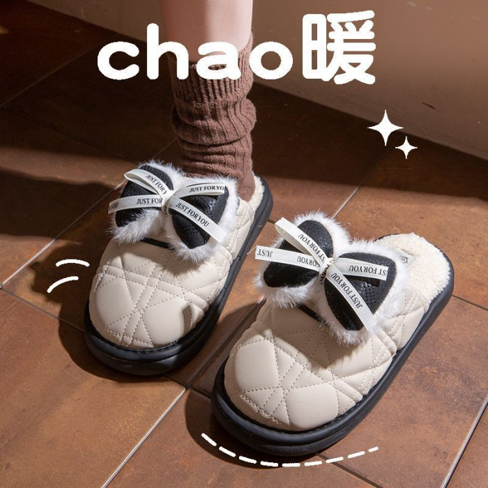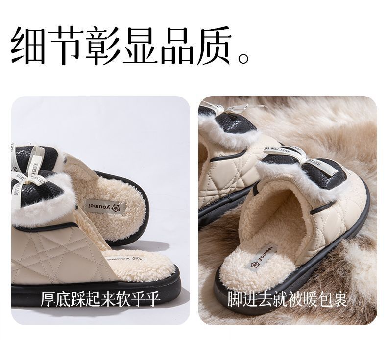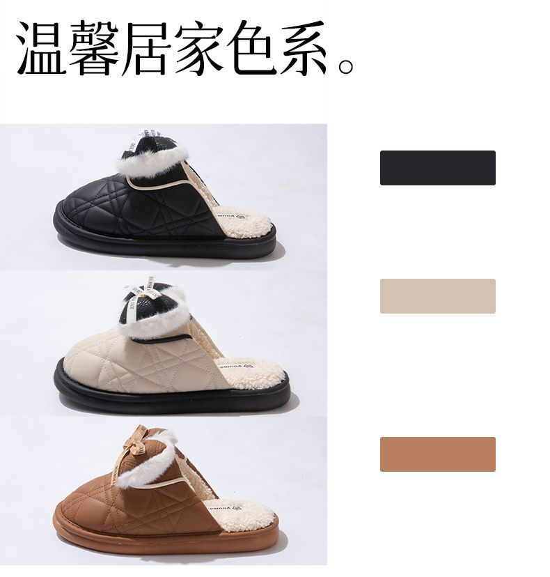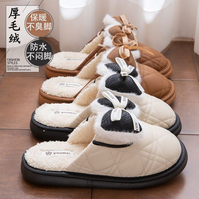 棉拖鞋女款冬季室內防水皮拖可愛蝴蝶結厚底保暖加絨外穿毛毛拖鞋